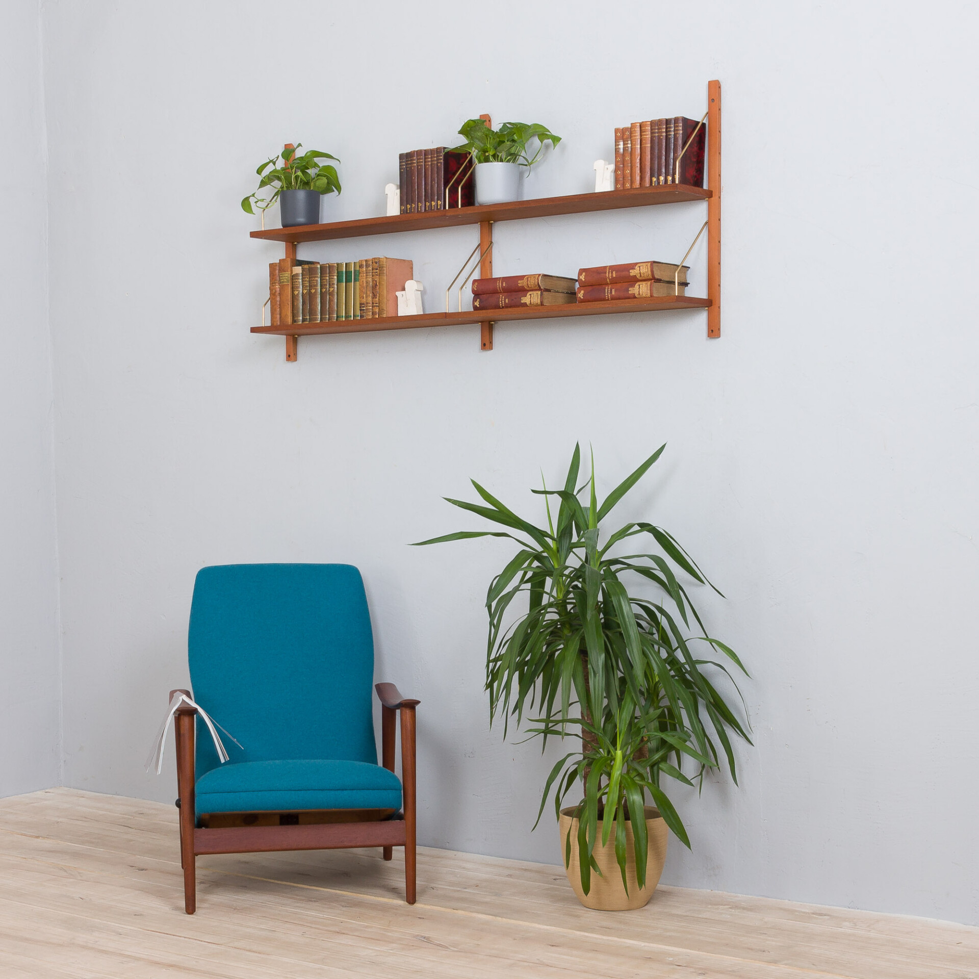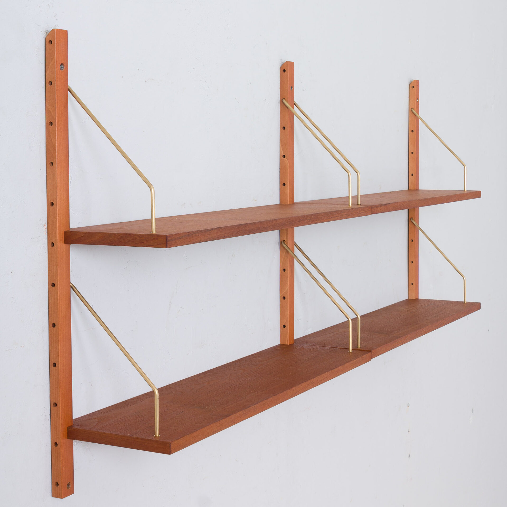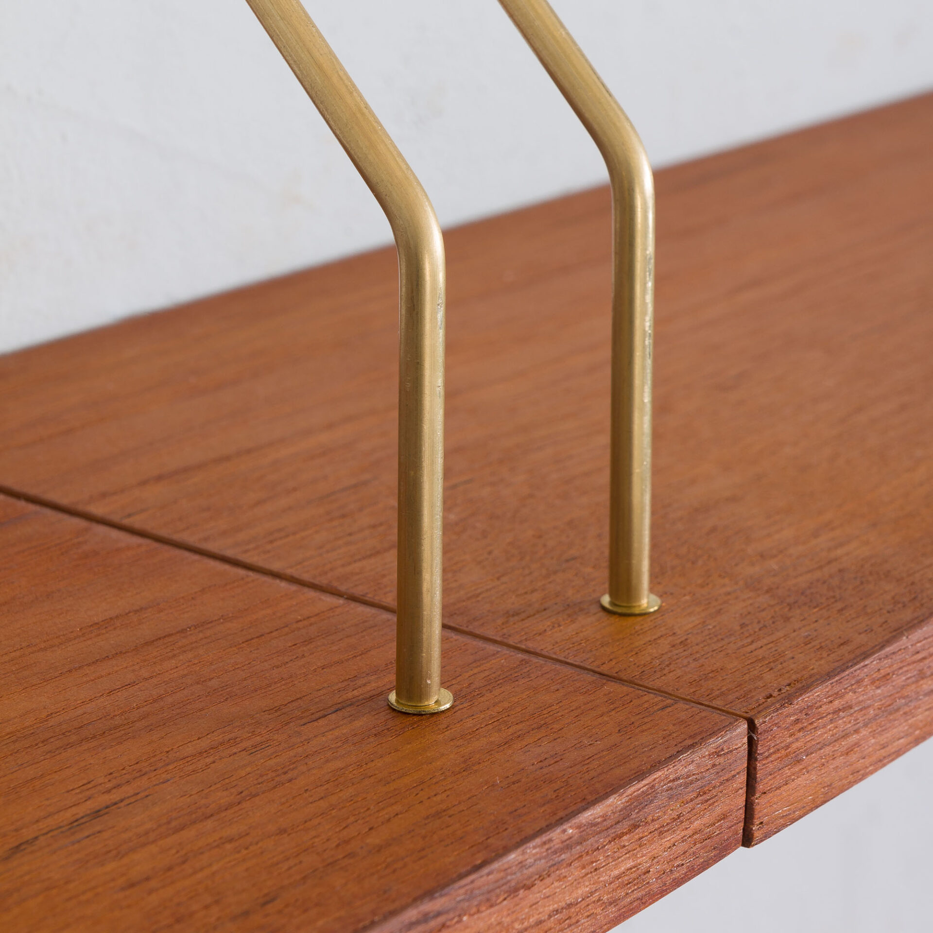 Duński regał ścienny w stylu Preben Sorensen, Cadovius (podobny system montażu i stolarka) z lat 60-tych. Jest to modułowy system z 4 półkami z drewna tekowego, który można dowolnie aranżować. Zestaw składa się z: