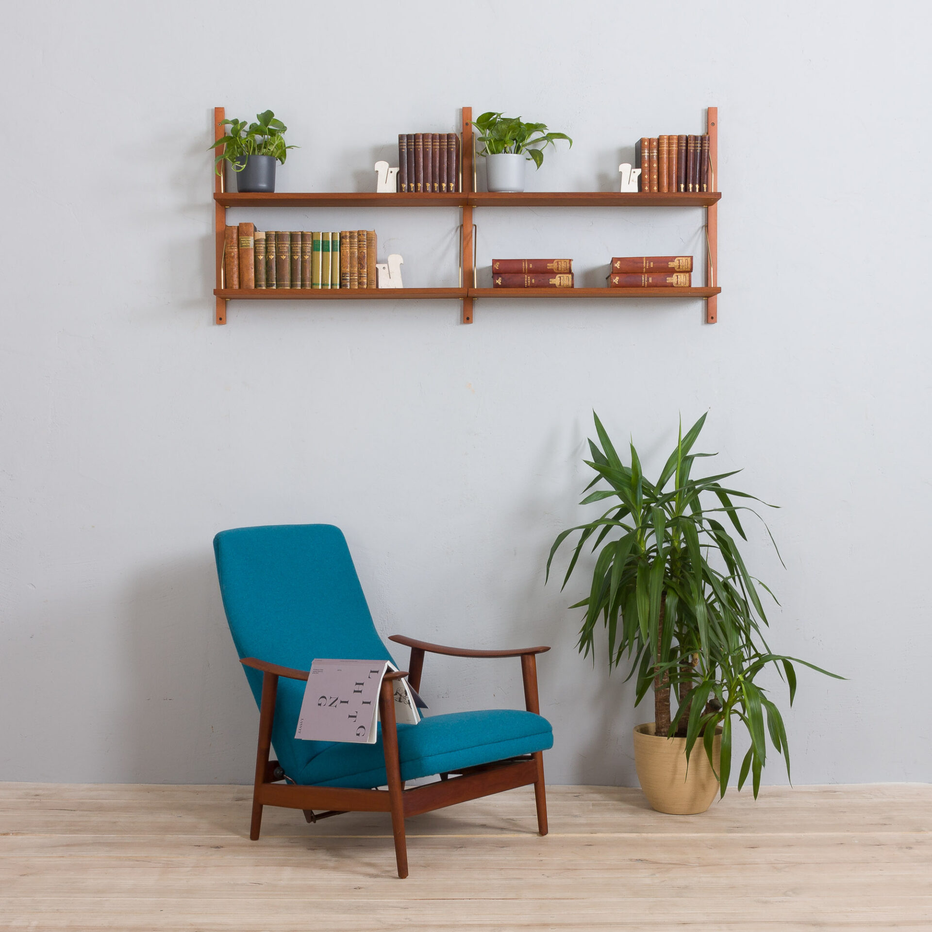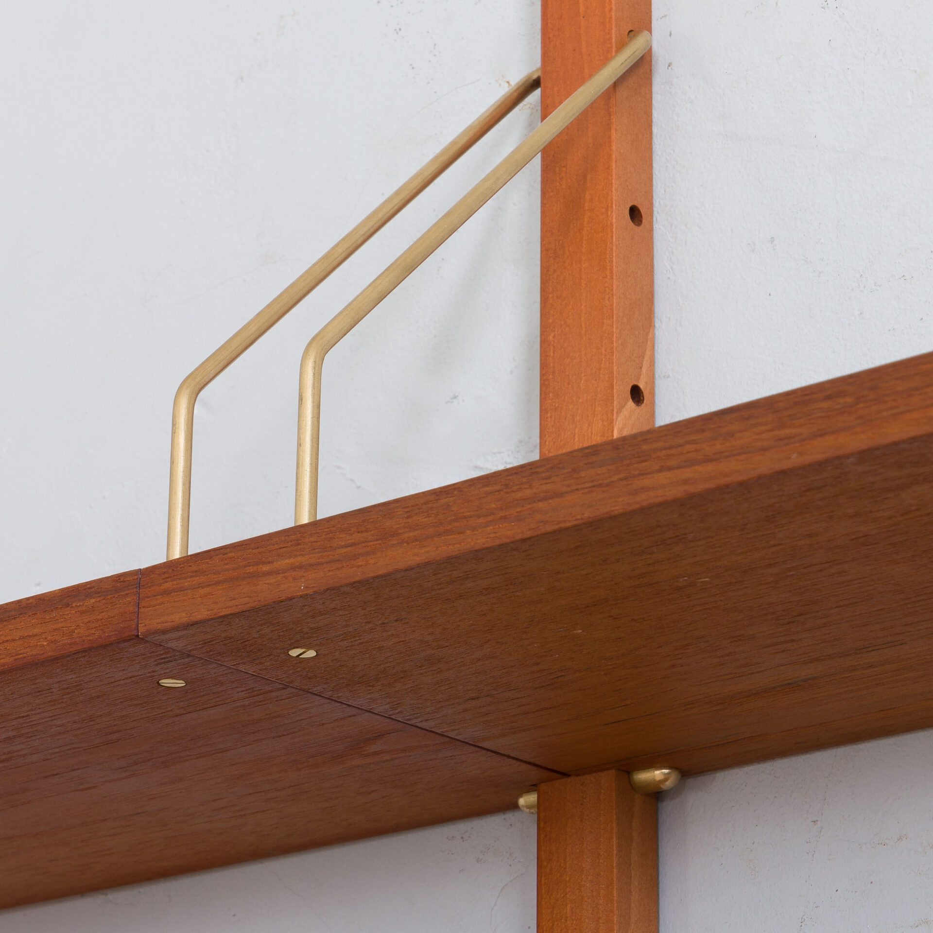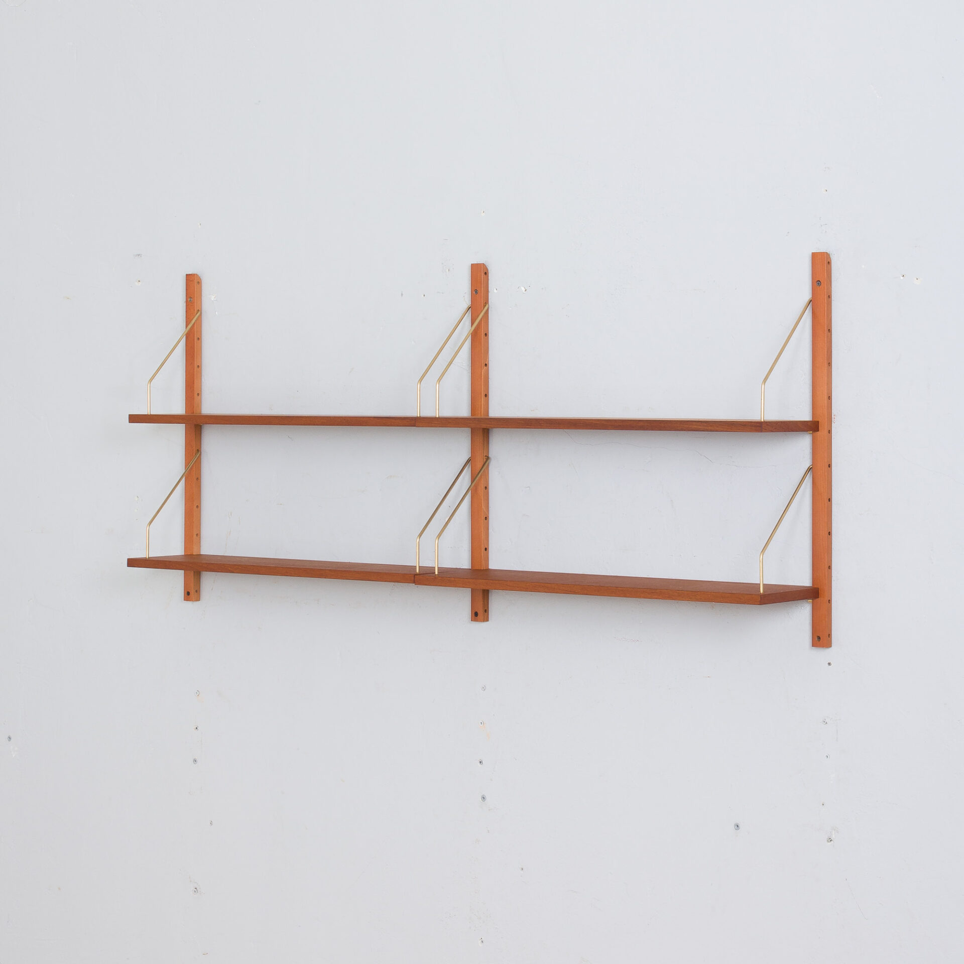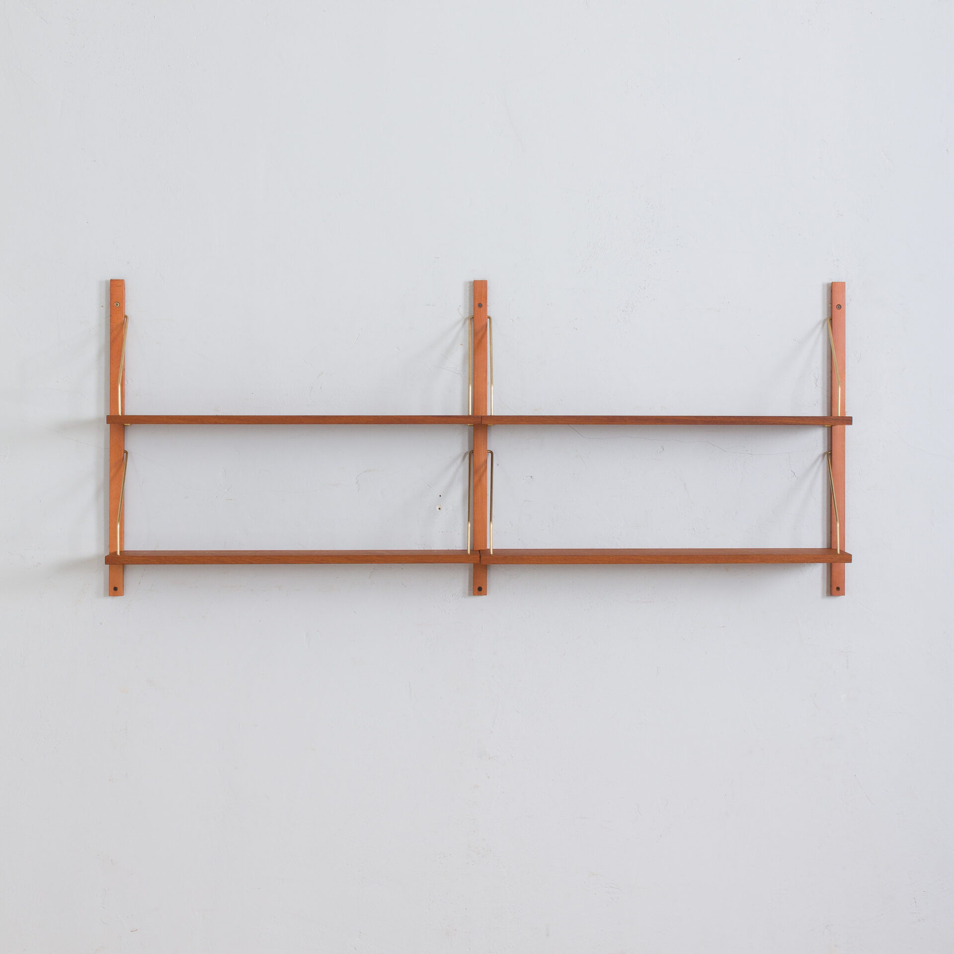 Duński regał ścienny w stylu Preben Sorensen, Cadovius (podobny system montażu i stolarka) z lat 60-tych. Jest to modułowy system z 4 półkami z drewna tekowego, który można dowolnie aranżować. Zestaw składa się z:
