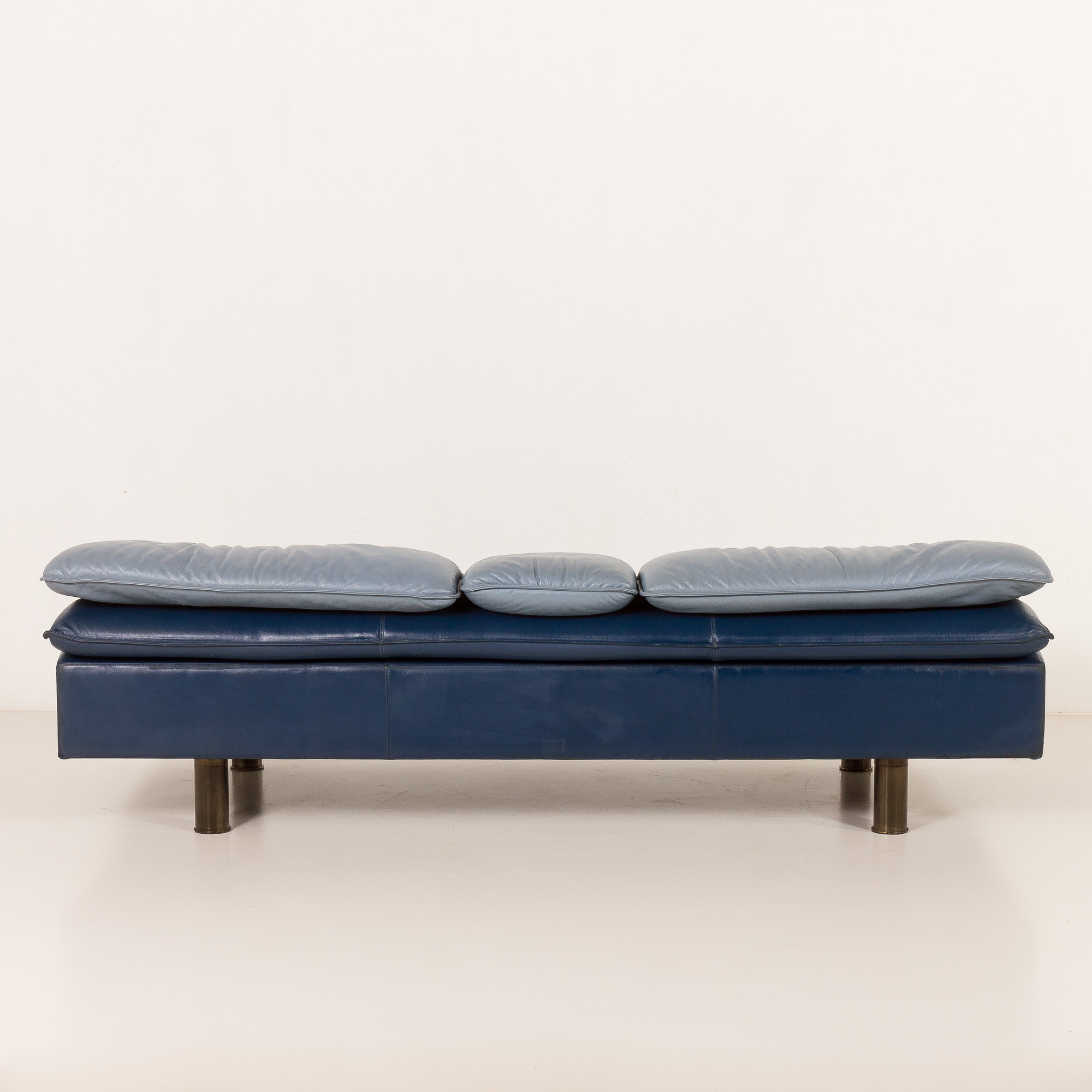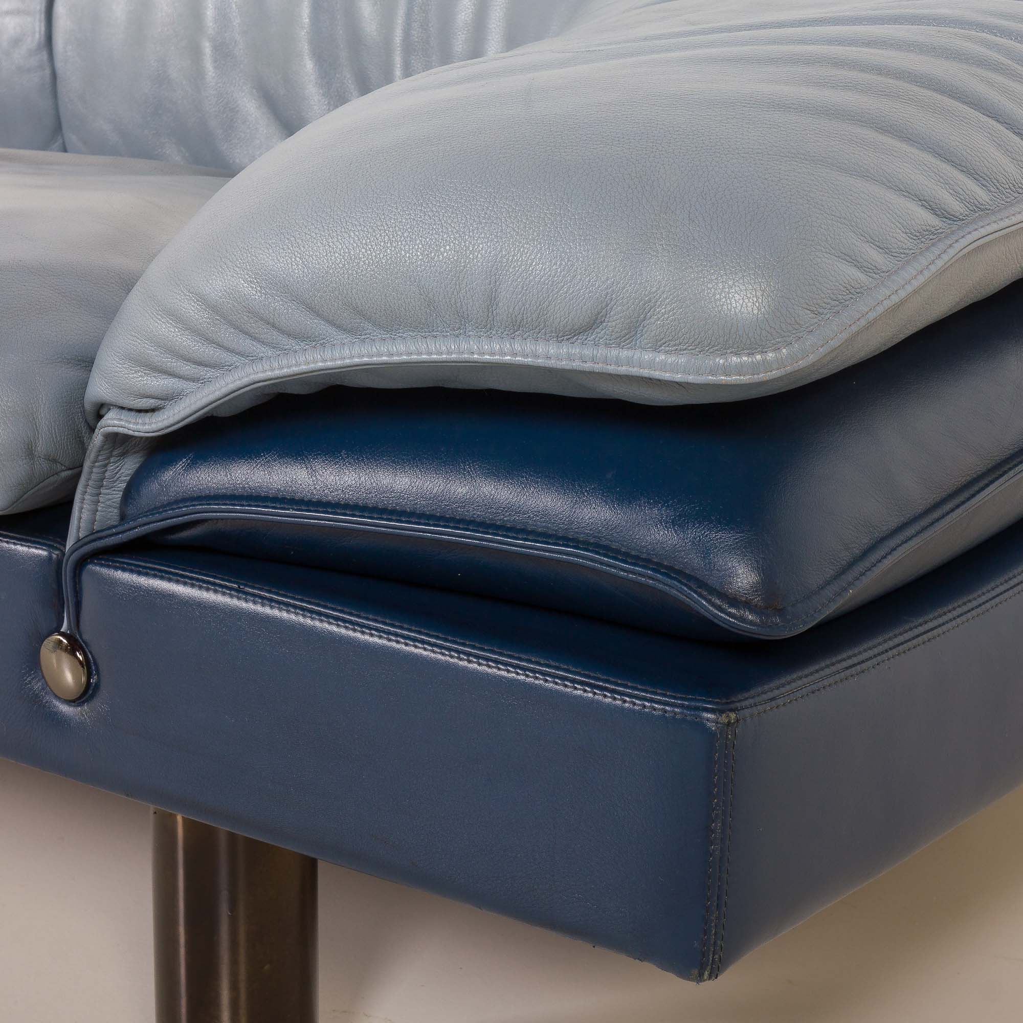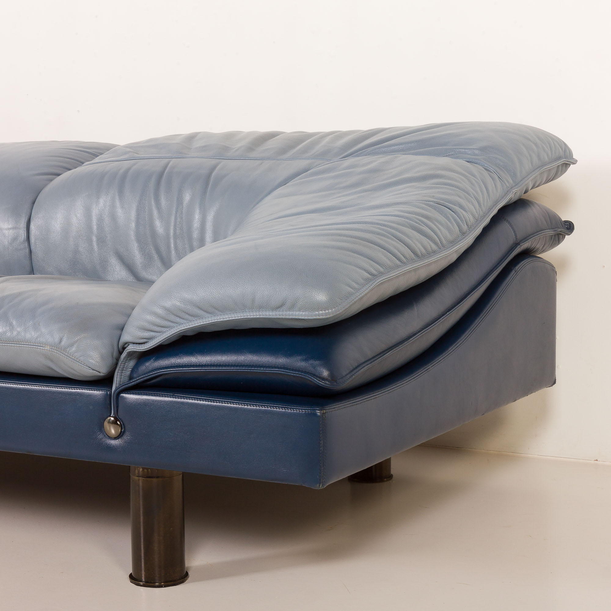 Uderzająco piękna włoska skórzana sofa vintage Space Age, wyprodukowana przez Poltrona Frau, najprawdopodobniej pod koniec lat 80. lub na początku lat 90., prezentuje śmiały, a zarazem wyrafinowany charakter włoskiego wzornictwa z tamtej epoki. Sofa charakteryzuje się charakterystyczną niebieską skórzaną tapicerką, łączącą pokaźne rozmiary z artystyczną, smukłą formą. Od końca lat 60. Poltrona Frau słynie z mebli najwyższej jakości i współpracowała z wieloma projektantami, takimi jak Pierluigi Cerri i Tito Agnoli. Uważamy, że ta konkretna sofa została zaprojektowana przez tego ostatniego. Pierluigi Cerri and Tito Agnoli. We believe this particular one is designed by the last one.