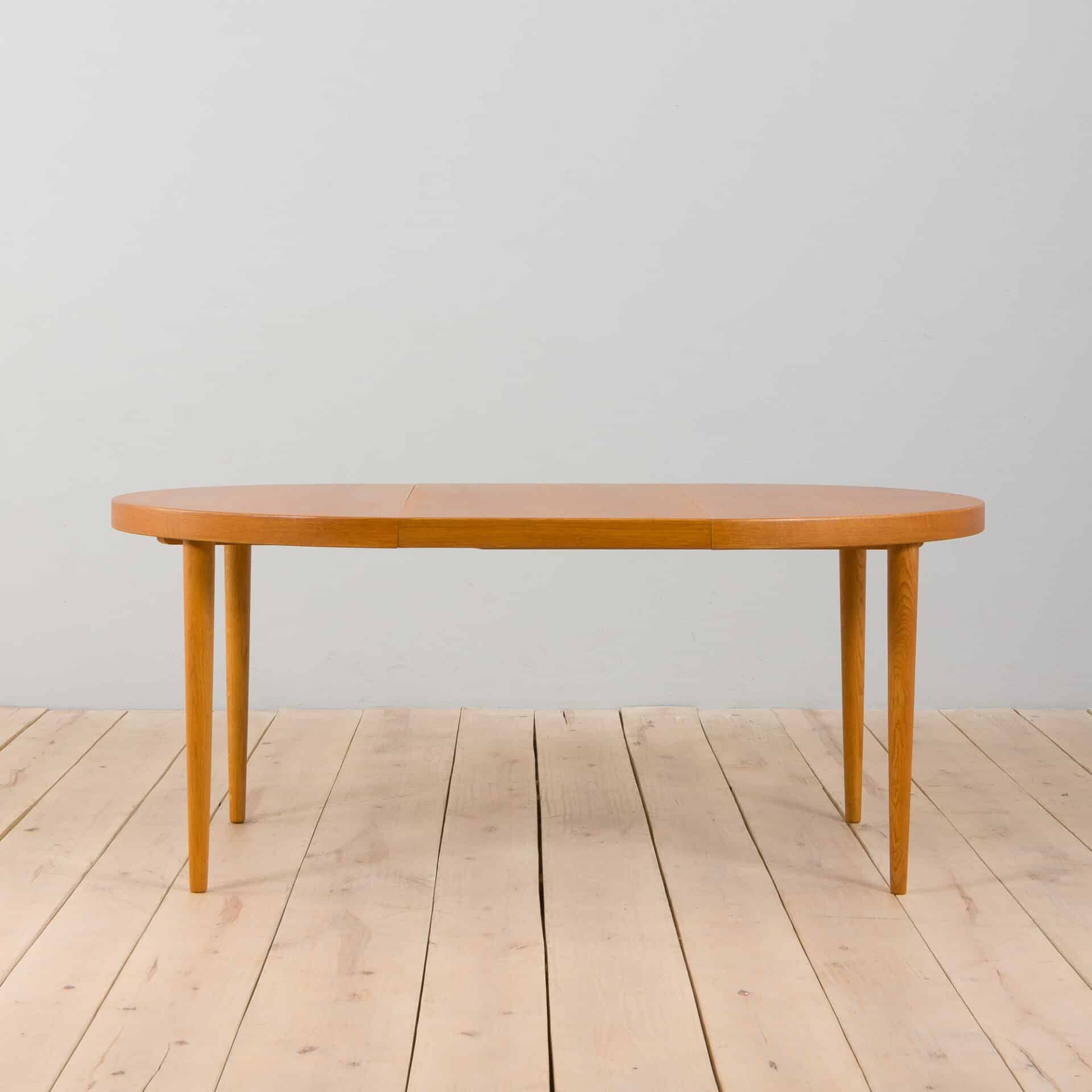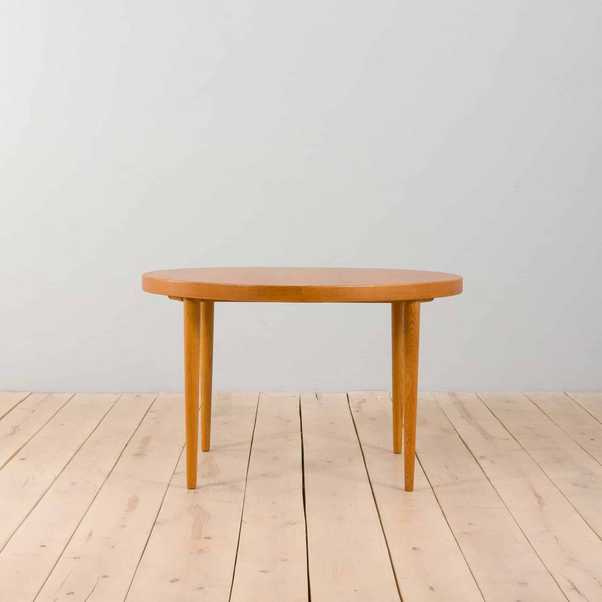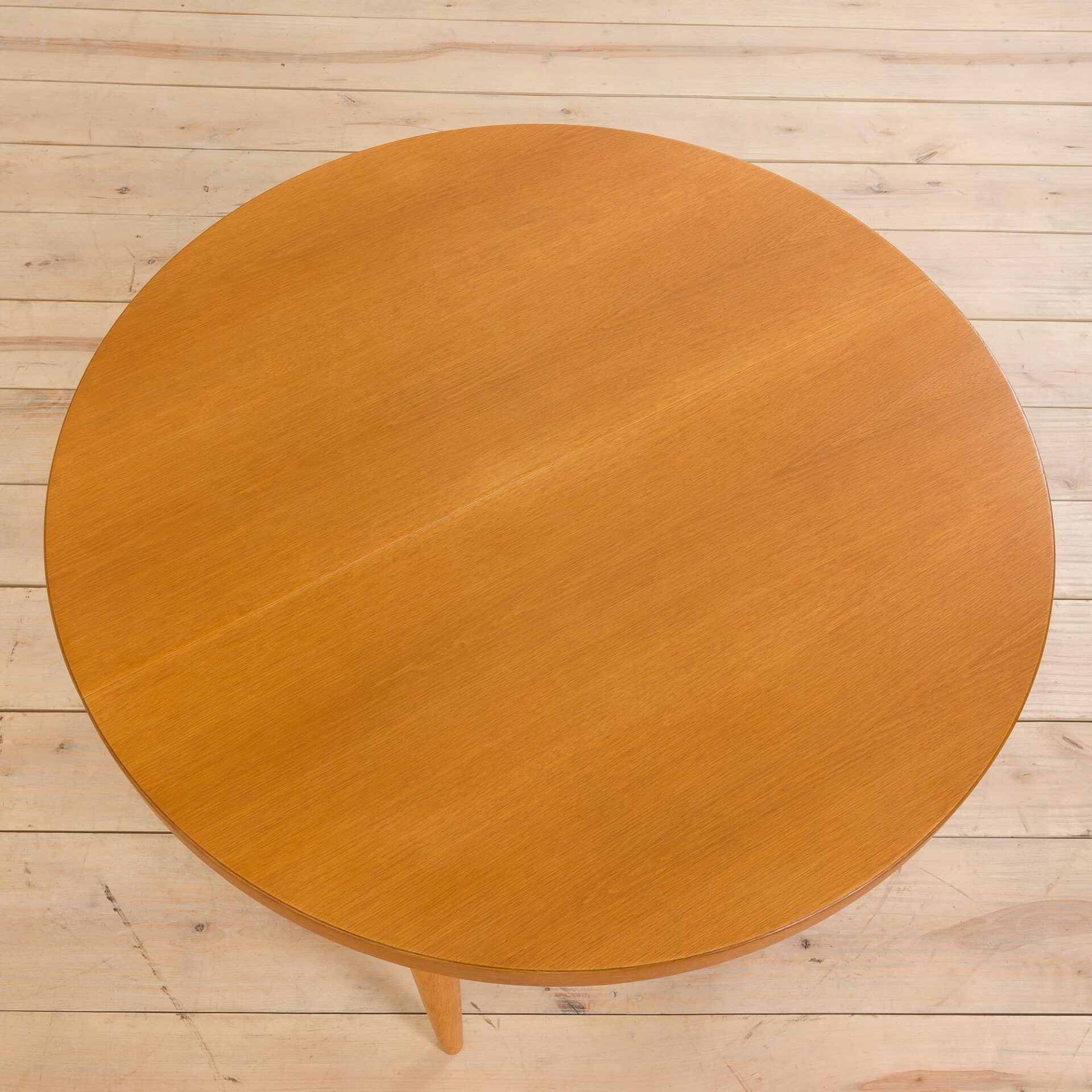 Okrągły dębowy rozkładany stół do jadalni zaprojektowany najprawdopodobniej przez Kai Kristiansena w latach 60-tych. Posiada jedno dodatkowe skrzydło, które ma 55 cm szerokości. Piękne bogate usłojenie drewna i świetna stolarka. Doskonały stan vintage. Lakierowana powierzchnia została wyczyszczona specjalnymi środkami i jest jak nowa, bez plam i zarysowań. Nogi są demontowalne dla łatwiejszego transportu.