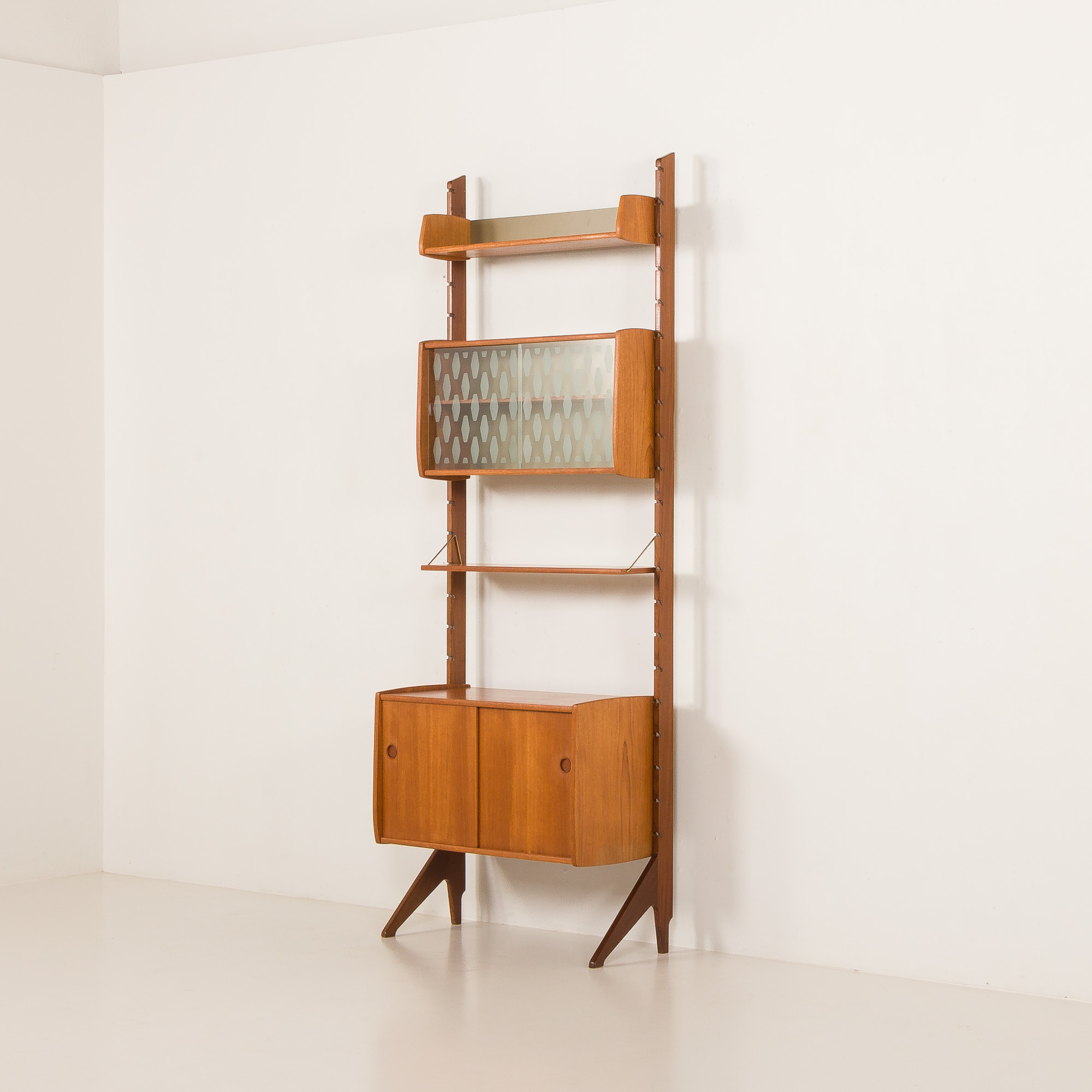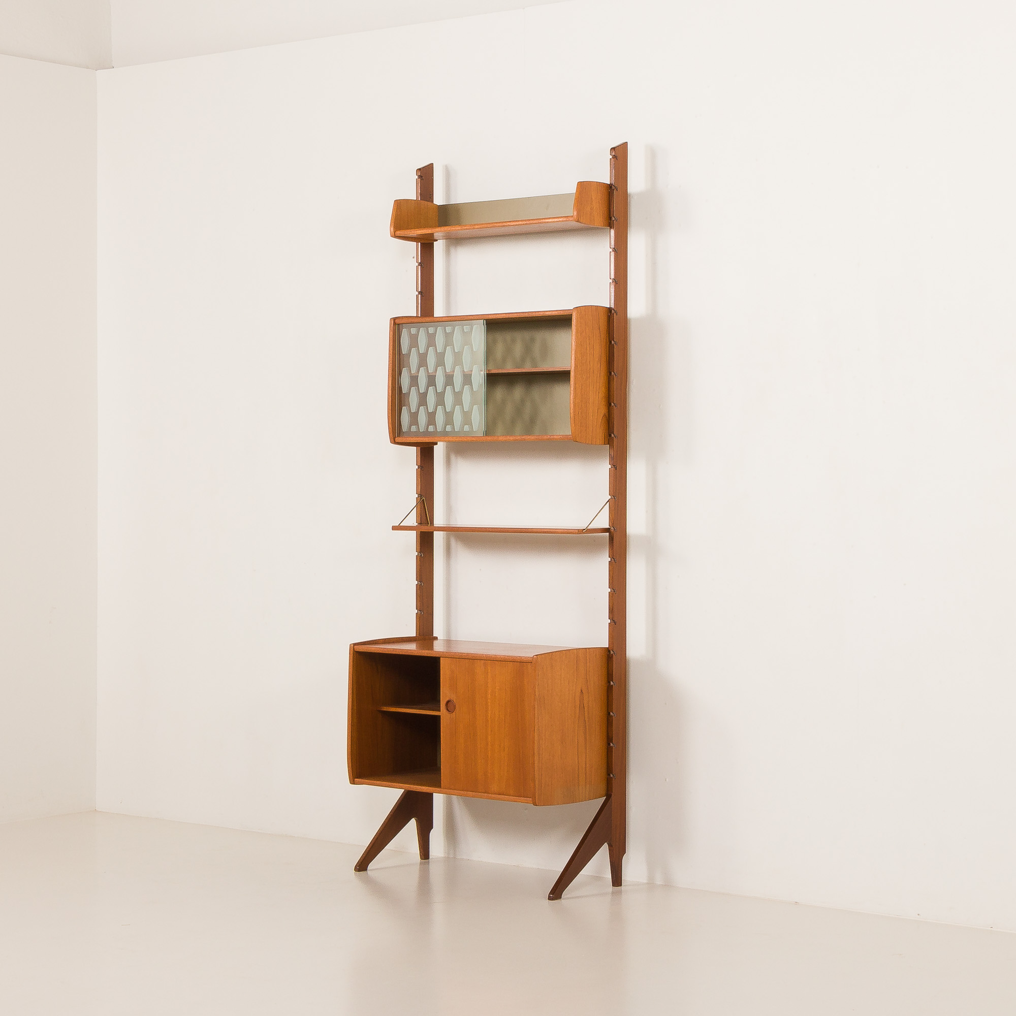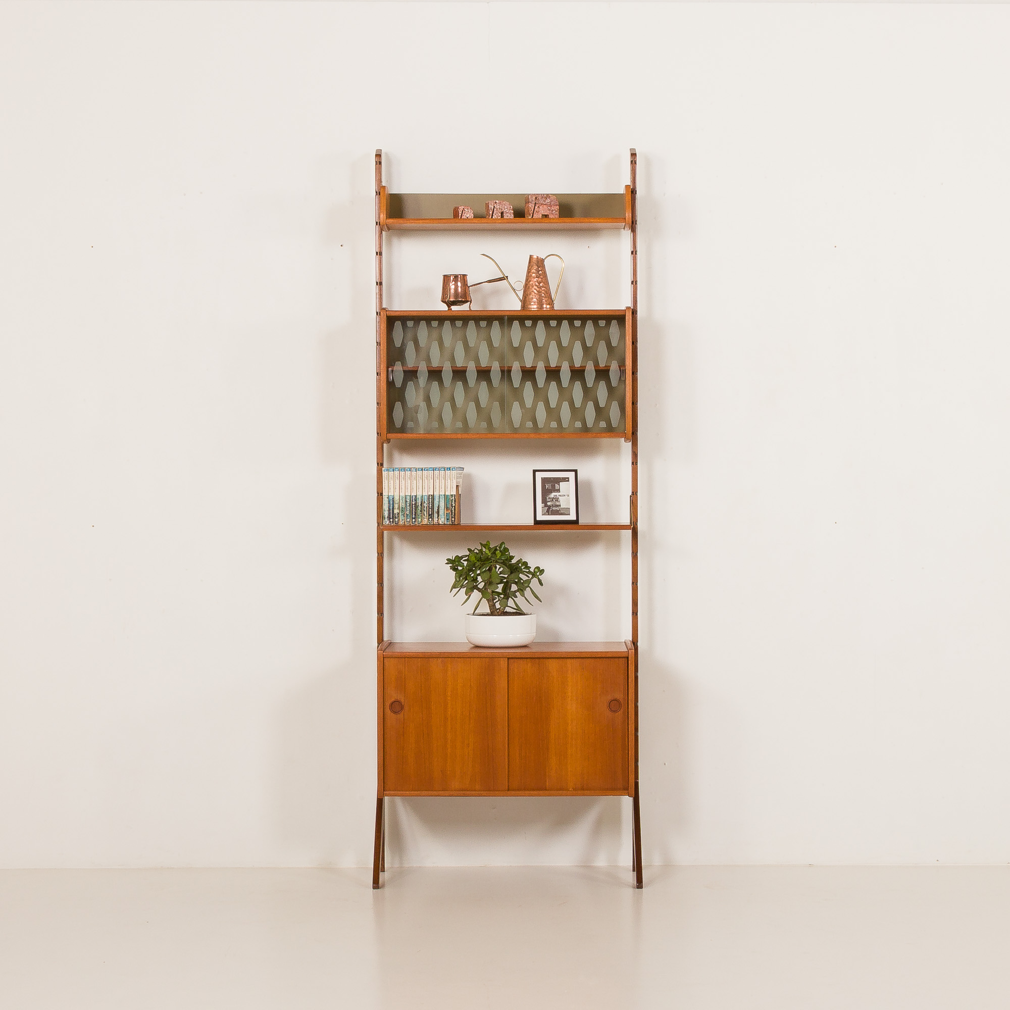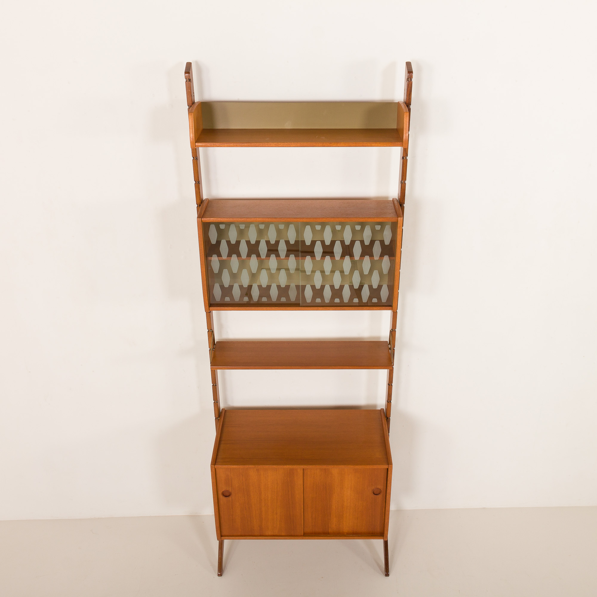 Ten skandynawski, wolnostojący regał z drewna tekowego pochodzi z Norwegii z lat 60. To reprezentant w pełni modułowego systemu „Ergo”, zaprojektowany przez Johna Texmona i Einara Blindheima dla Blindheim Mobelfabrikk. Einar Blindheim dla Blindheim Mobelfabrikk.