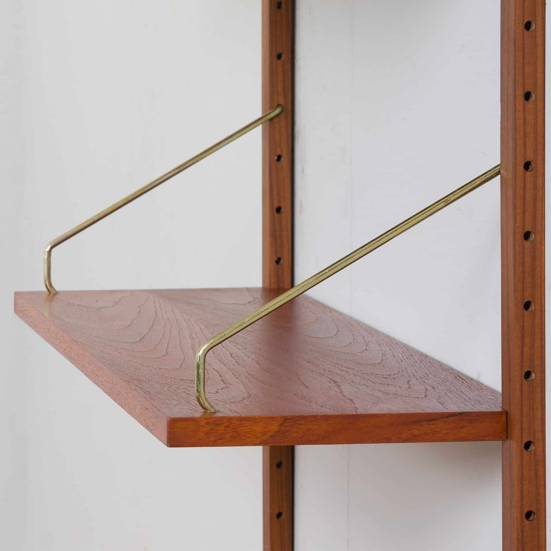 A mid-century wall unit in teak designed by Poul Cadovius in the 1960s. It features a two drawers compact desk, useful for home office space, but also as a regular deep shelf for flowers, pottery audio equipment, etc. The unit consists of: