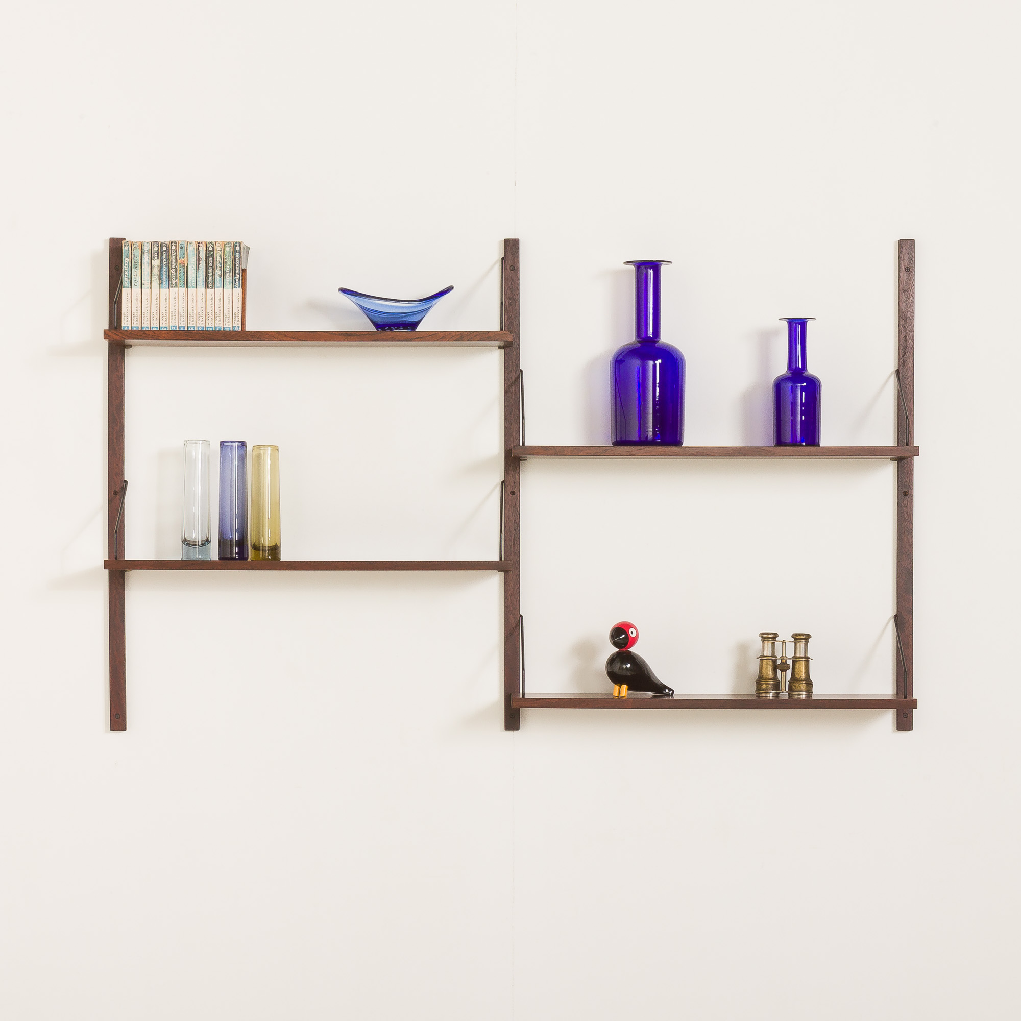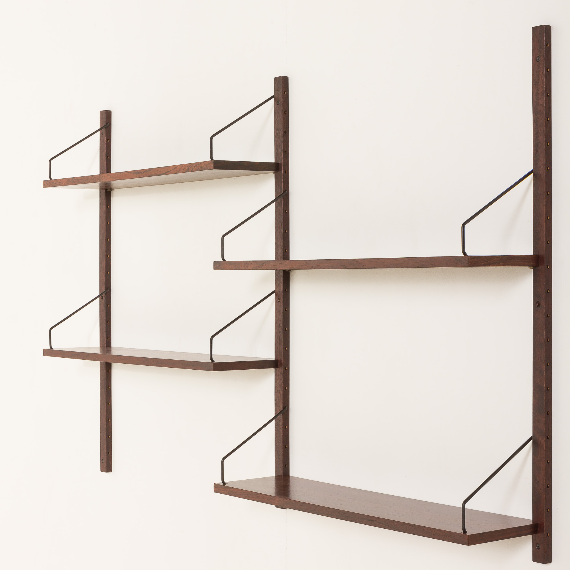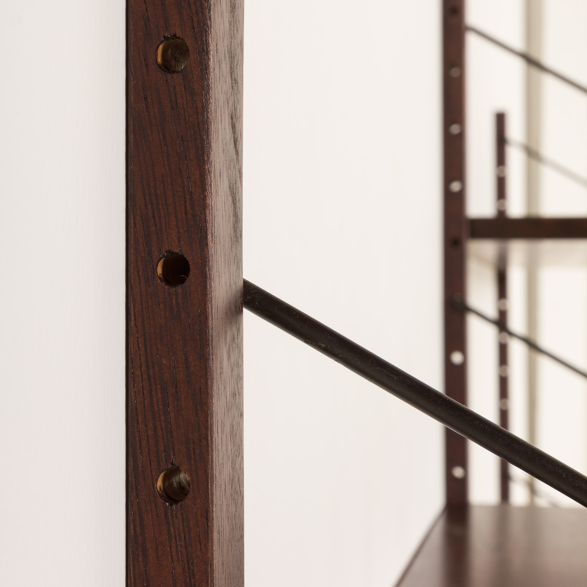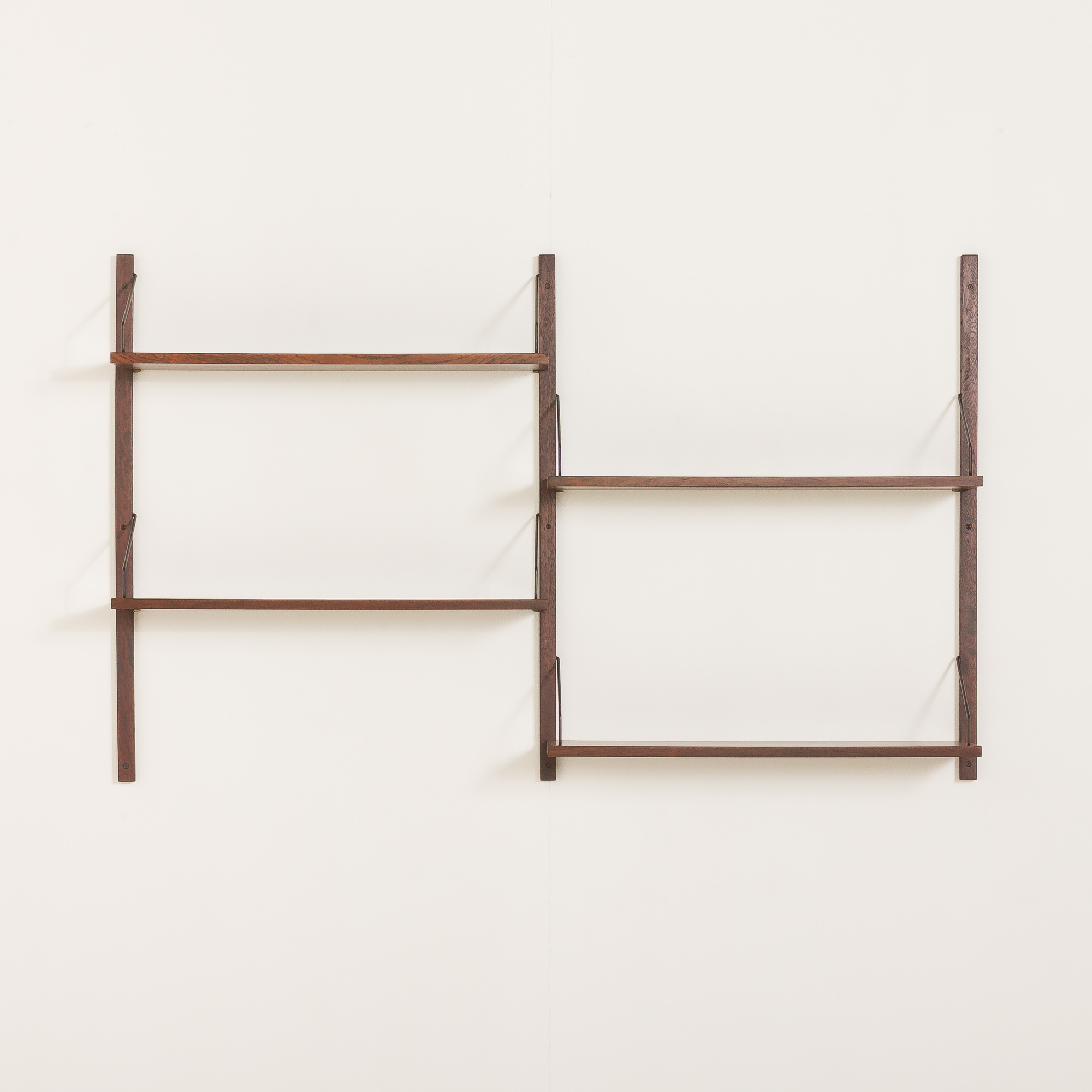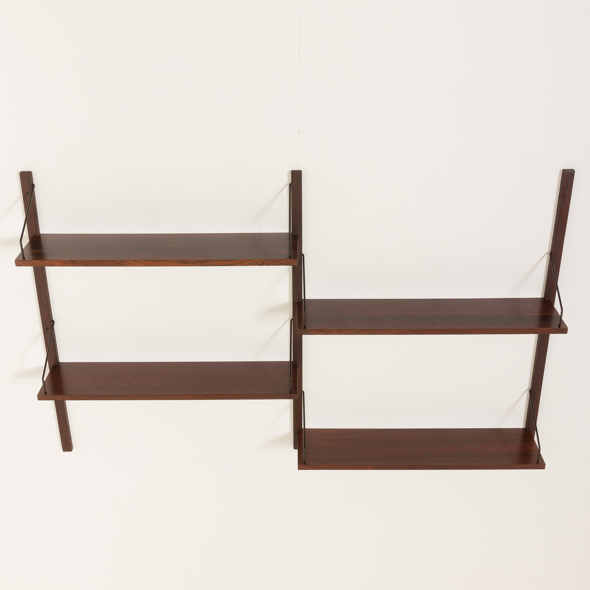 Despite its minimalist appearance, the combination of craftsmanship and meticulous choice of rosewood-known for its rich, deep tones and striking grain patterns-makes the piece a true decoration. This shelving system is fully modular, offering a variety of configuration options to suit your needs. The assembly system is simple and intuitive, with shelves mounted on solid wood rails using black metal hangers. Shelves can be arranged differently than on the picture. It is up to you.