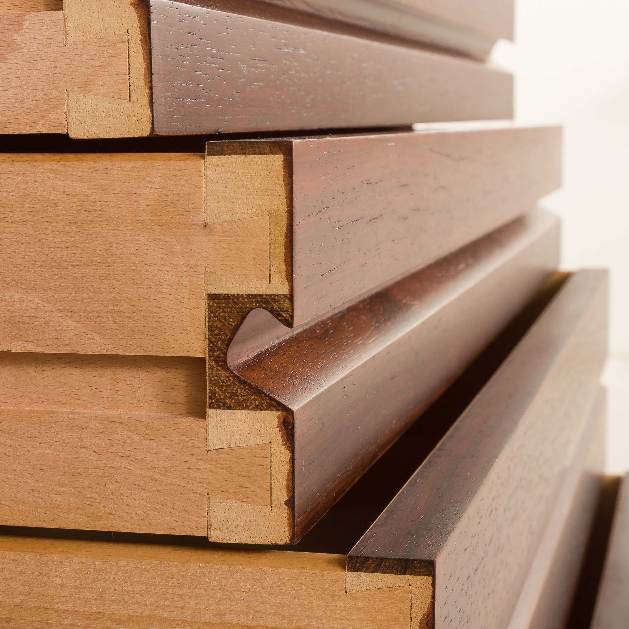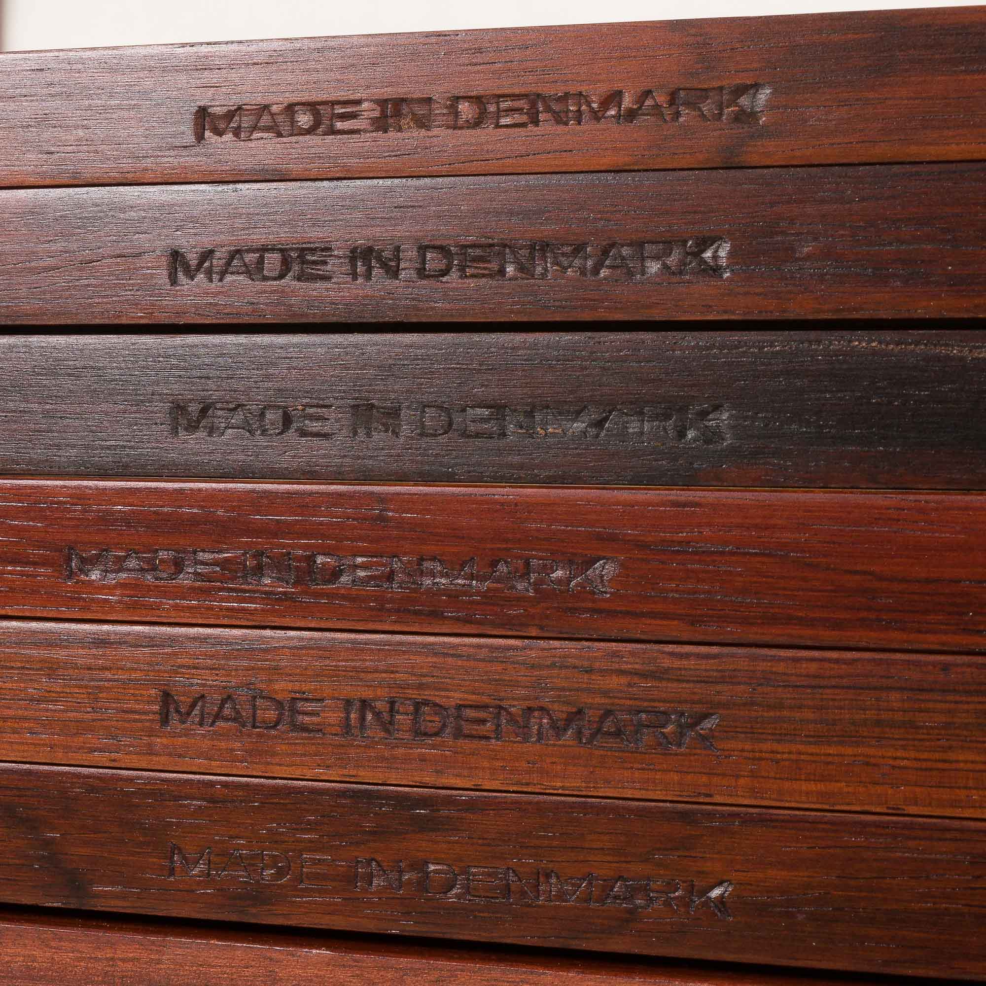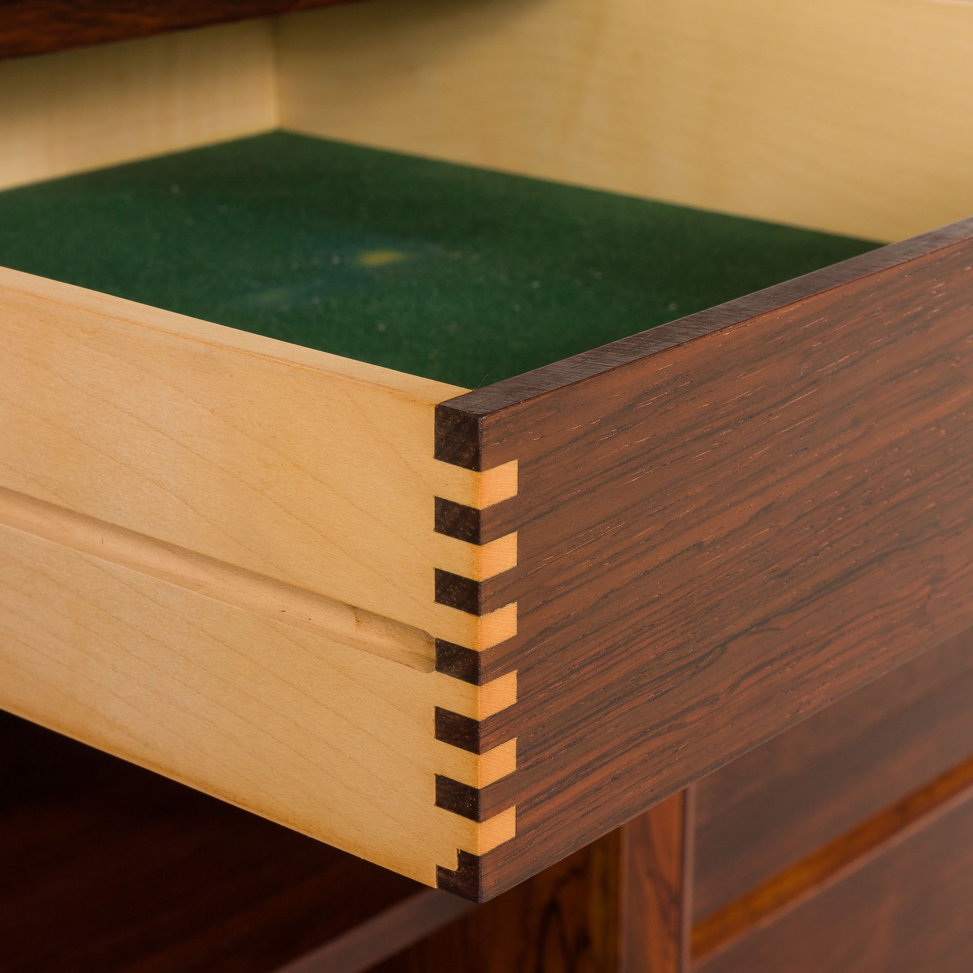 The choice of rosewood, which is one of the most expensive and rare woods, makes it a standout piece also for the most luxurious apartments. The nicely integrated, nearly invisible handles sculpted in solid wood, along with the sleek, frame-like profile surrounding the drawers and cabinets, are characteristic of Cadovius’ designs. All the drawers are made with dovetail joinery.