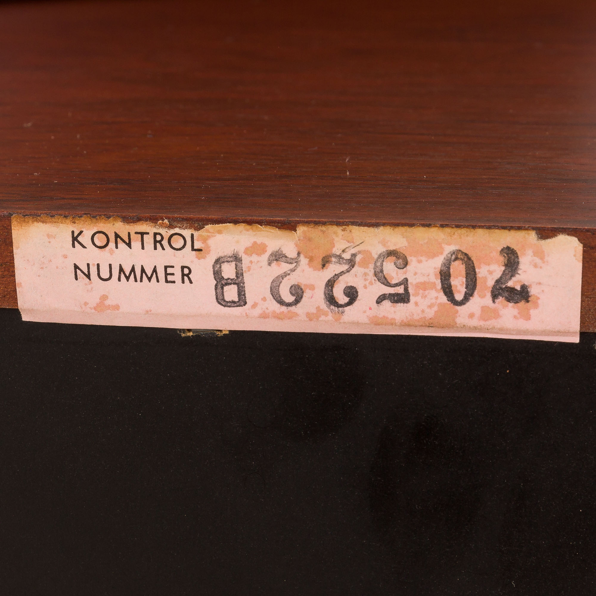 Despite the passage of nearly six decades, this piece remains in perfect original condition. The drawers are clean and operate smoothly, and the wood has been cleaned and treated with professional compounds to enhance its natural beauty. The engraving “Made in Denmark” located on the back of the shelves confirms the authenticity of the furniture’s origin. The original “Kontrol nummer” label has been preserved on the cabinet.