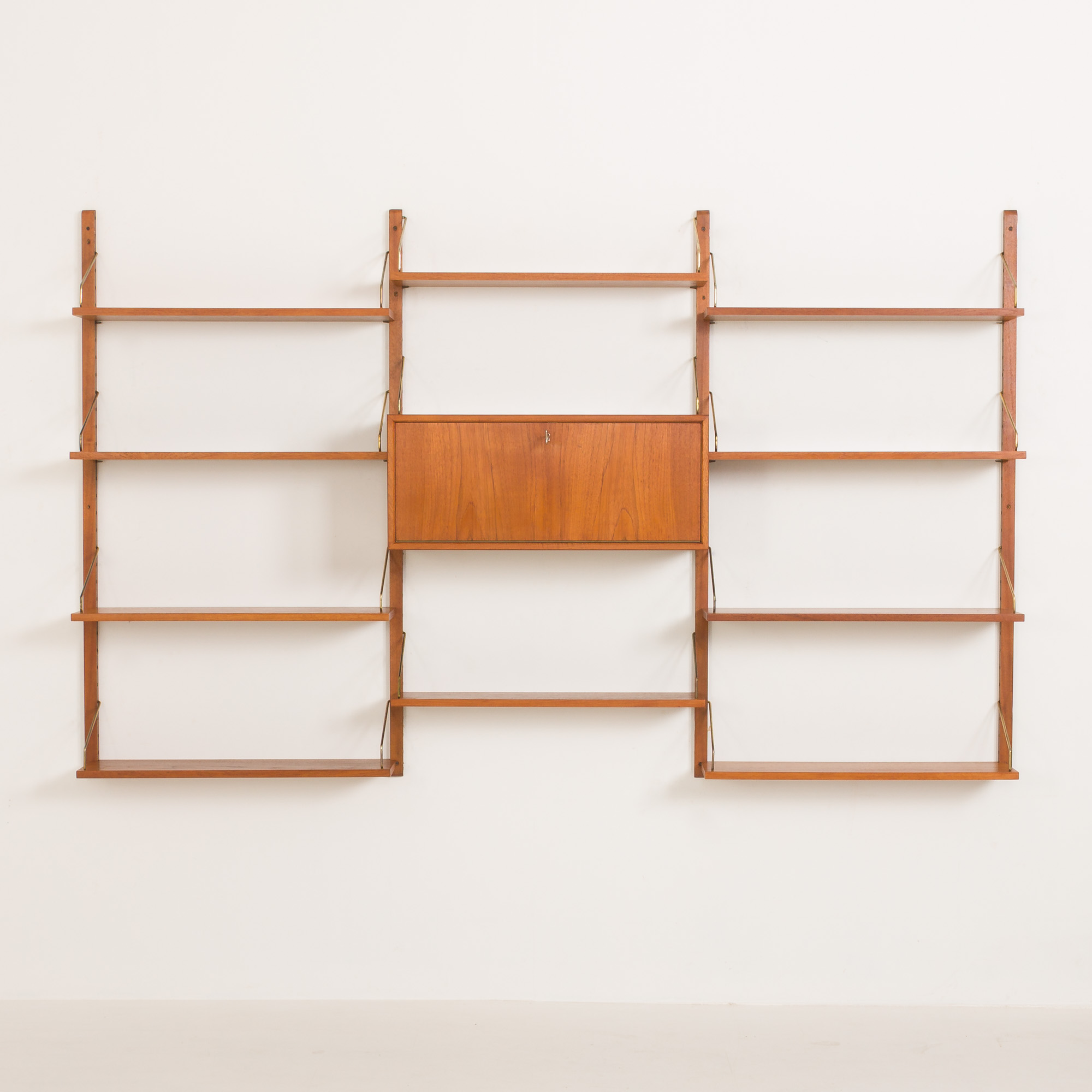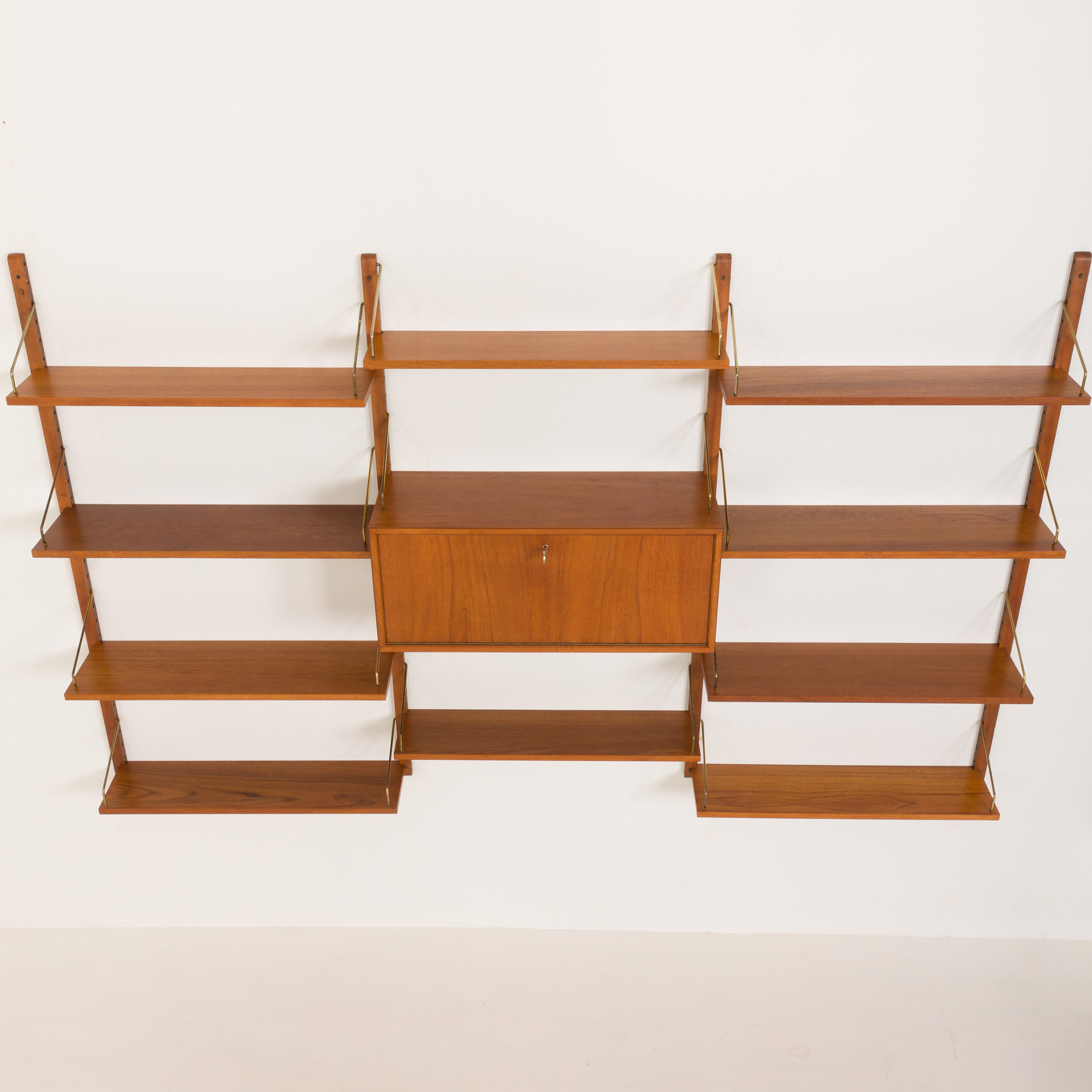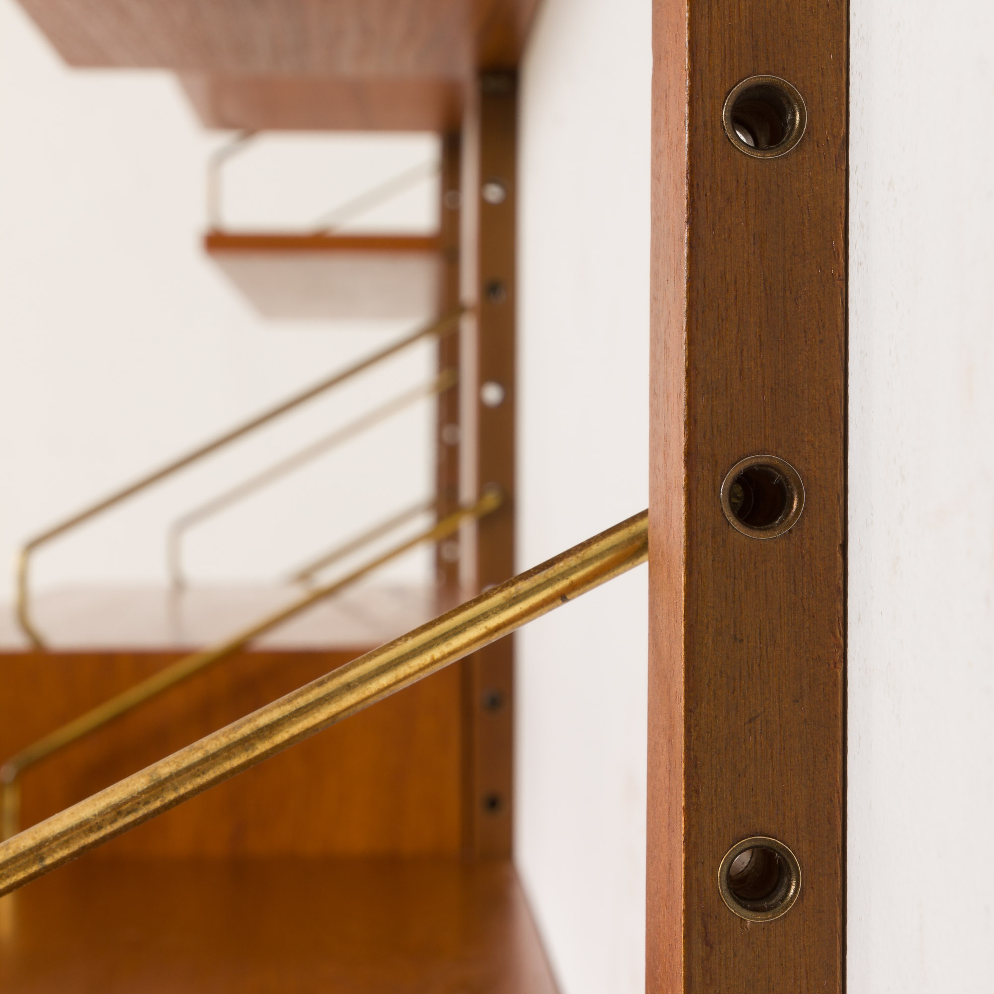 Three-bay wall unit in teak designed by Poul Cadovius for Gustav Bahus in the 60s. It is a modular shelving system with a center bar or secretaire. One cabinet with small inner shelf and ten modular shelves provide enough place for books and decorations. Additionally, each shelf and rail have metal fittings for brass hangers.