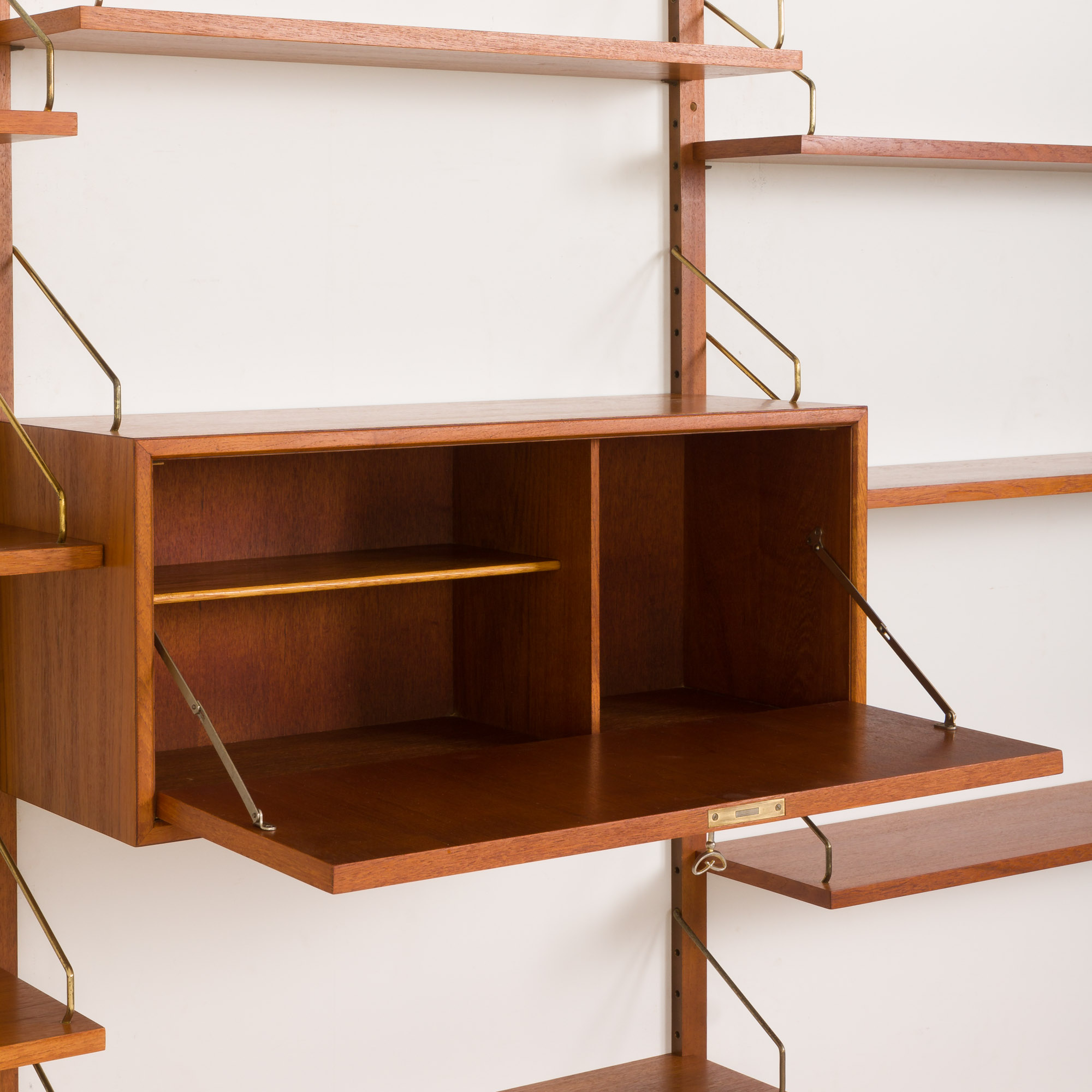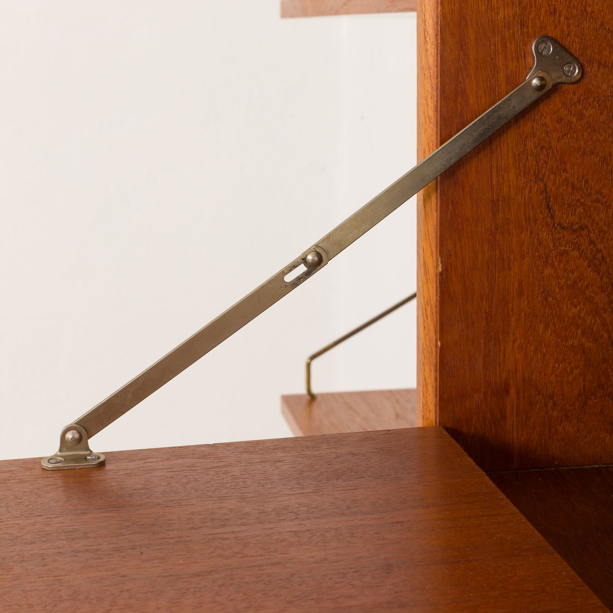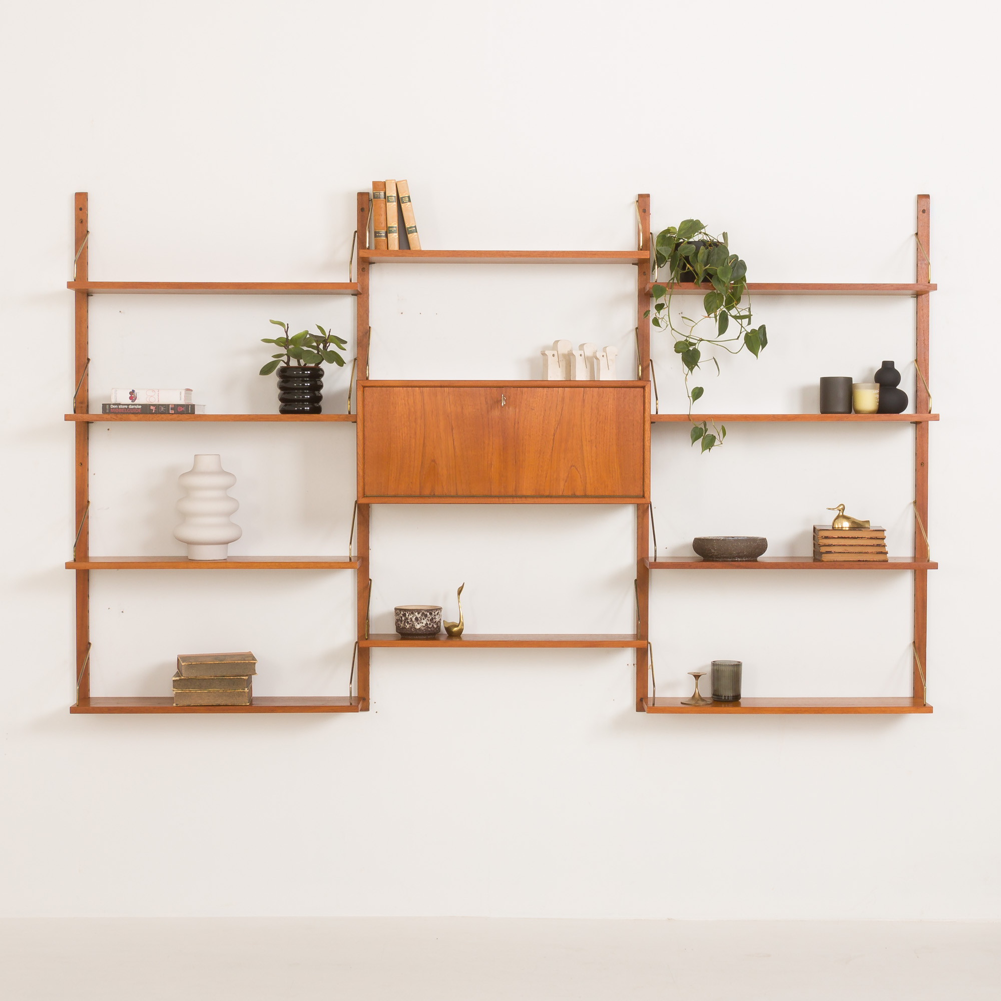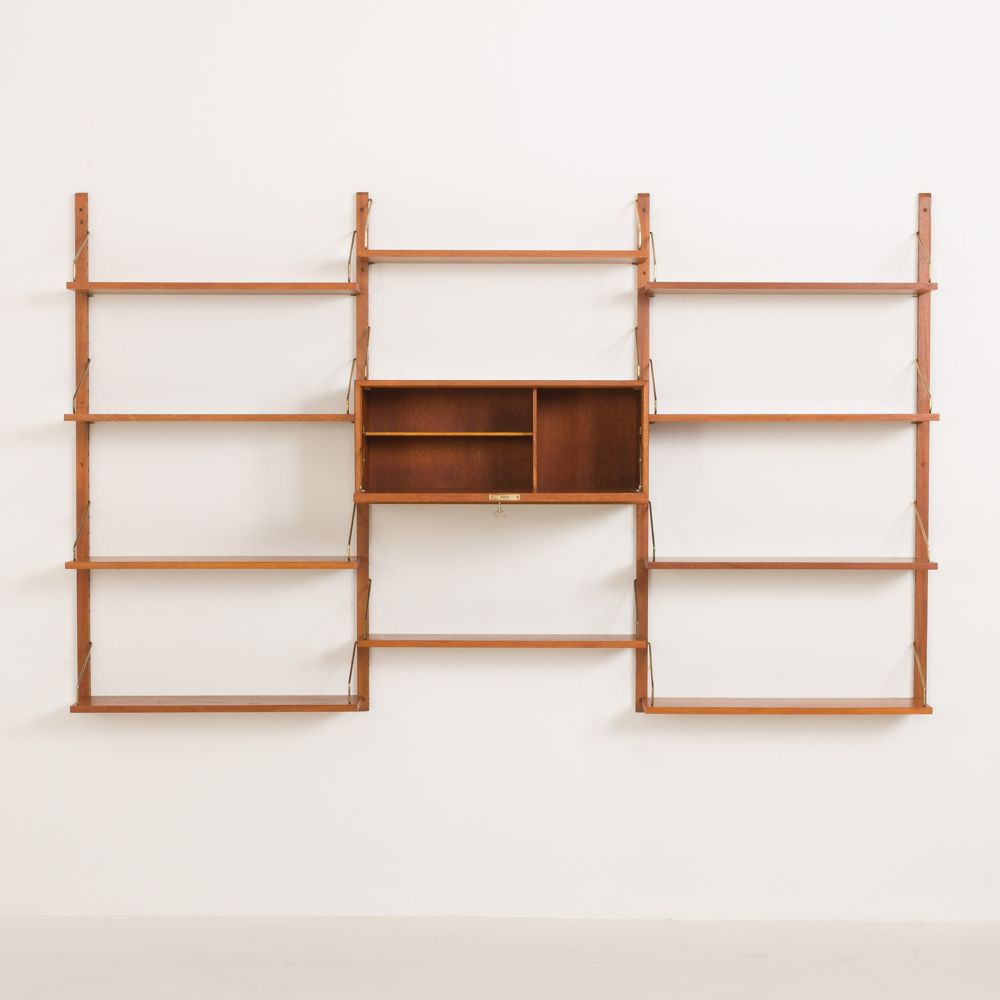 Three-bay wall unit in teak designed by Poul Cadovius for Gustav Bahus in the 60s. It is a modular shelving system with a center bar or secretaire. One cabinet with small inner shelf and ten modular shelves provide enough place for books and decorations. Additionally, each shelf and rail have metal fittings for brass hangers.