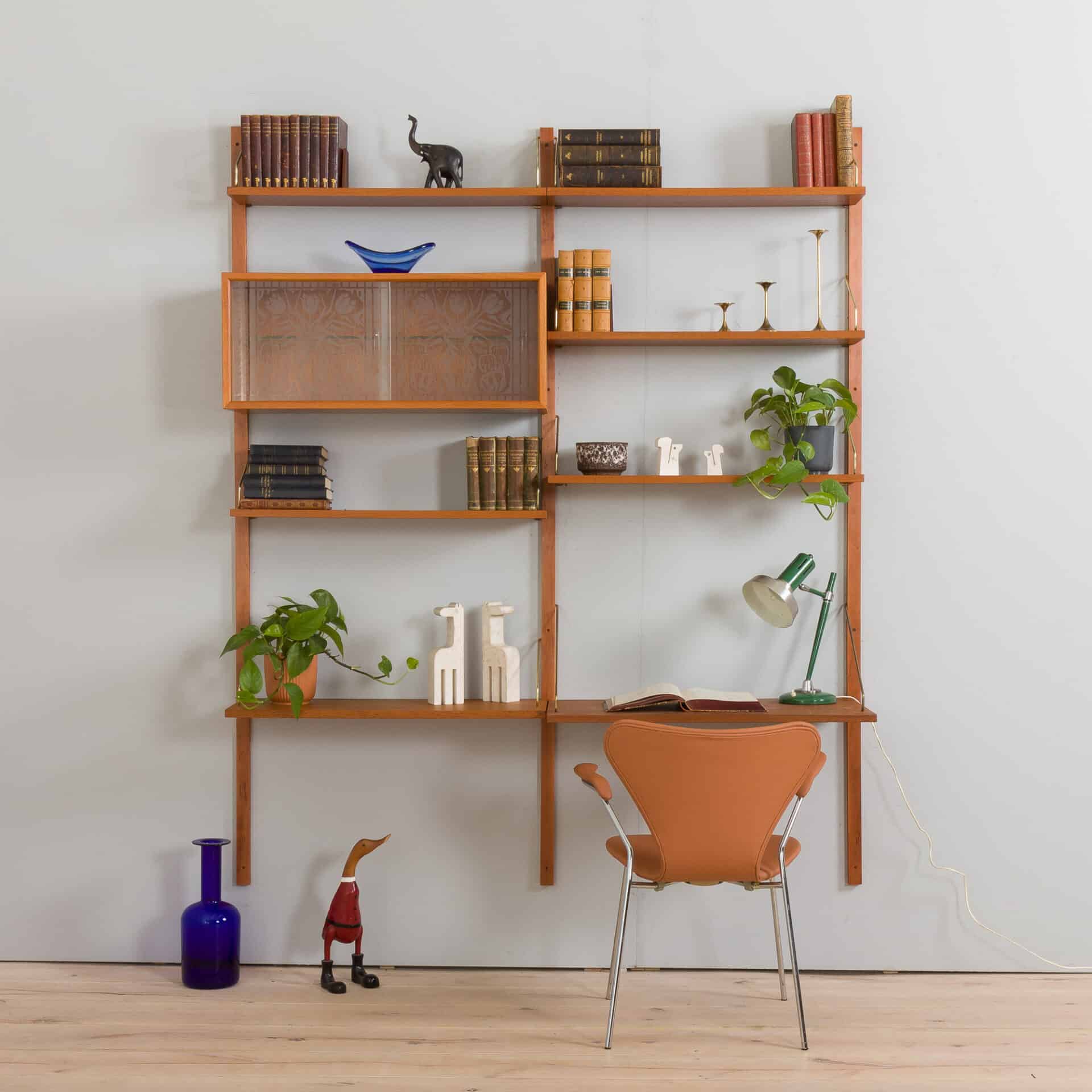 Danish teak wall unit with compact desk-shelf and glass cabinet designed by Poul Cadovius for Cado in the 1960s. This mid-century shelving system is entirely modular and can be arranged upon ones will. Beautiful teak grain and warm color will enhance any living area, and a desk shelf will help to create an discreet space for a home office.
