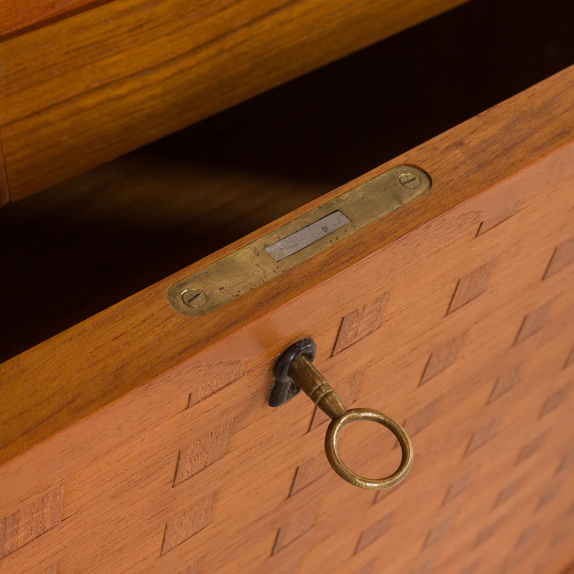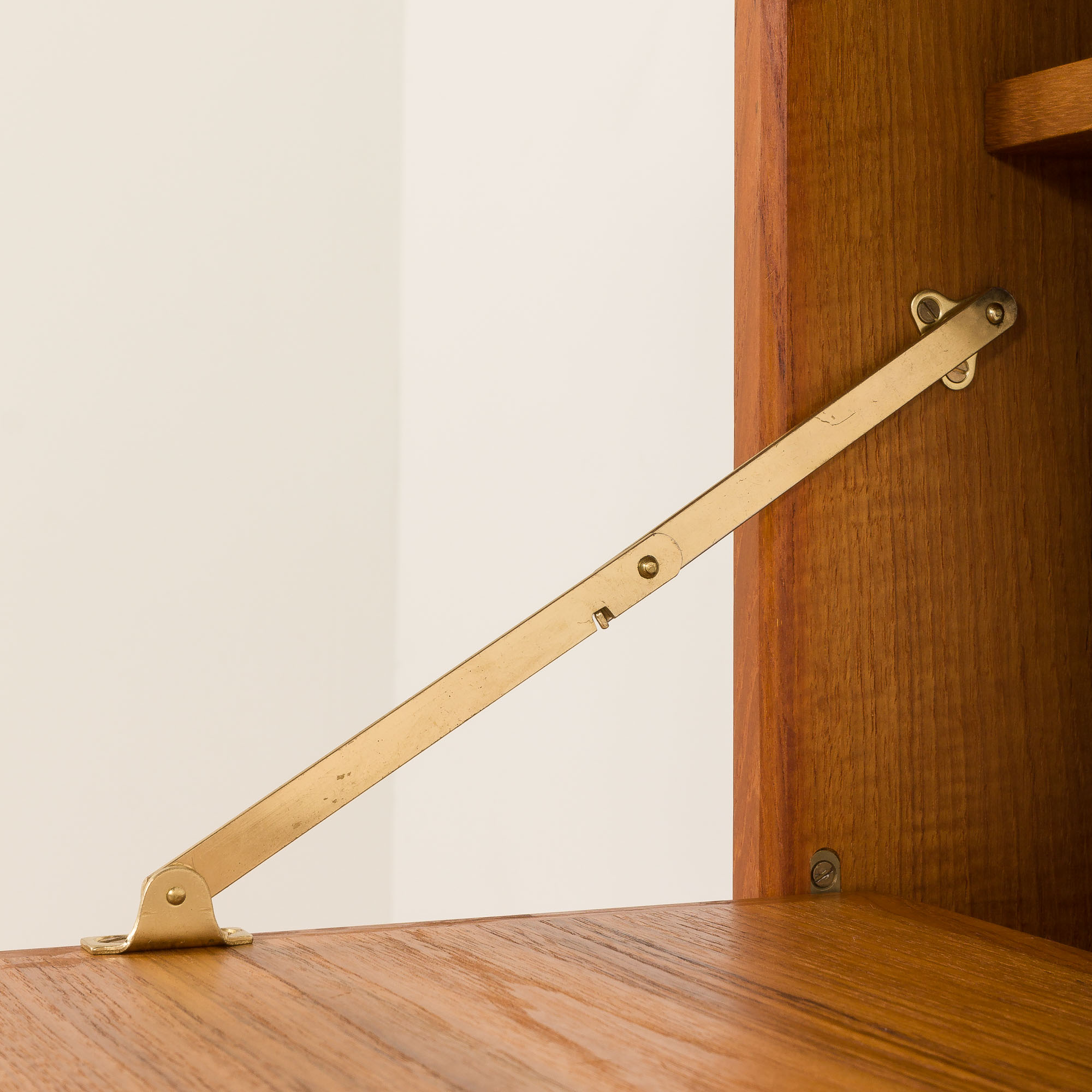 The wall unit has been checked by our team and is in great original vintage condition, with very minor signs of use. The opening mechanism and drawers work smoothly and all components fit together. We cleaned the wood with professional compounds and finished with layers of Danish oil to enhance the beauty of the grain. An original key is provided.