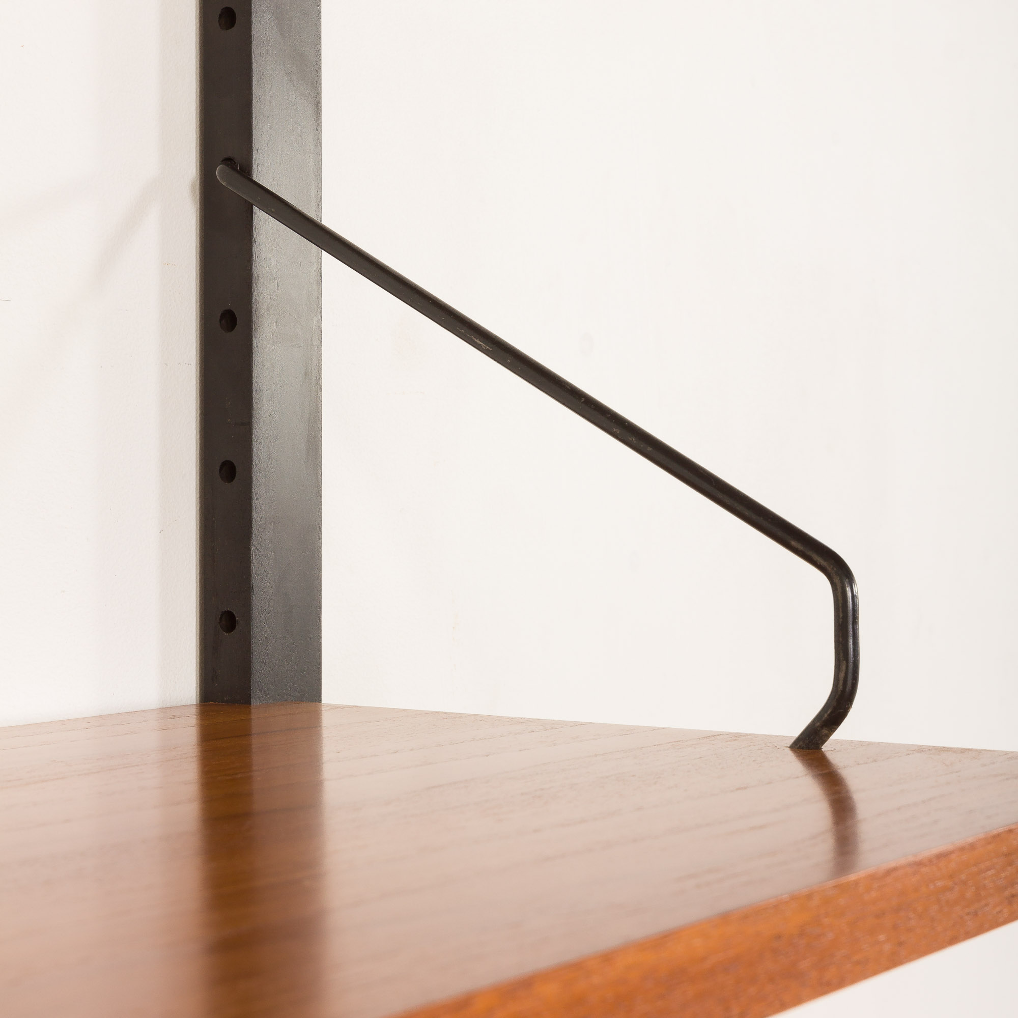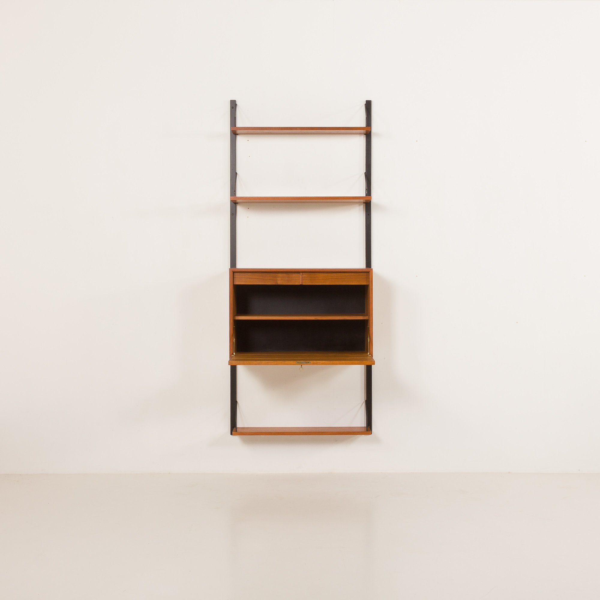 A home office one bay teak wall unit with a drop-door cabinet, designed by Poul Cadovius for Cado in the 1960s, provides discrete working and storage space. Perfect for the living room, bedroom or home office, this wall unit is an entirely modular shelving system. All elements are 80 cm wide and can be arranged as needed.