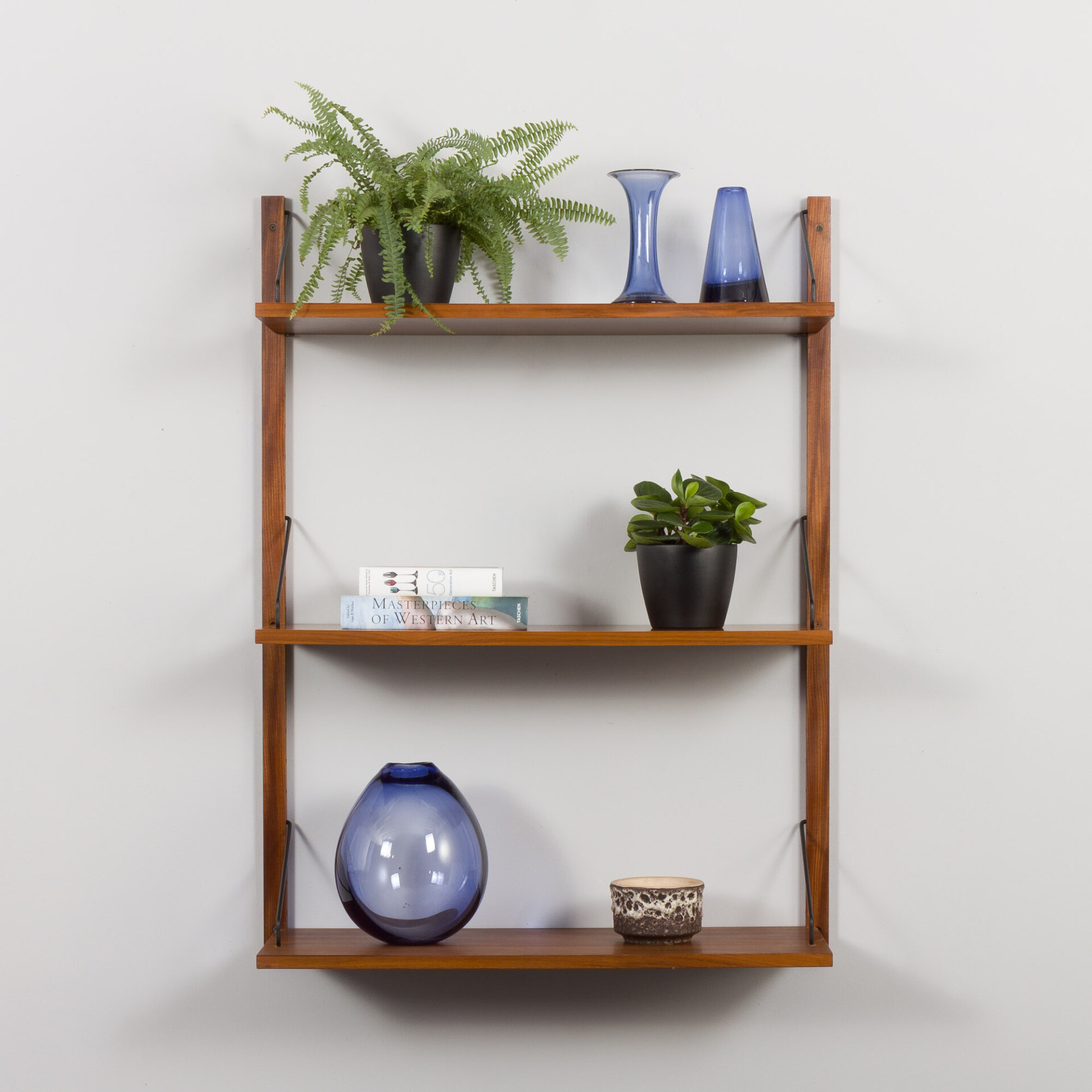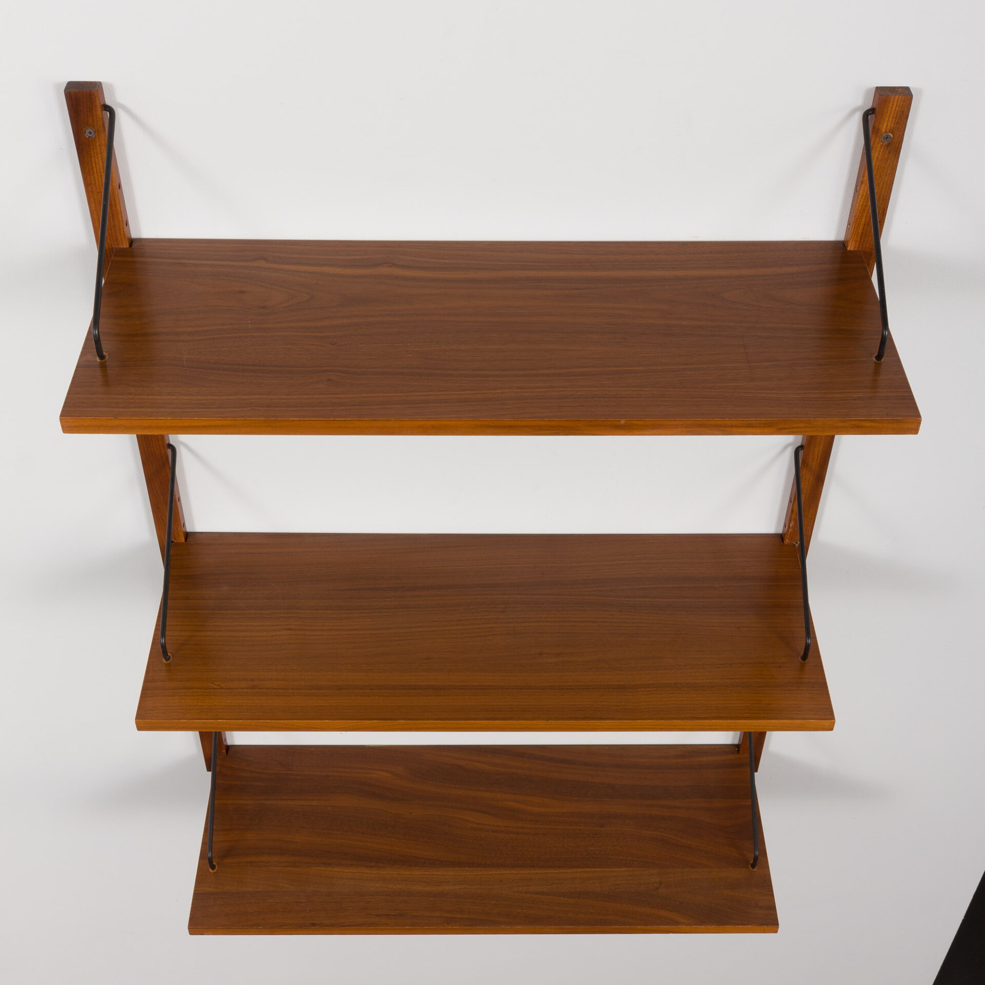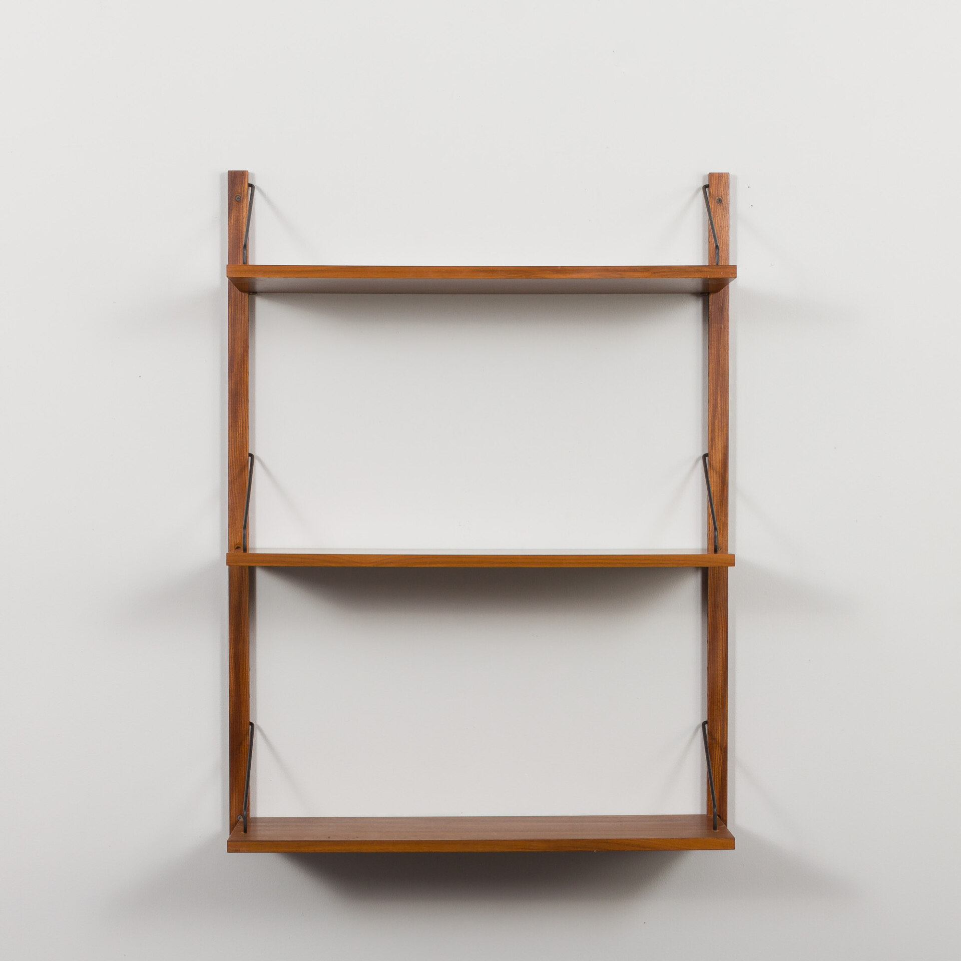 A Danish set of three extra deep shelves in walnut, designed by Poul Cadovius for Cado in the 60s., will enrich any interior while providing storage space for books and decorations. These simple 30cm deep and elegant bookshelves, finished with walnut veneer, hang on solid wood rails and black metal hangers.