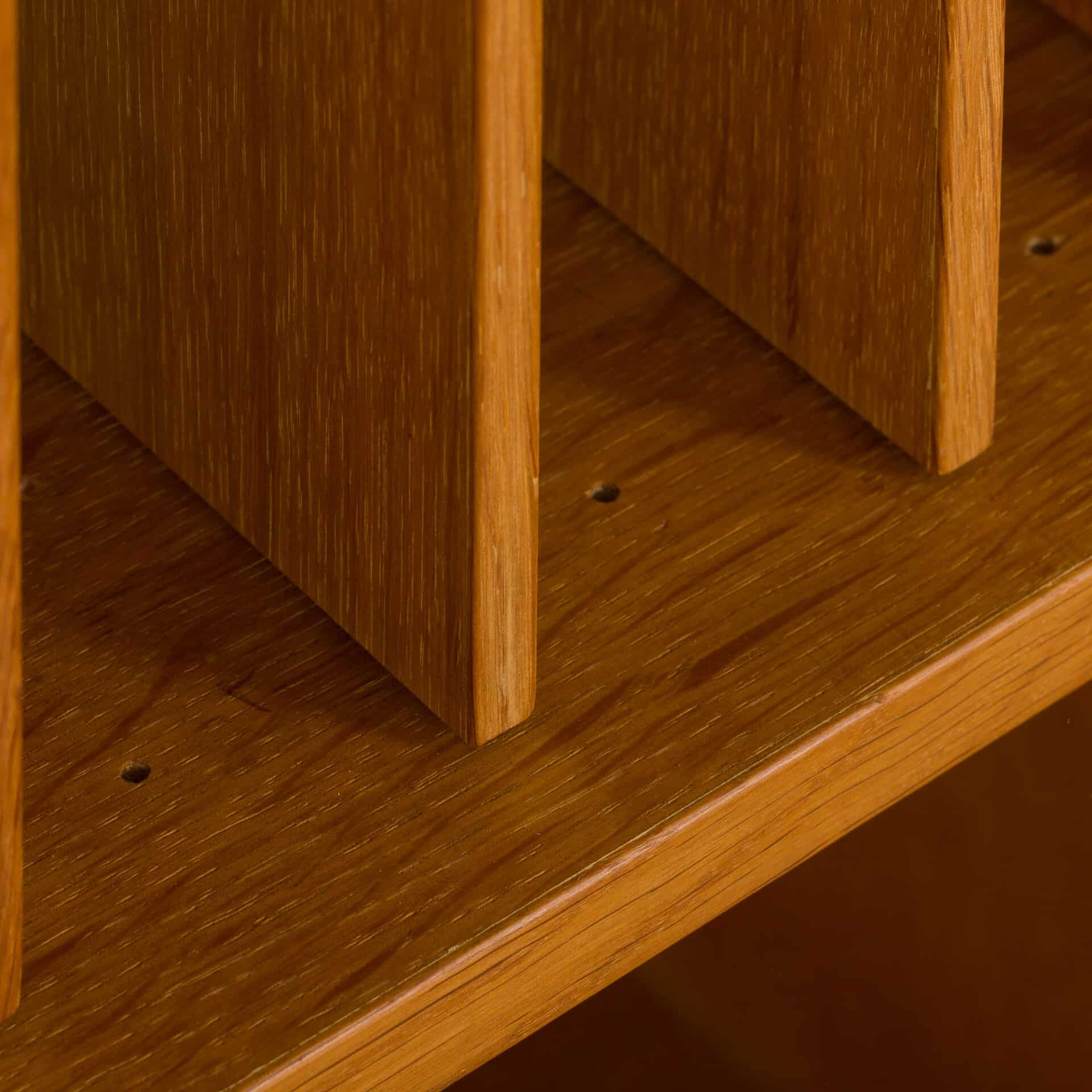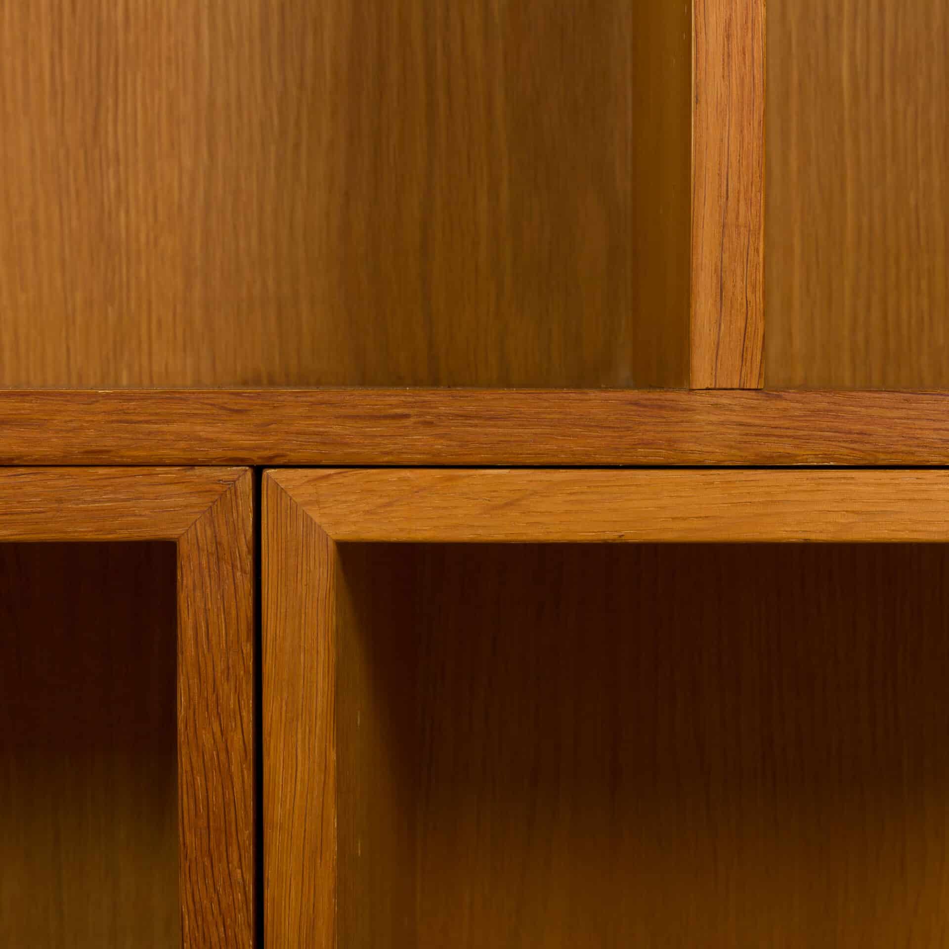 An impressive modular bookcase system by H.W Klein manufactured by Bramin comes from the 1970s. Manufacturer’s label preserved. The bookcase is made of solid oak with oak veneered parts. 8 self-contained modules in two levels that can be arranged as required. The possibilities are a lot! There are also adjustable compartments for vinyl records or magazines.