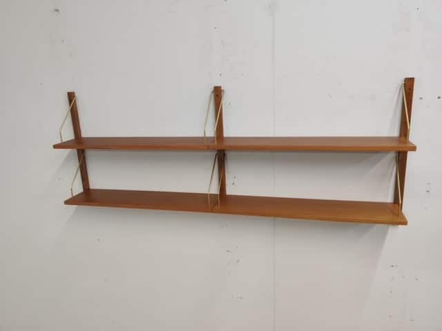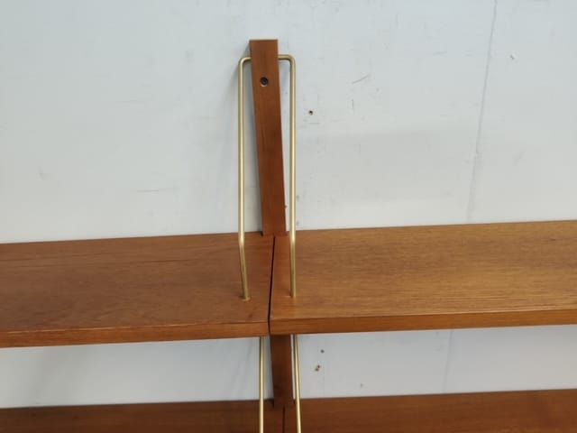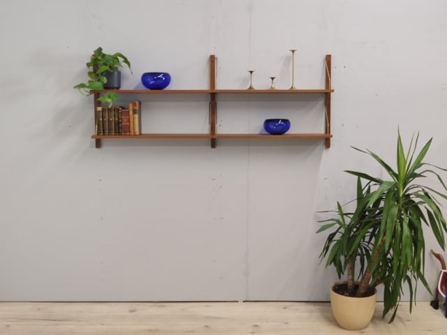 Danish wall unit in the style of Preben Sorensen, Cadovius (similar mounting system and carpentry) from the 1960s. It is a modular shelving system with four shelves in teak wood, which can be arranged as required. This set consists of: