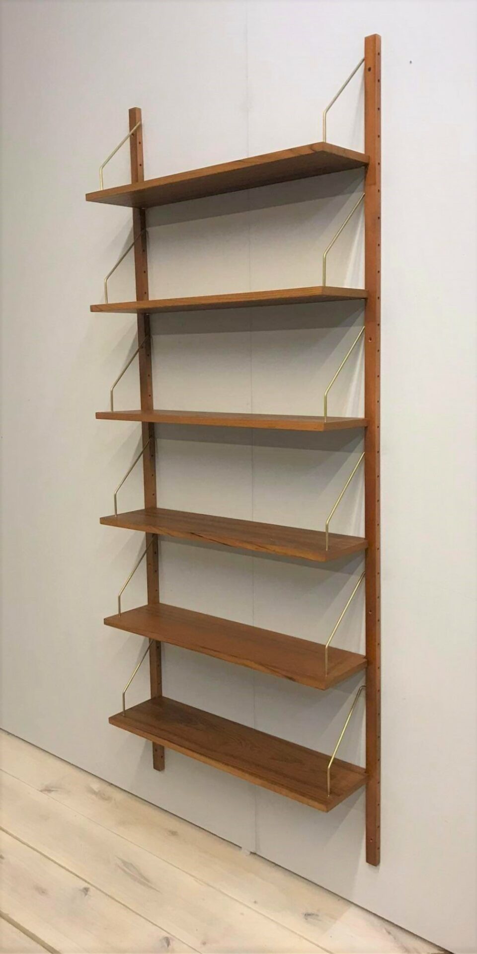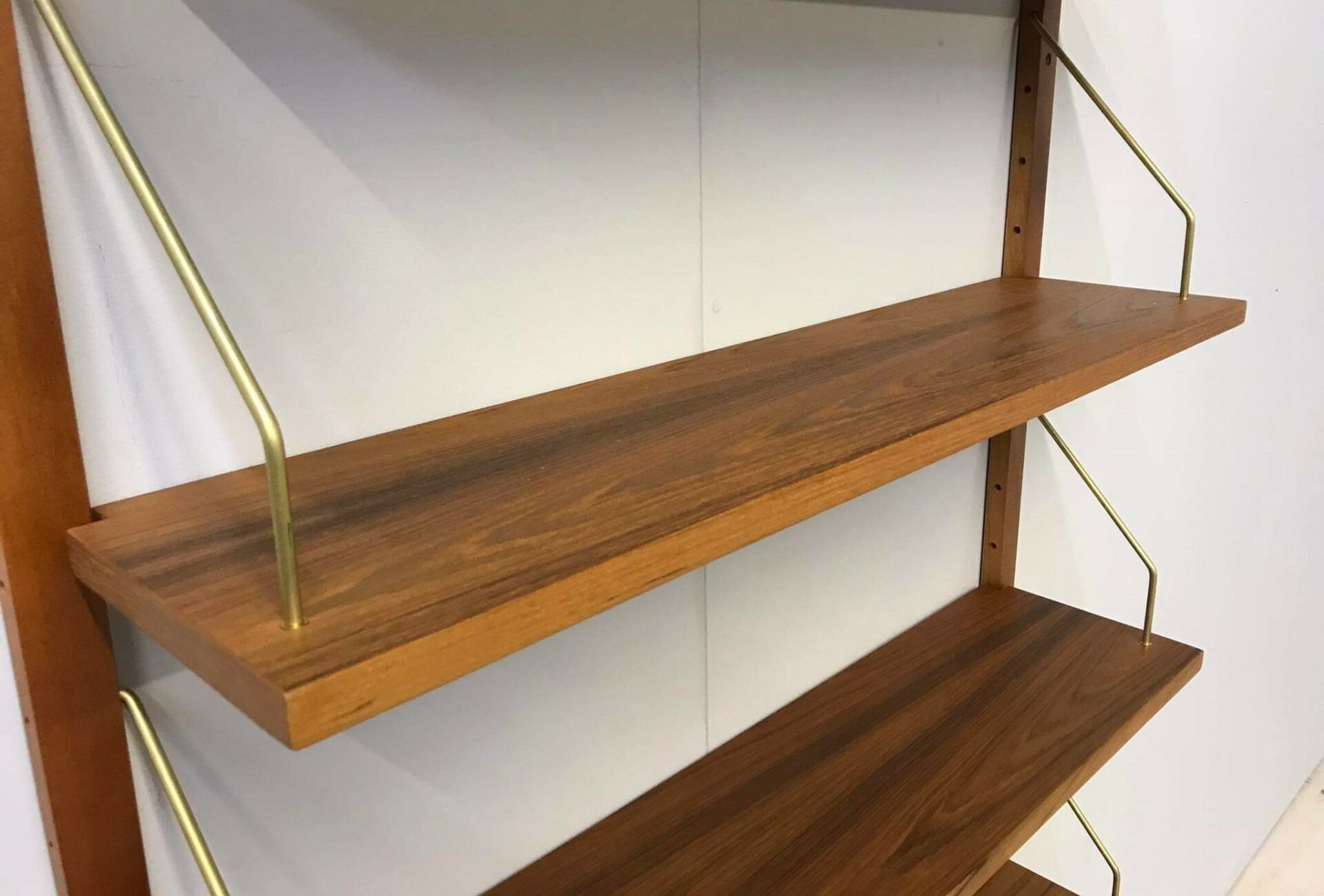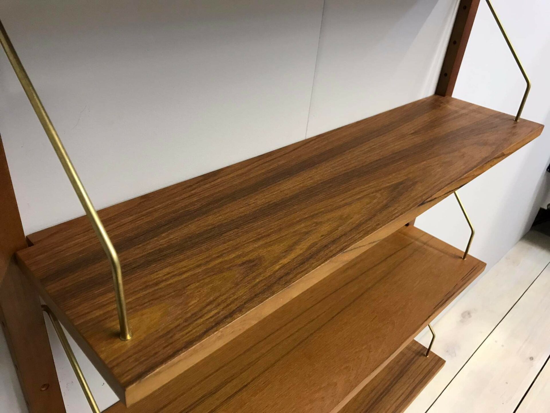 The unit consists of six teak veneered shelves and two solid wood rails, they hang on brass hangers. The shelves are fully adjustable, one can place them lower or higher.