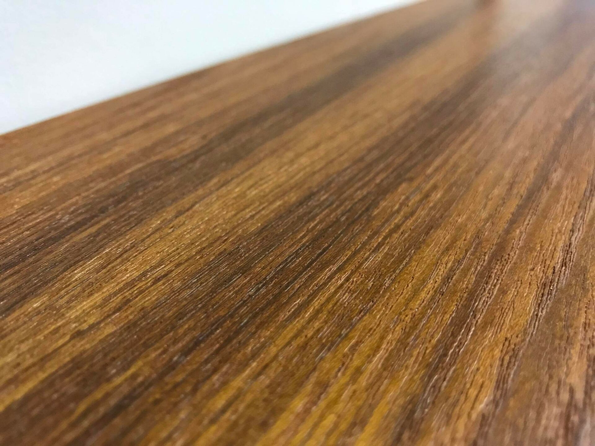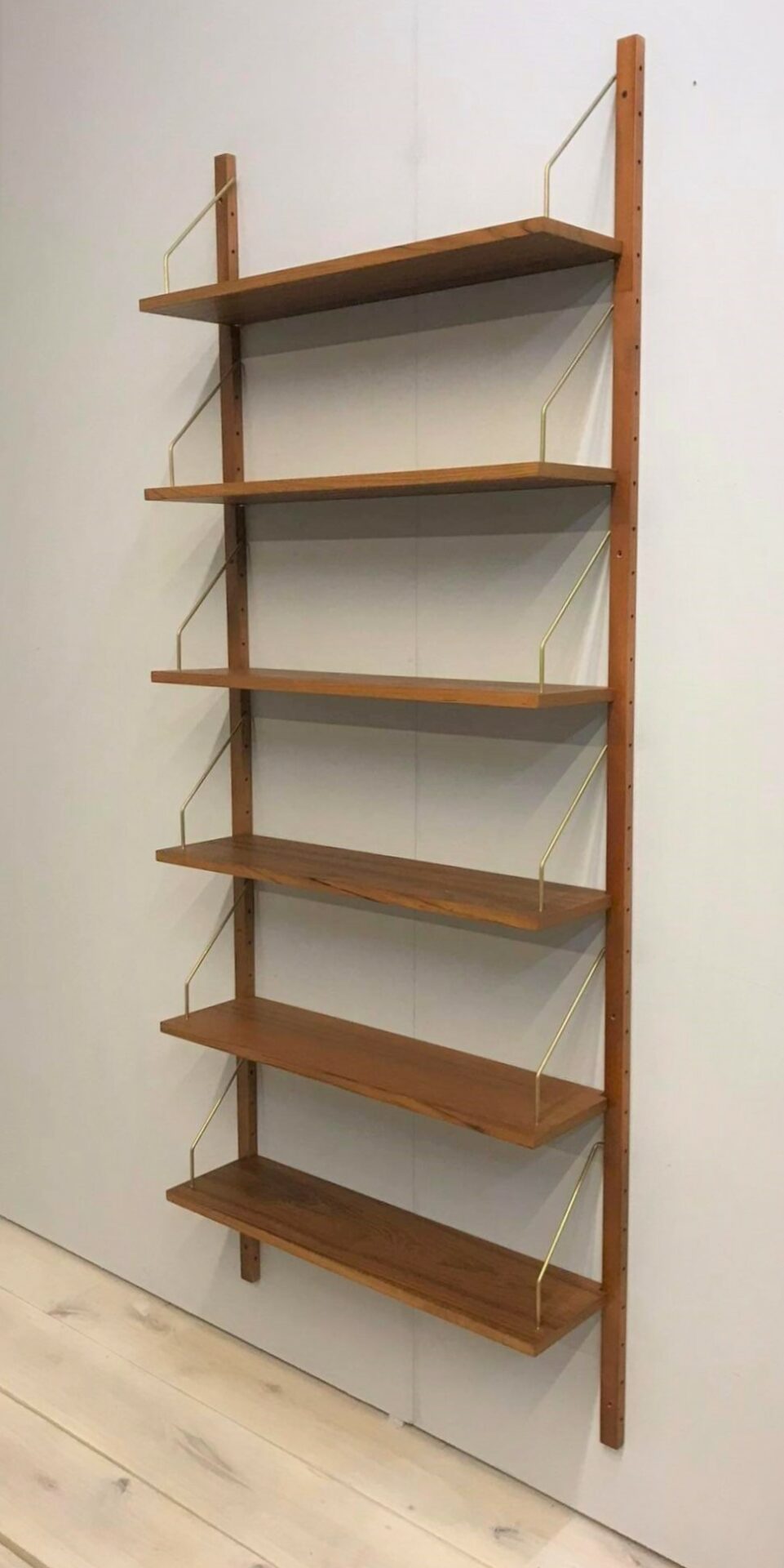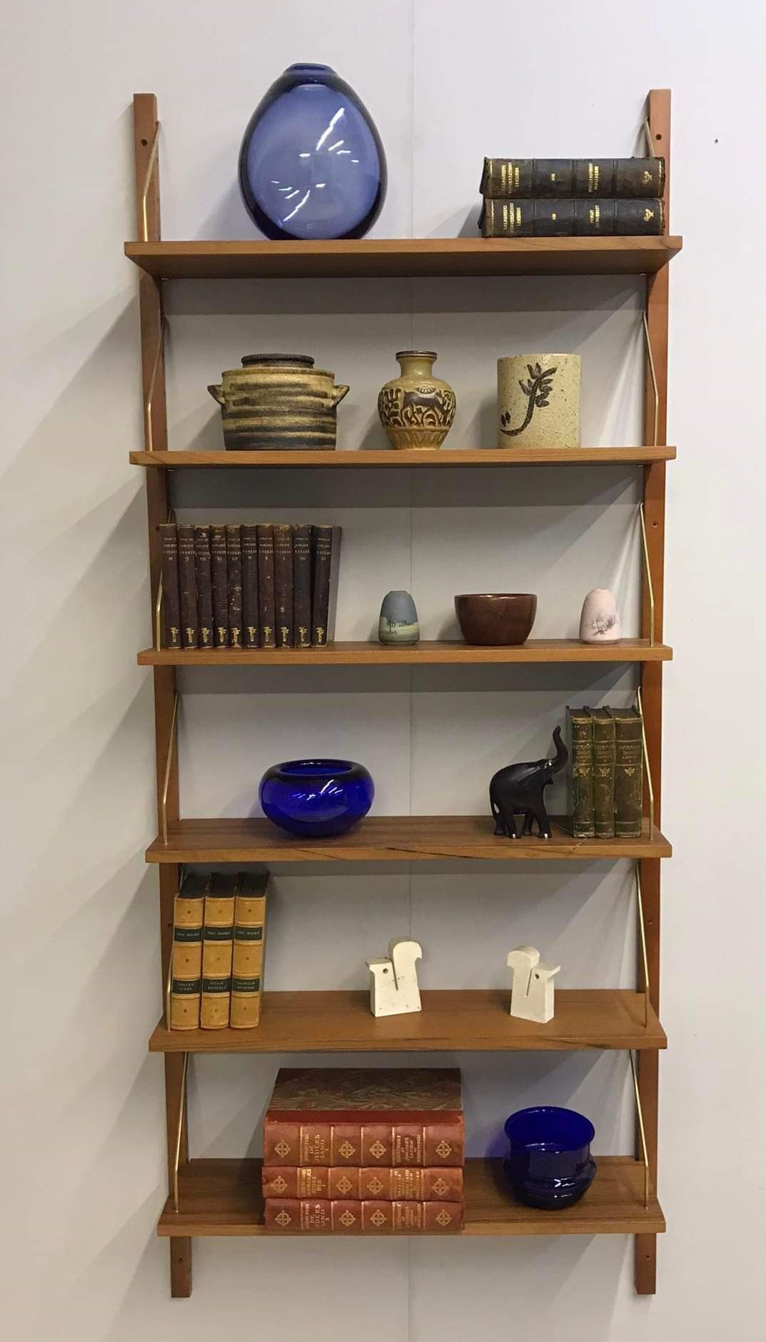 The unit consists of six teak veneered shelves and two solid wood rails, they hang on brass hangers. The shelves are fully adjustable, one can place them lower or higher.