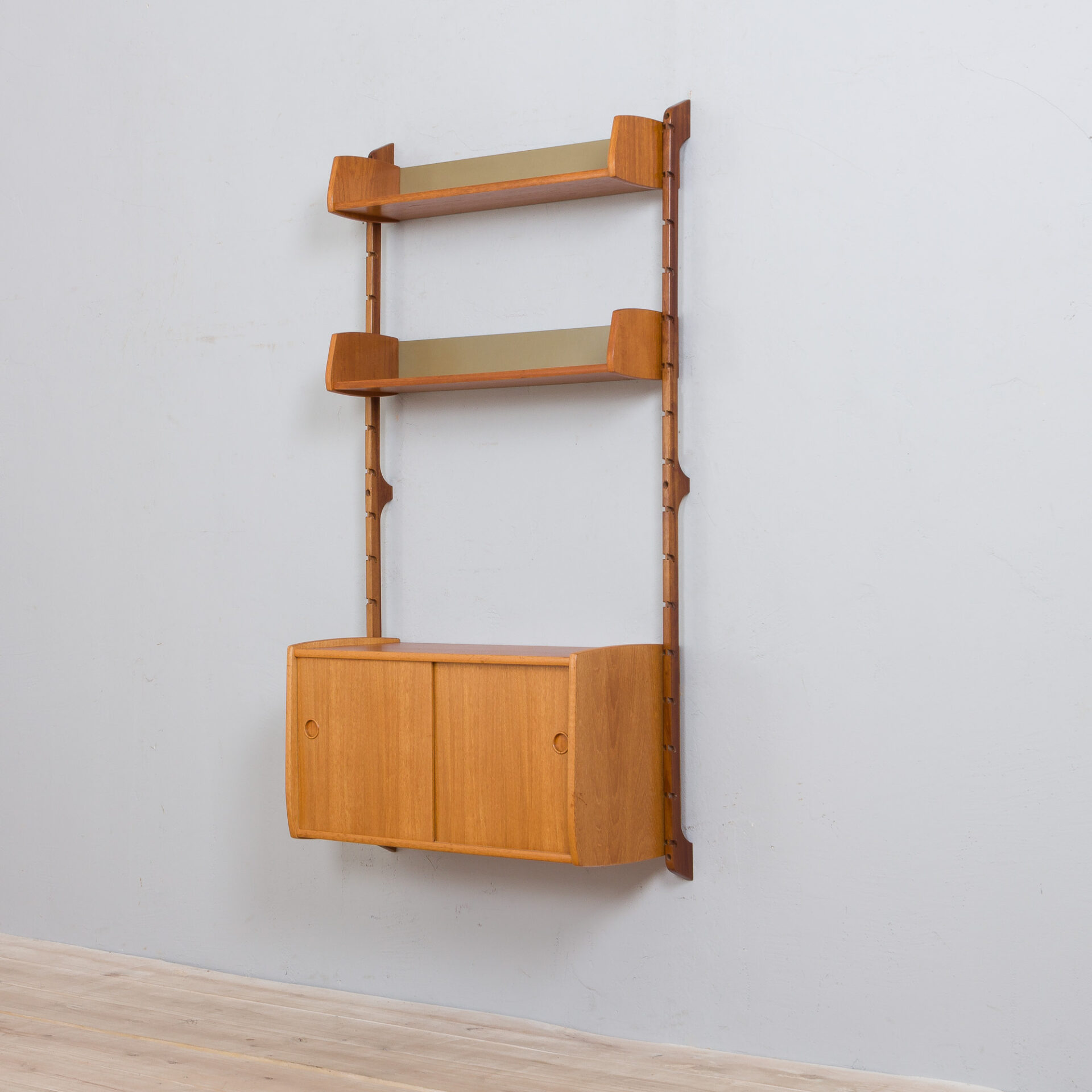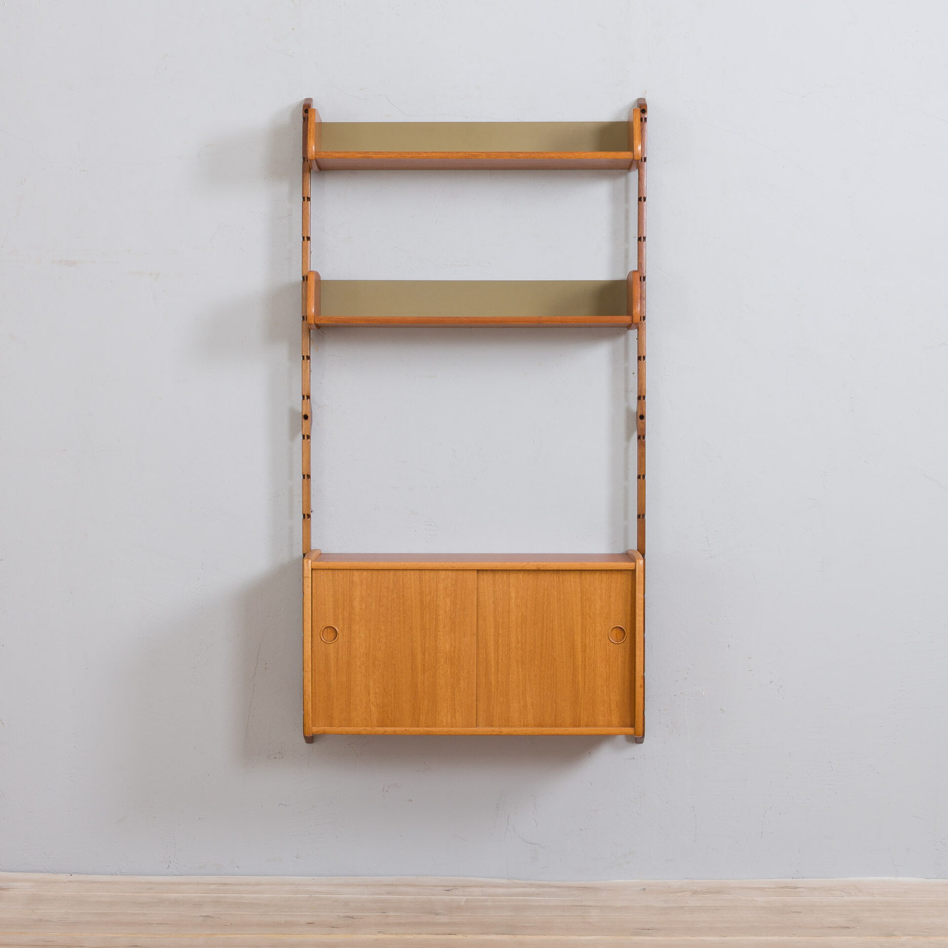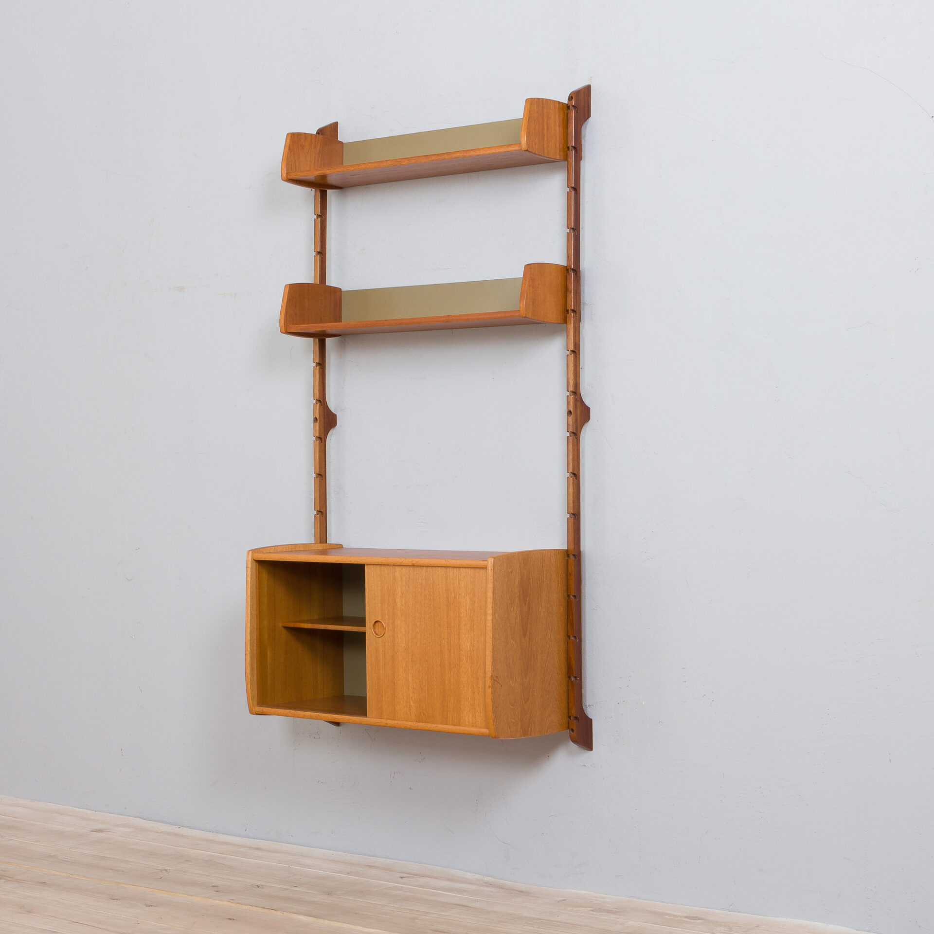 Norwegian wall unit Ergo designed in the 1960s made in light teak with great care of details and carpentry solutions. Delicate lines enhance the mid century look of this piece. It will nicely fit a small living space or an entry hall. The unit consists of:
