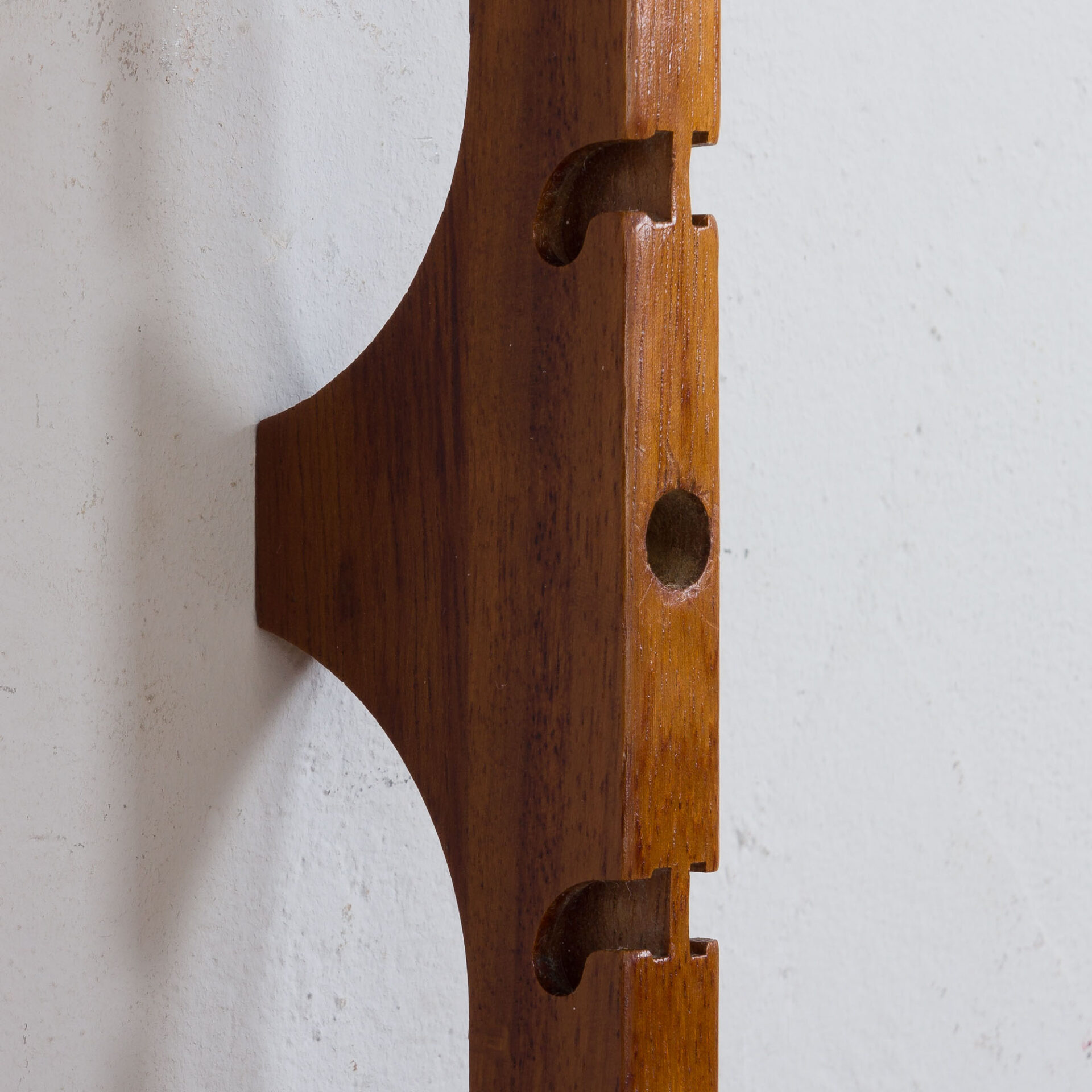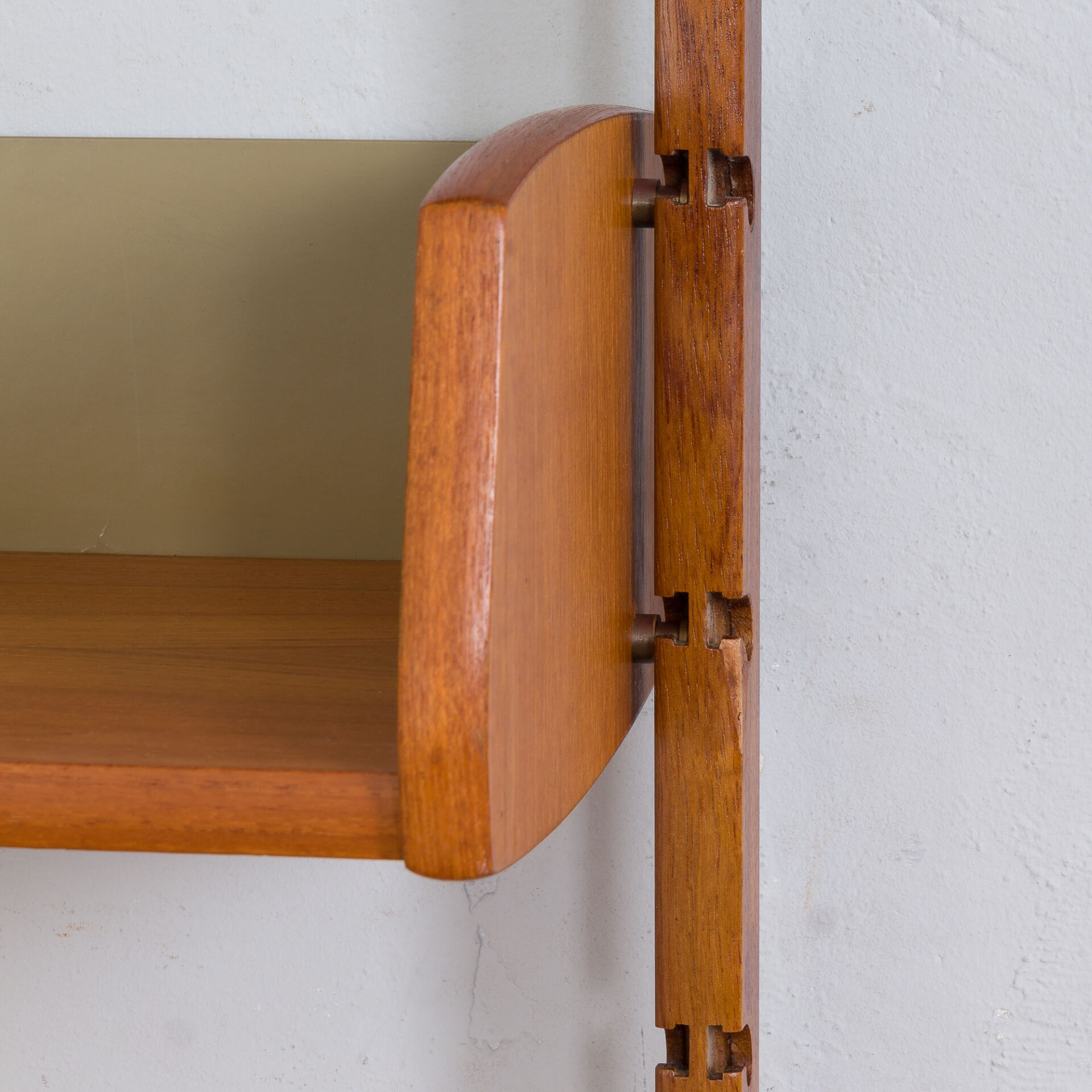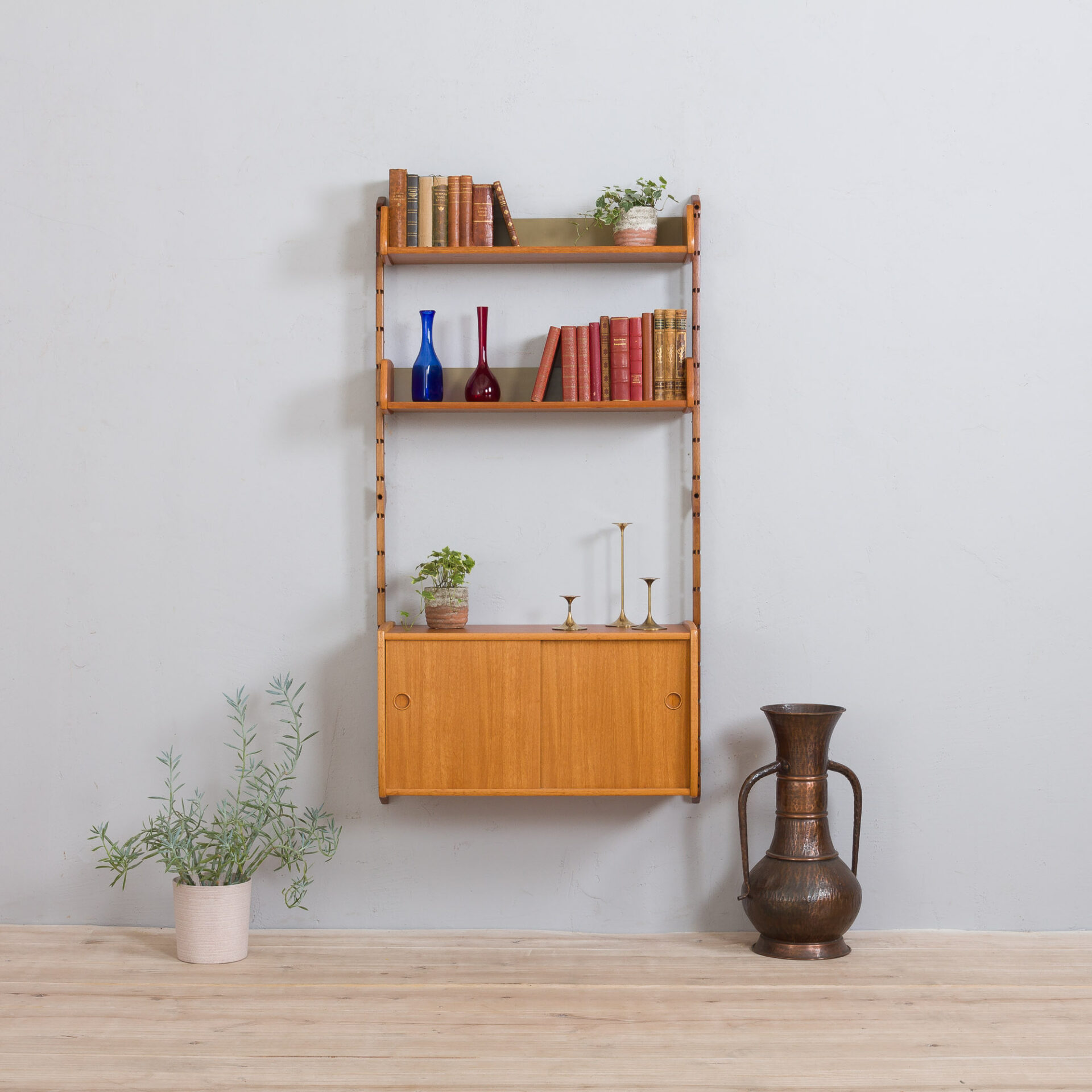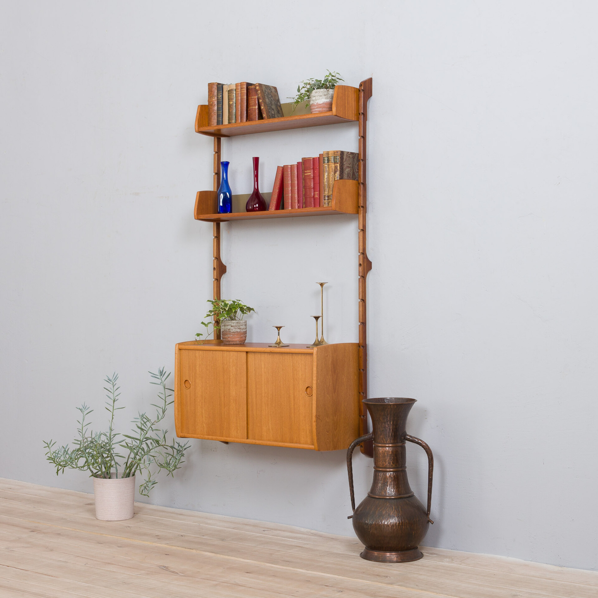 Norwegian wall unit Ergo designed in the 1960s made in light teak with great care of details and carpentry solutions. Delicate lines enhance the mid century look of this piece. It will nicely fit a small living space or an entry hall. The unit consists of: