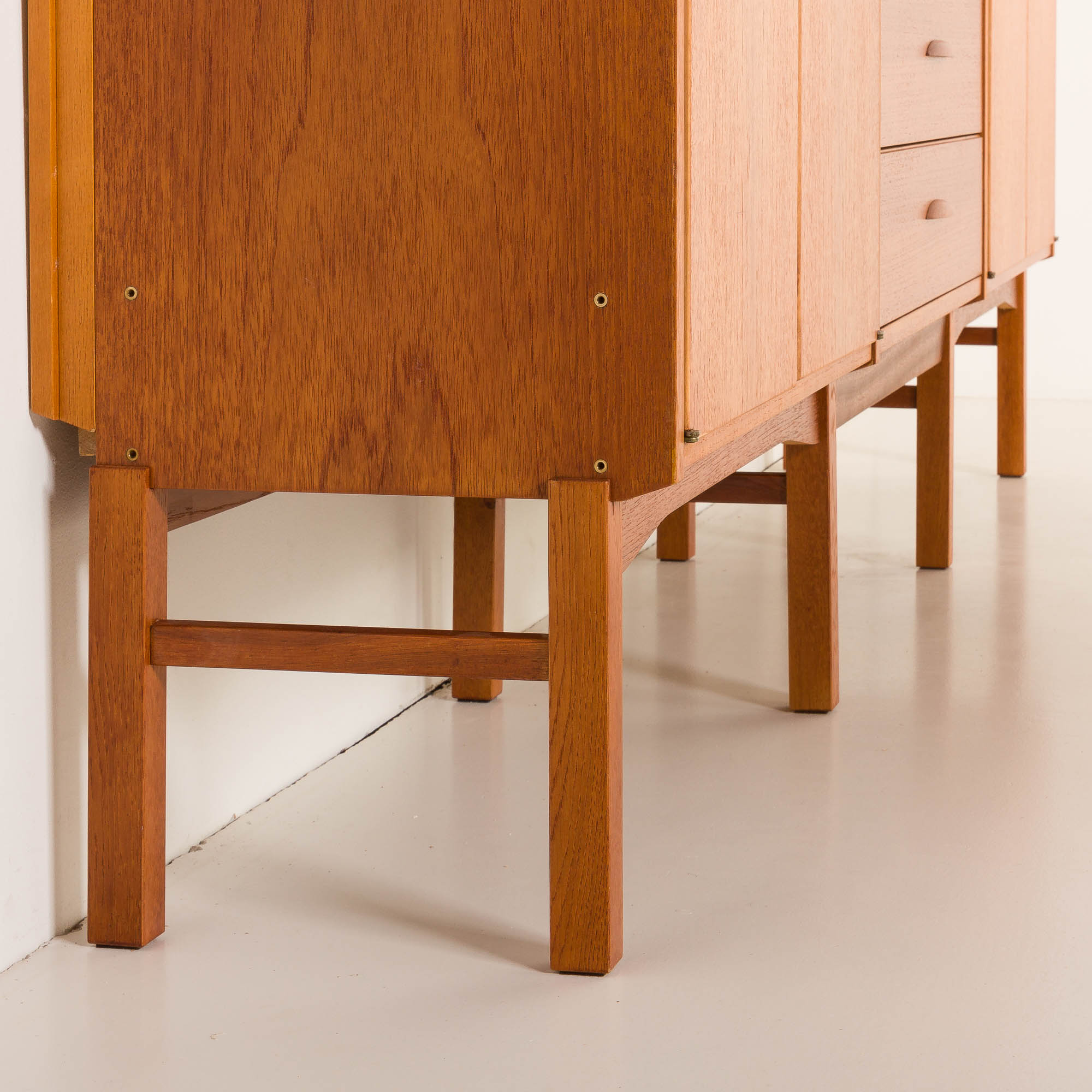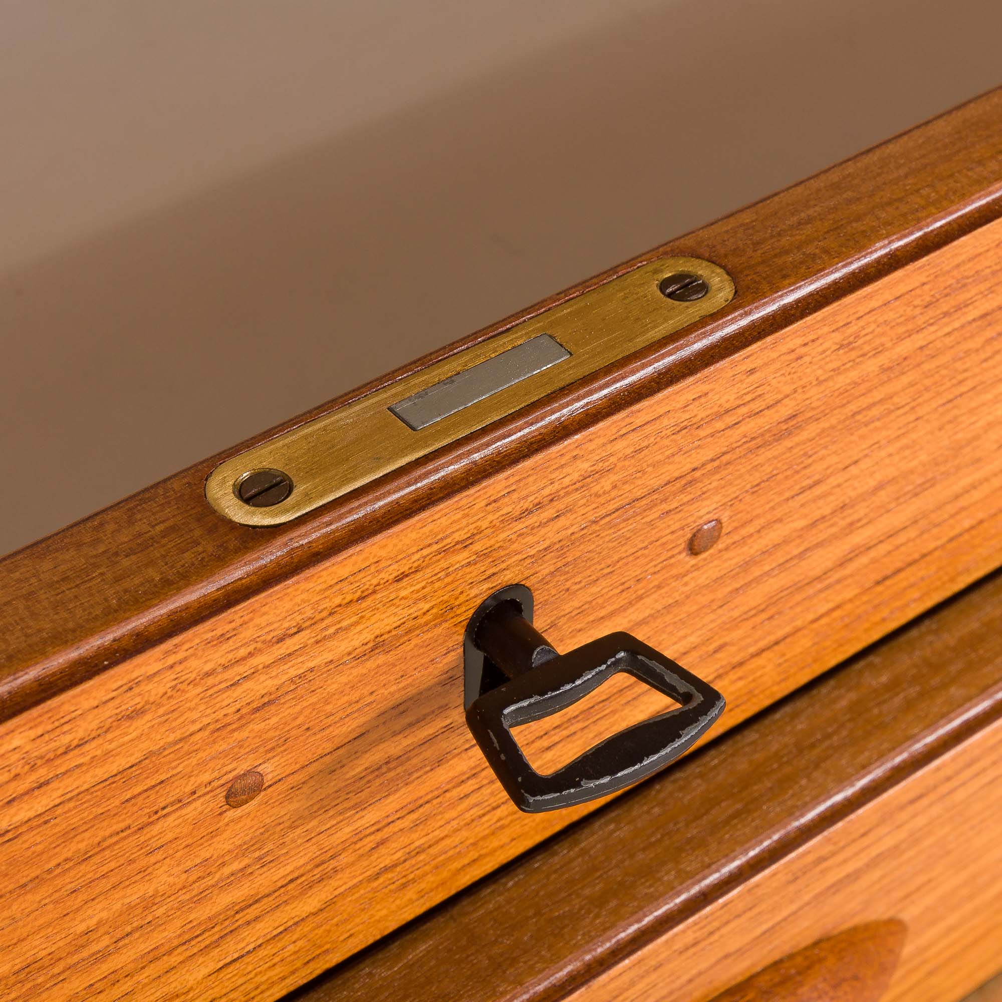 The composition features two upper cabinets with original patterned glass sliding doors, adding a light decorative touch to the elegant teak structure. Below them are two lockable drawers, ideal for small items or documents, and a practical central shelf suitable for displaying vinyl records, plates, or books. The lower section consists of two side cabinets with hinged doors and internal shelves, and a central chest with four drawers—one of which locks for added utility. The entire piece stands on four solid wood uprights, ensuring both stability and visual lightness. With its combination of storage, display, and fine craftsmanship, this piece is a quintessential example of Norwegian mid-century furniture design.