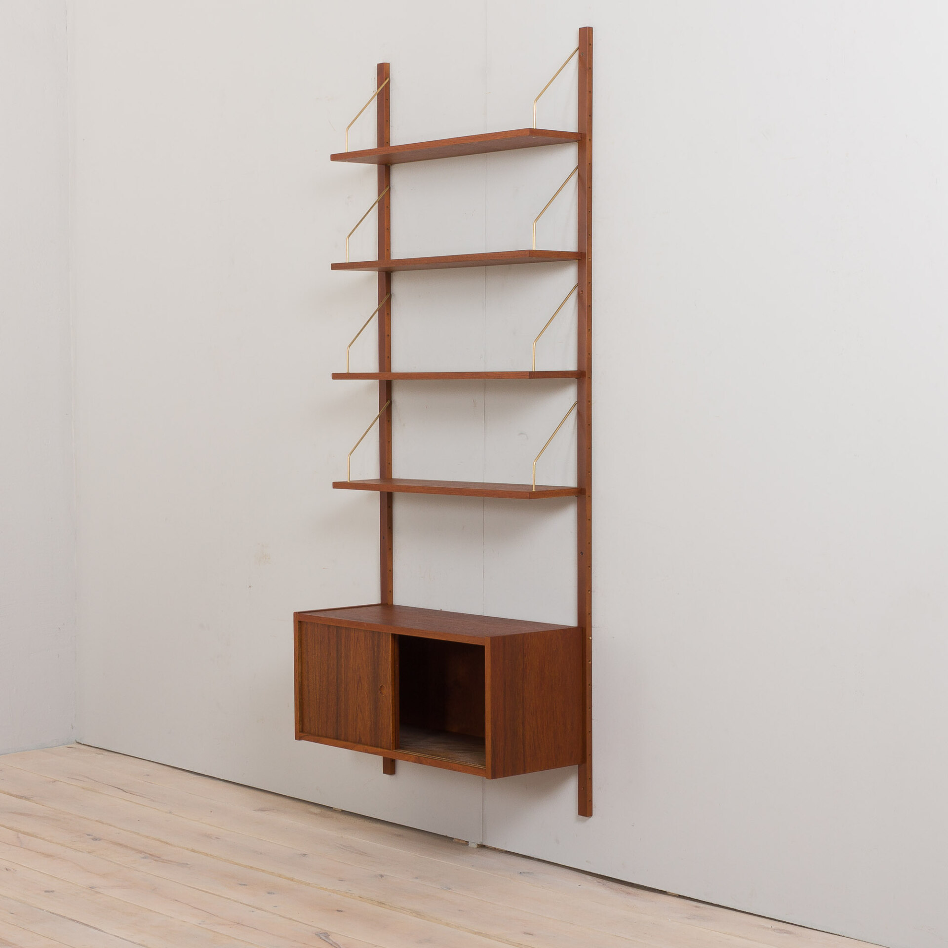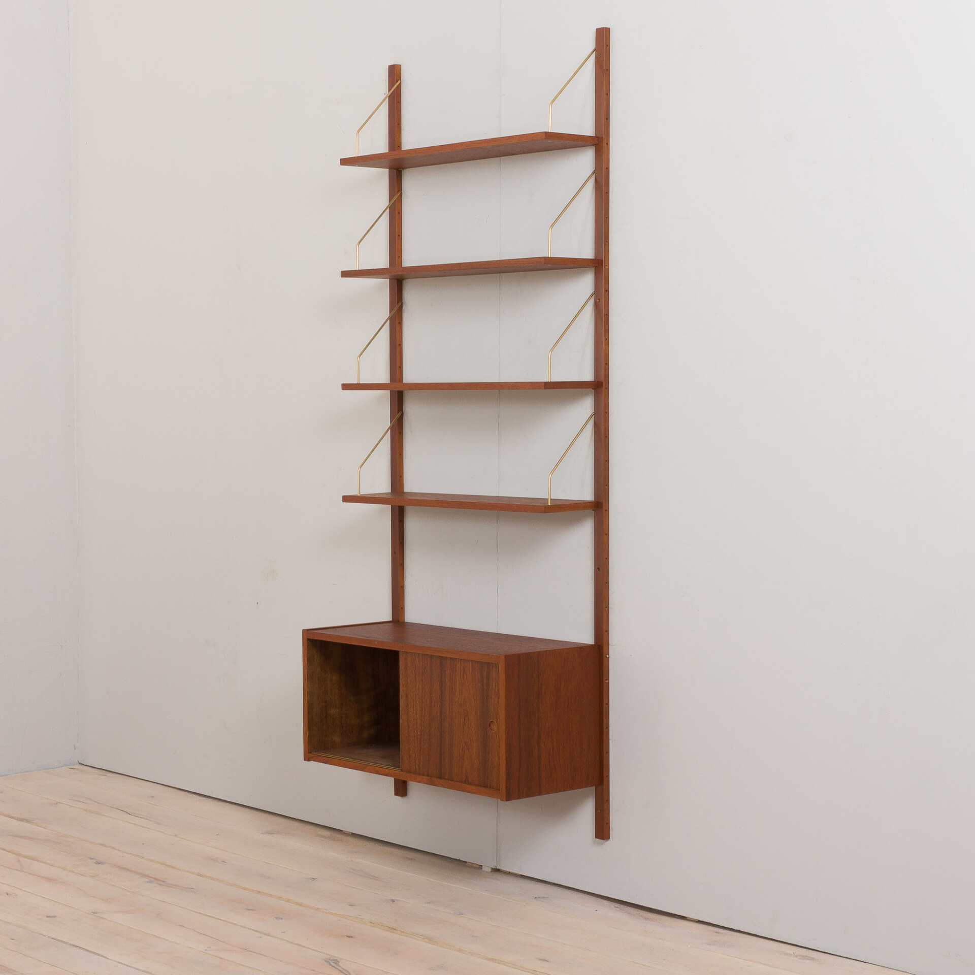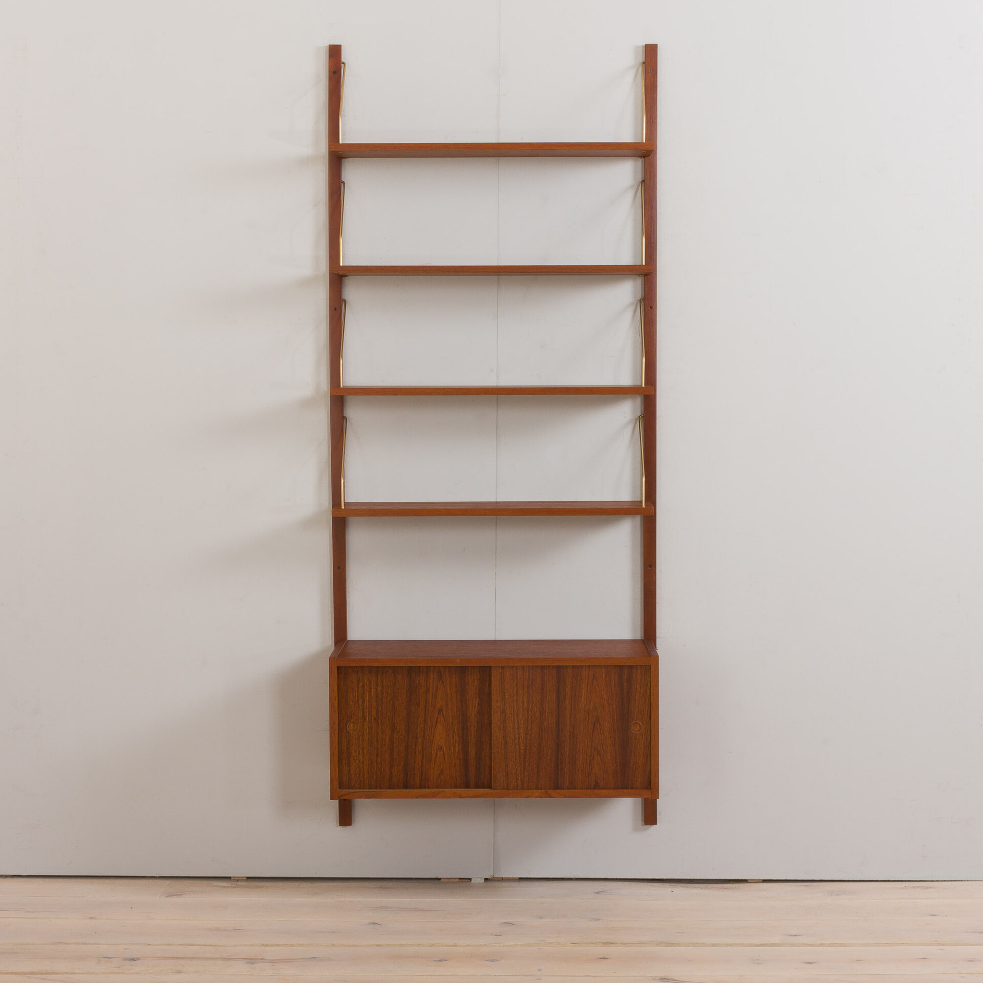 Danish teak wall unit with a cabinet and four shelves, which closely relates to famous Poul Cadovius projects from the 60s. This shelving system is modular. All elements are 80 cm wide and can be arranged upon ones will. This one bay wall unit will enhance any living room or bedroom with a functional storage space for books and decorations.