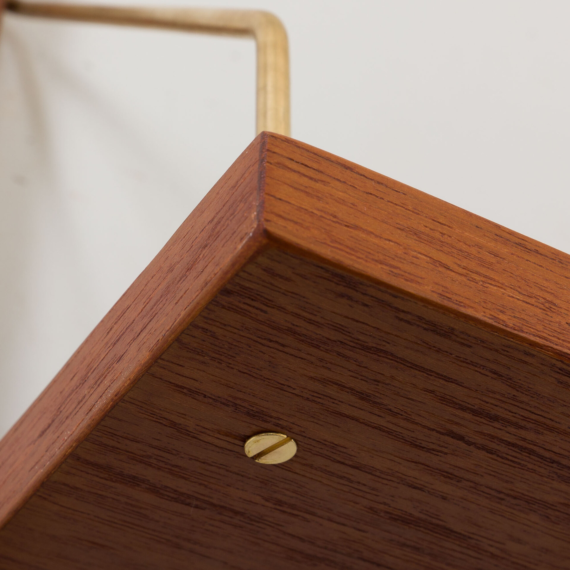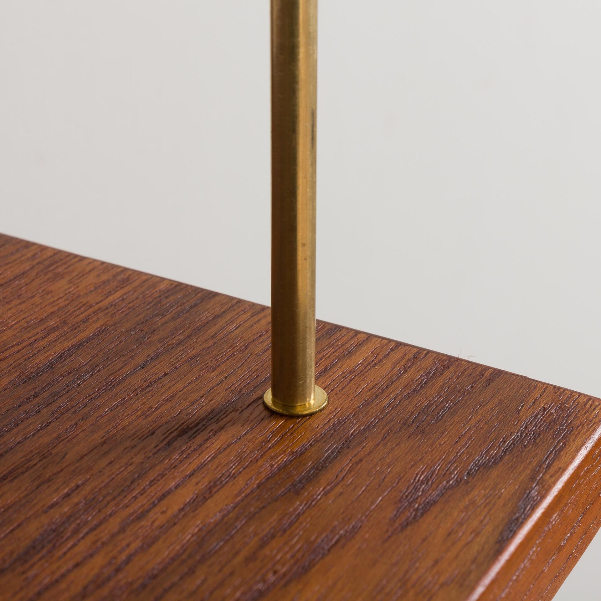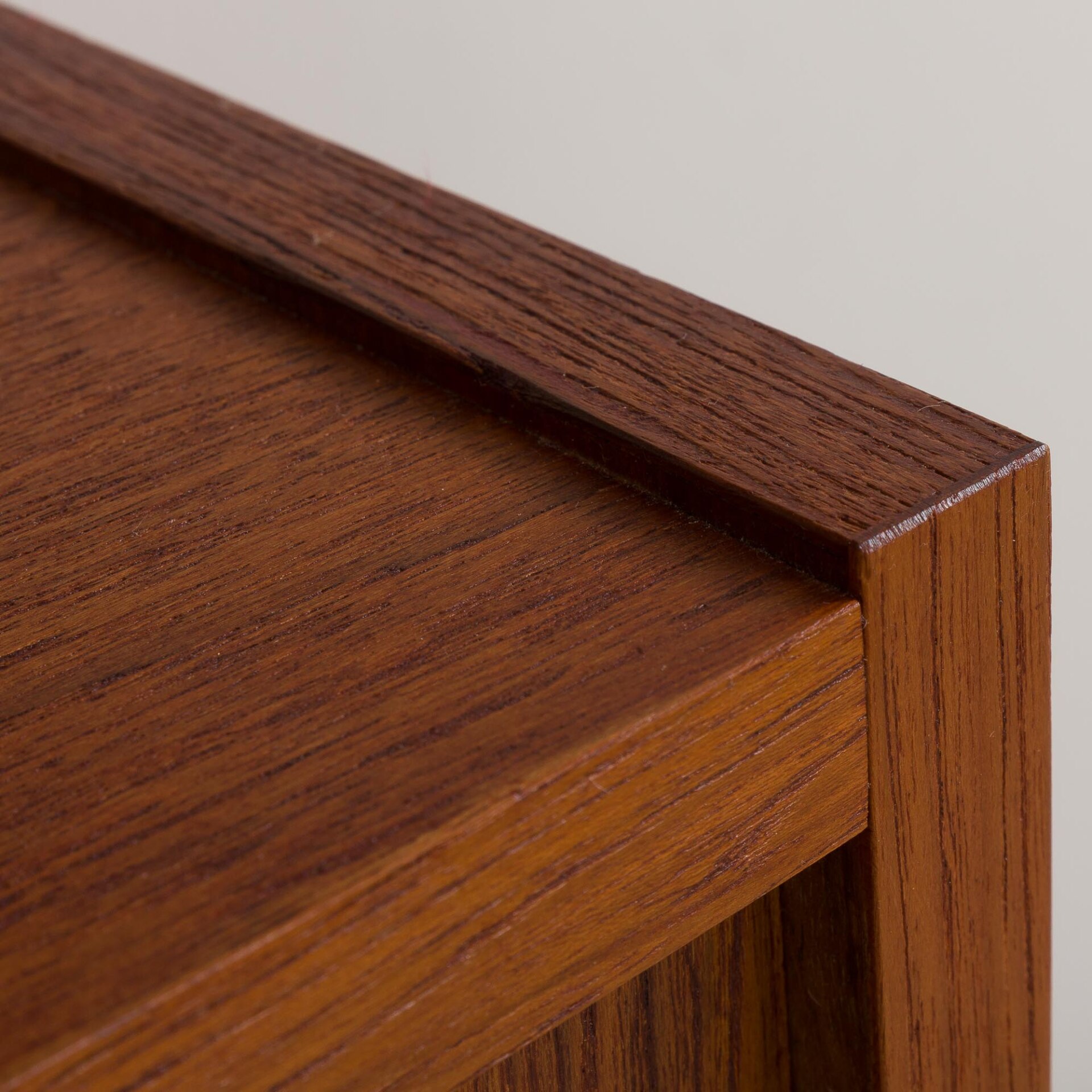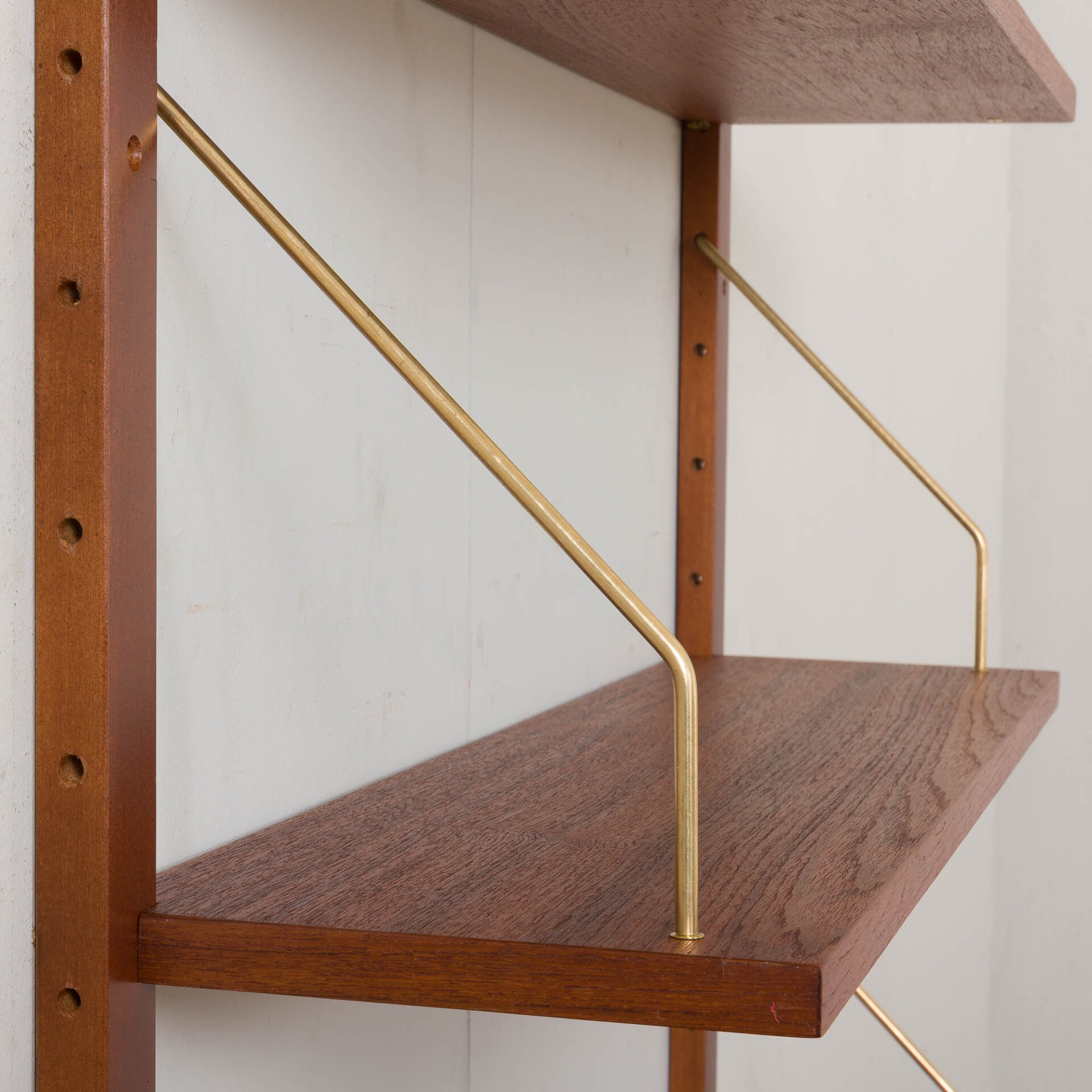 Danish teak wall unit with a cabinet and four shelves, which closely relates to famous Poul Cadovius projects from the 60s. This shelving system is modular. All elements are 80 cm wide and can be arranged upon ones will. This one bay wall unit will enhance any living room or bedroom with a functional storage space for books and decorations.