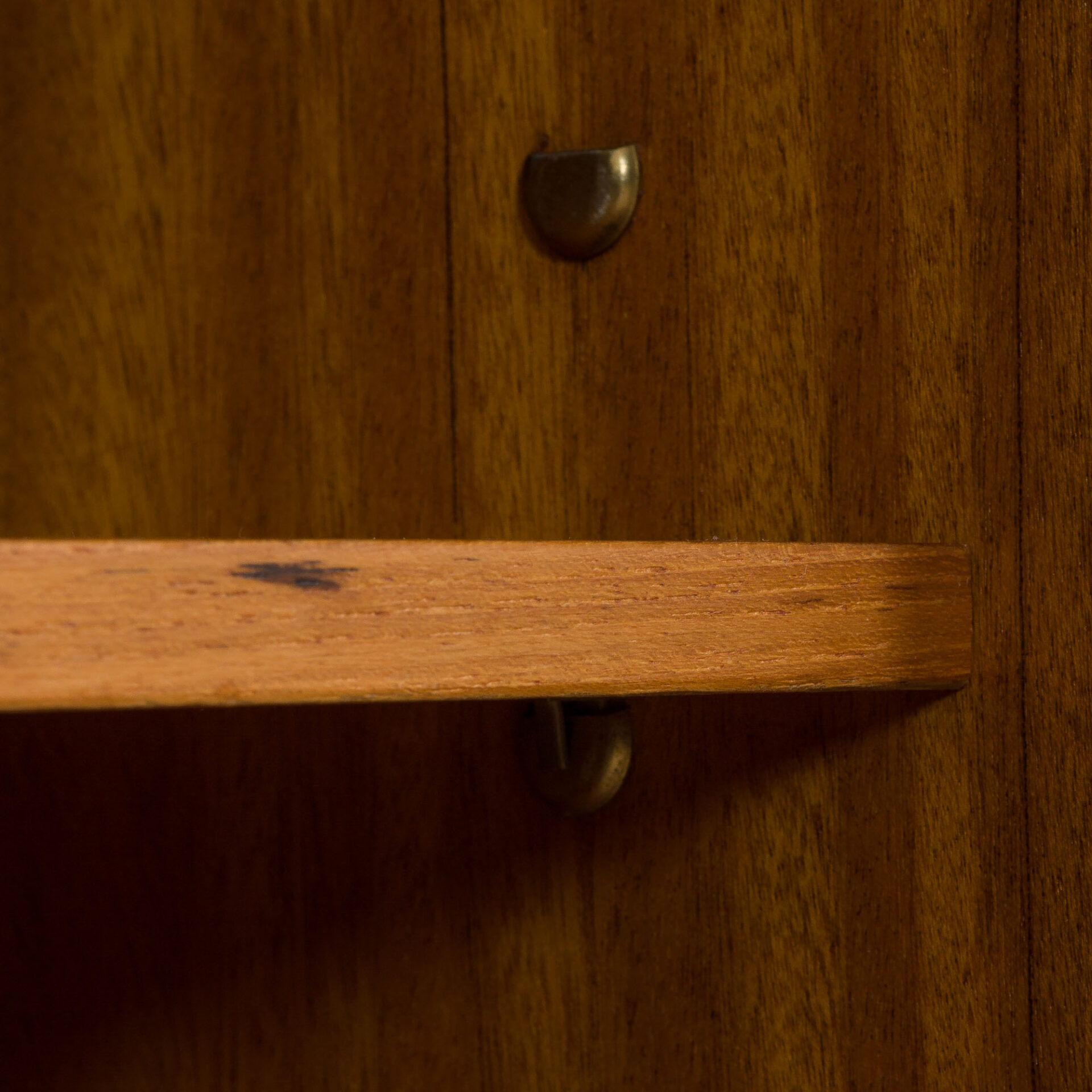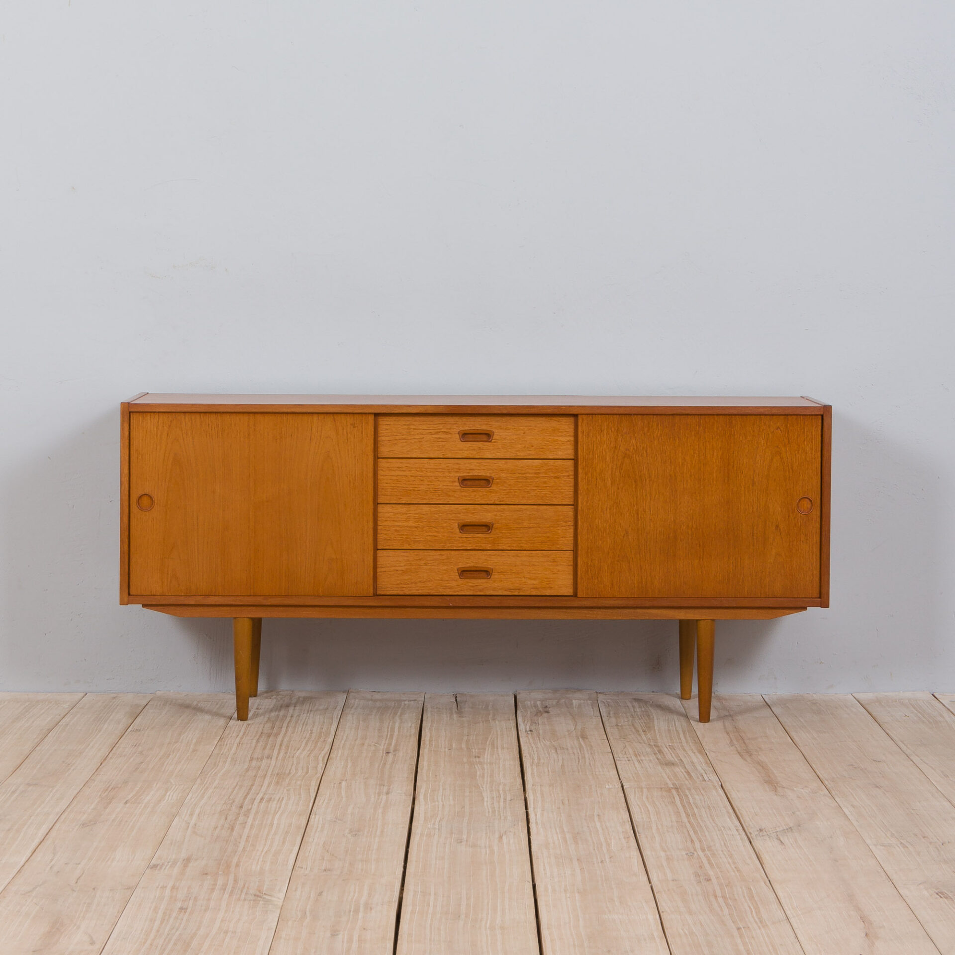 Classic Scandinavian teak sideboard from the 1960s shows the quality of carpentry with solid teak details, especially in nicely sculptured handles. It features four drawers and two compartments with sliding doors symmetrically placed on both sides. Slender and tapered solid teak legs give lightness to the whole piece of furniture, emphasizing its Scandinavian origin. Overall in very good vintage condition with minor traces of use. Drawers are clean and unscented.