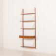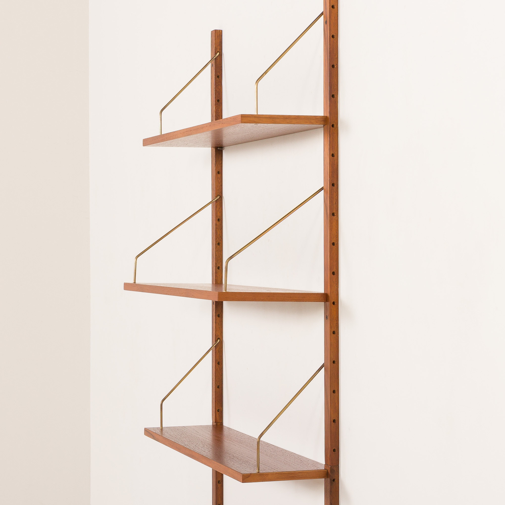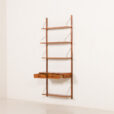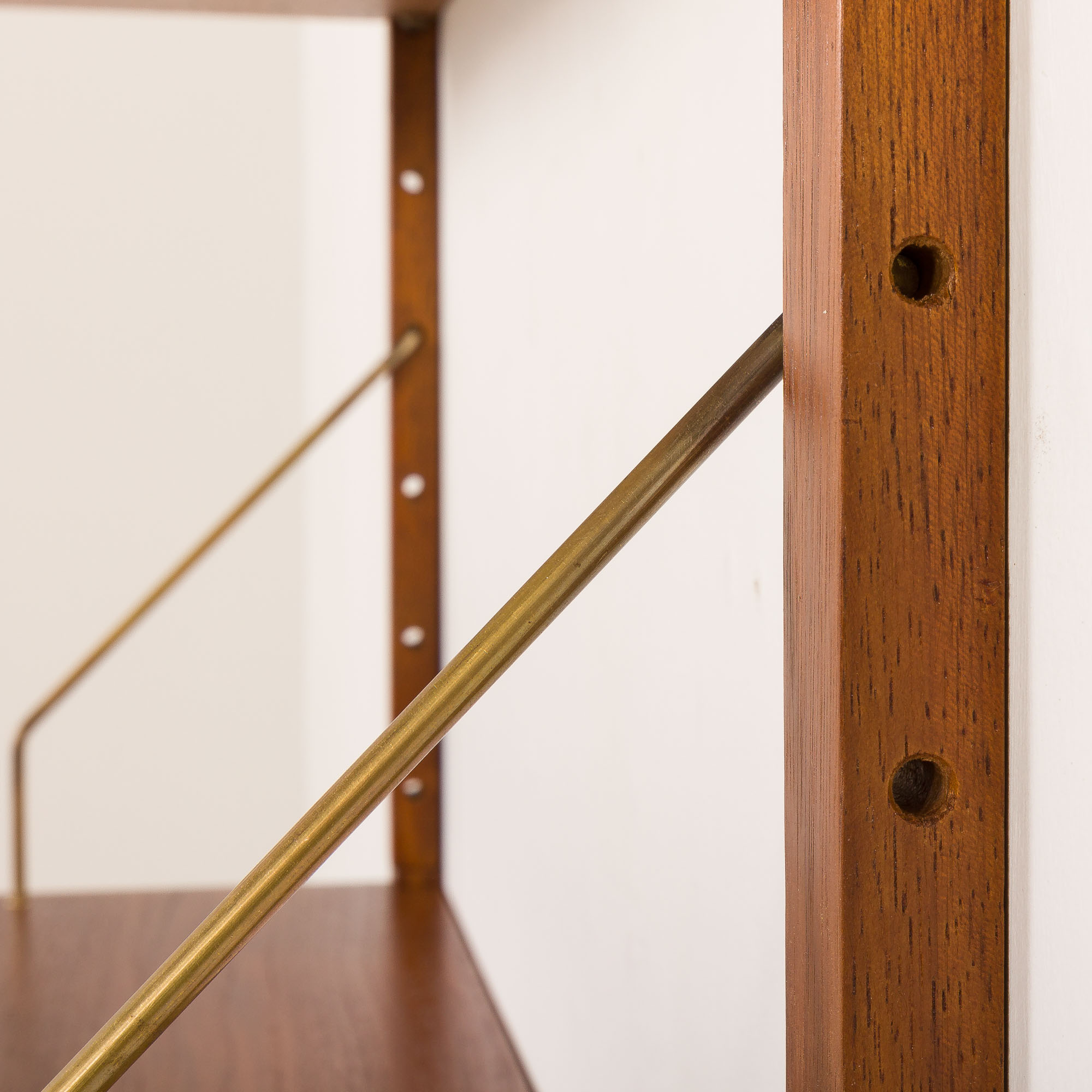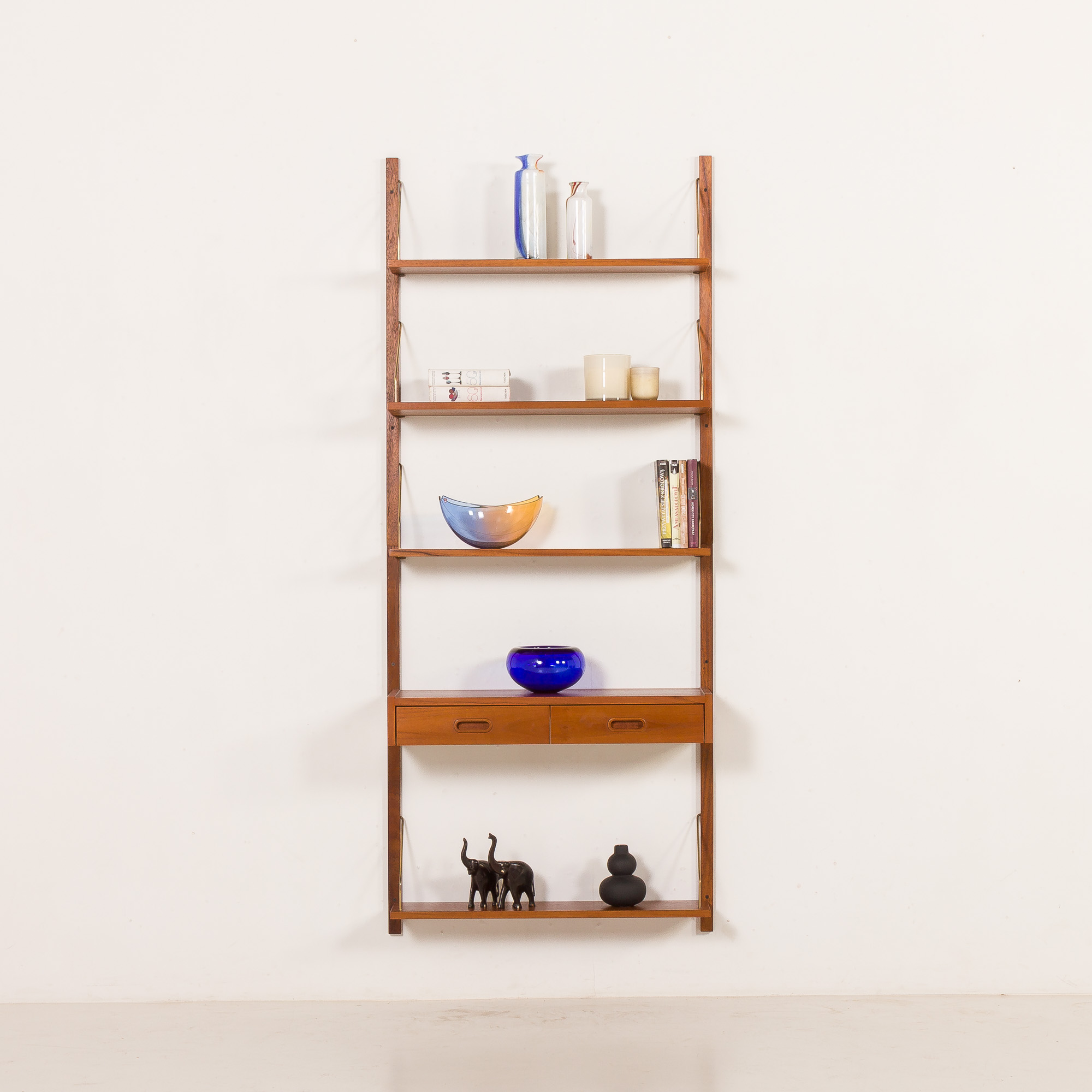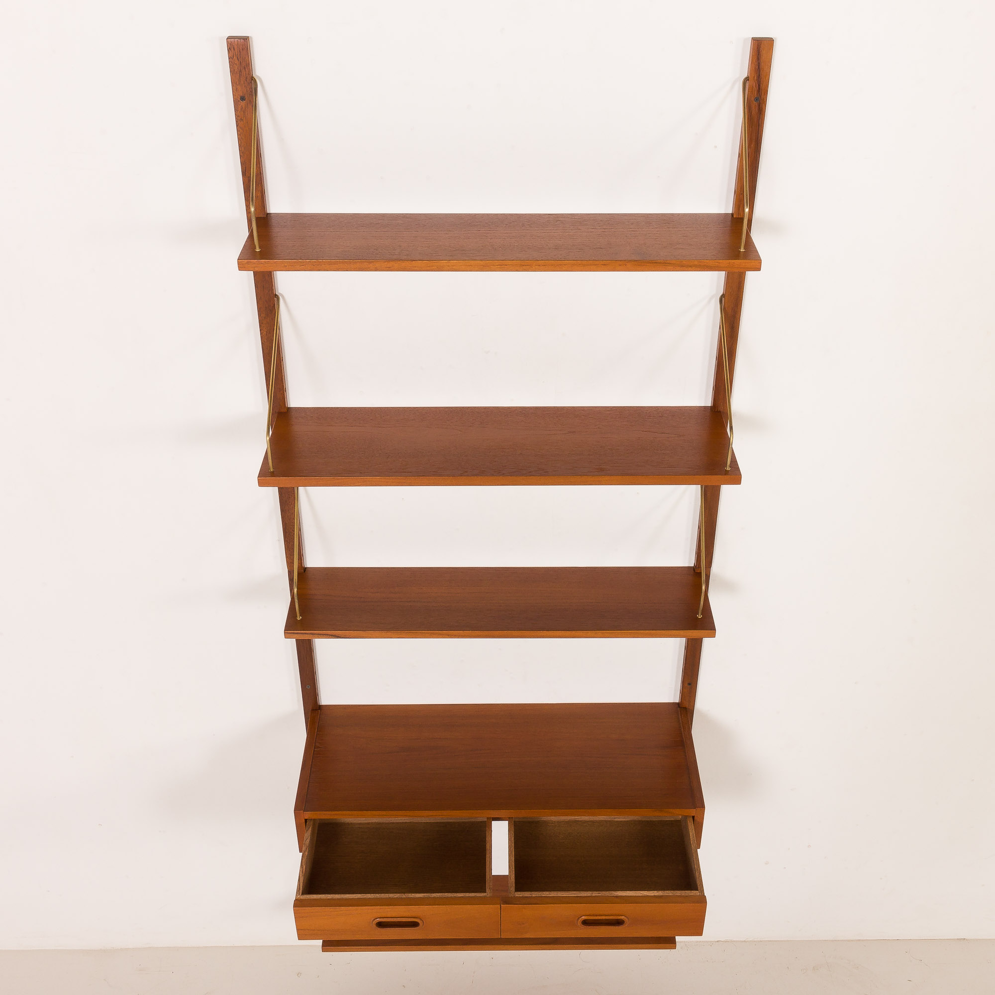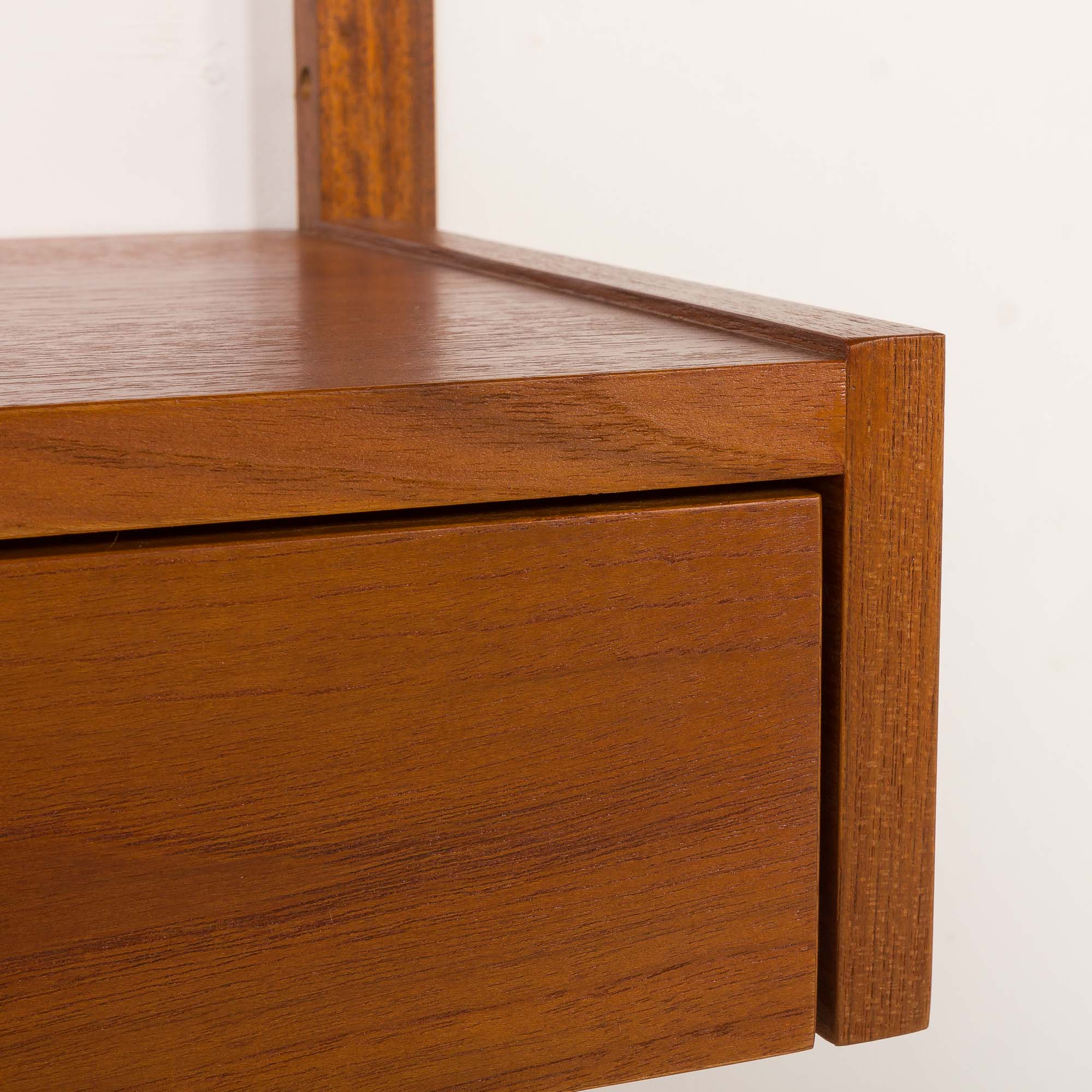 This Scandinavian vintage wall unit in teak was made in Denmark some time in the 1960s. The same period and very similar to famous Poul Cadovius projects. It features four shelves and a console with two drawers.