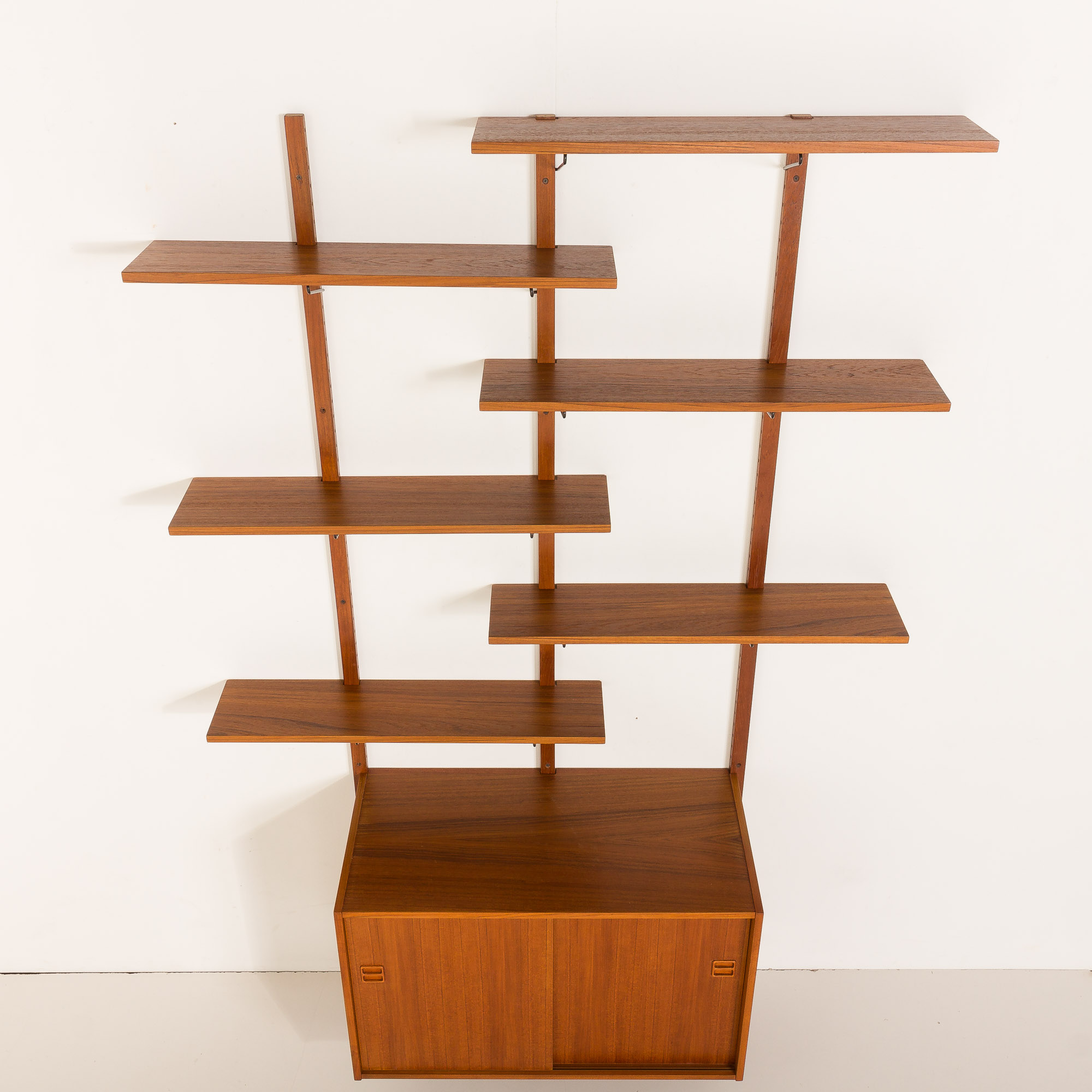 Scandinavian vintage teak wall unit, probably made in Denmark some time in the 1970s. This bookcase was completely renovated and features six shelves and one cabinet with sliding doors. Shelves arranged alternately add lightness and create a visually dynamic and unique look. Shelves are mounted with black metal hangers on solid wood rails, and they can be placed lower or higher using regularly placed slots in the rails. Moreover, it is possible to position the longer edge of the shelf either outside or inside the rails. All of this makes the piece not only stylish but also functional.