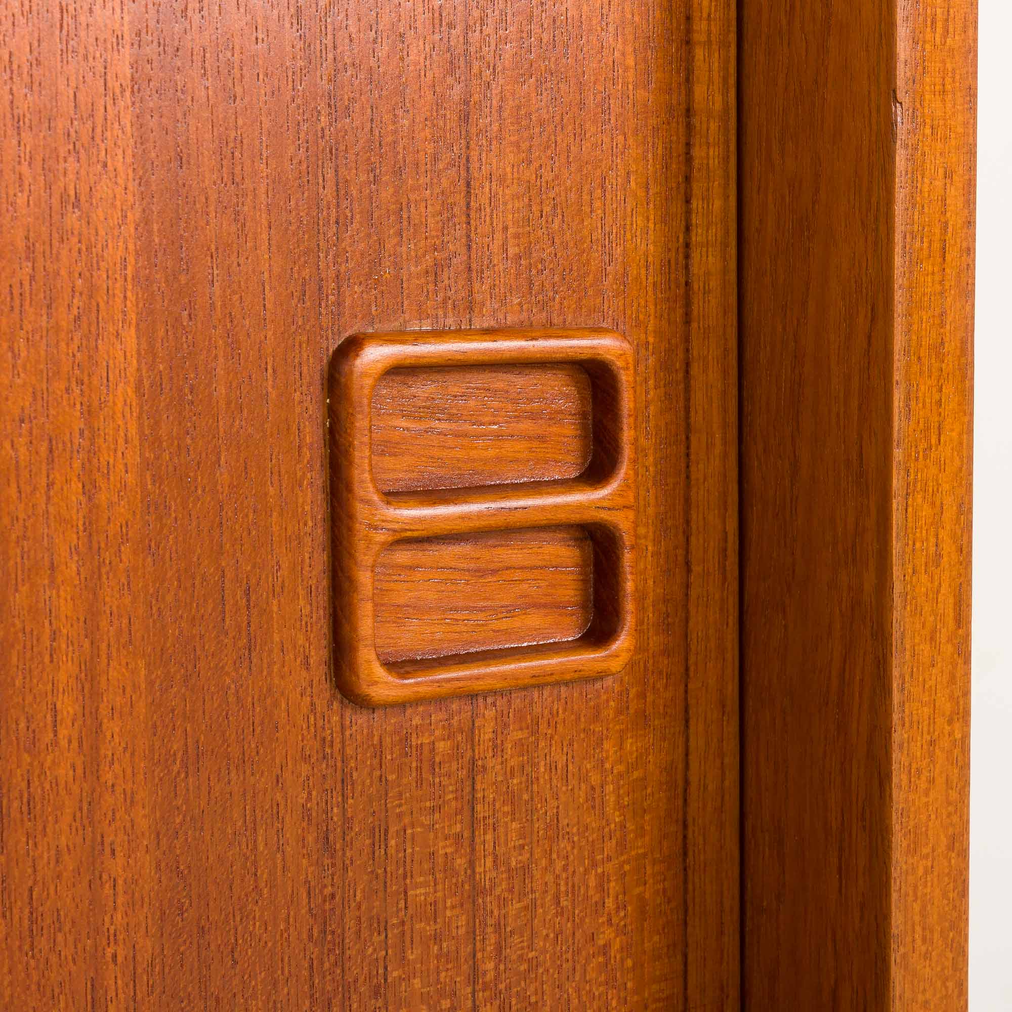 The wall unit has been upcycled. We use old and new parts to revive the units that are incomplete or severely damaged. All the wood is being sanded down, and we apply coats of stain to uniform the look. Later we finish it with several layers of Danish oil. The doors have been checked and work smoothly. Overall, in great original vintage condition.