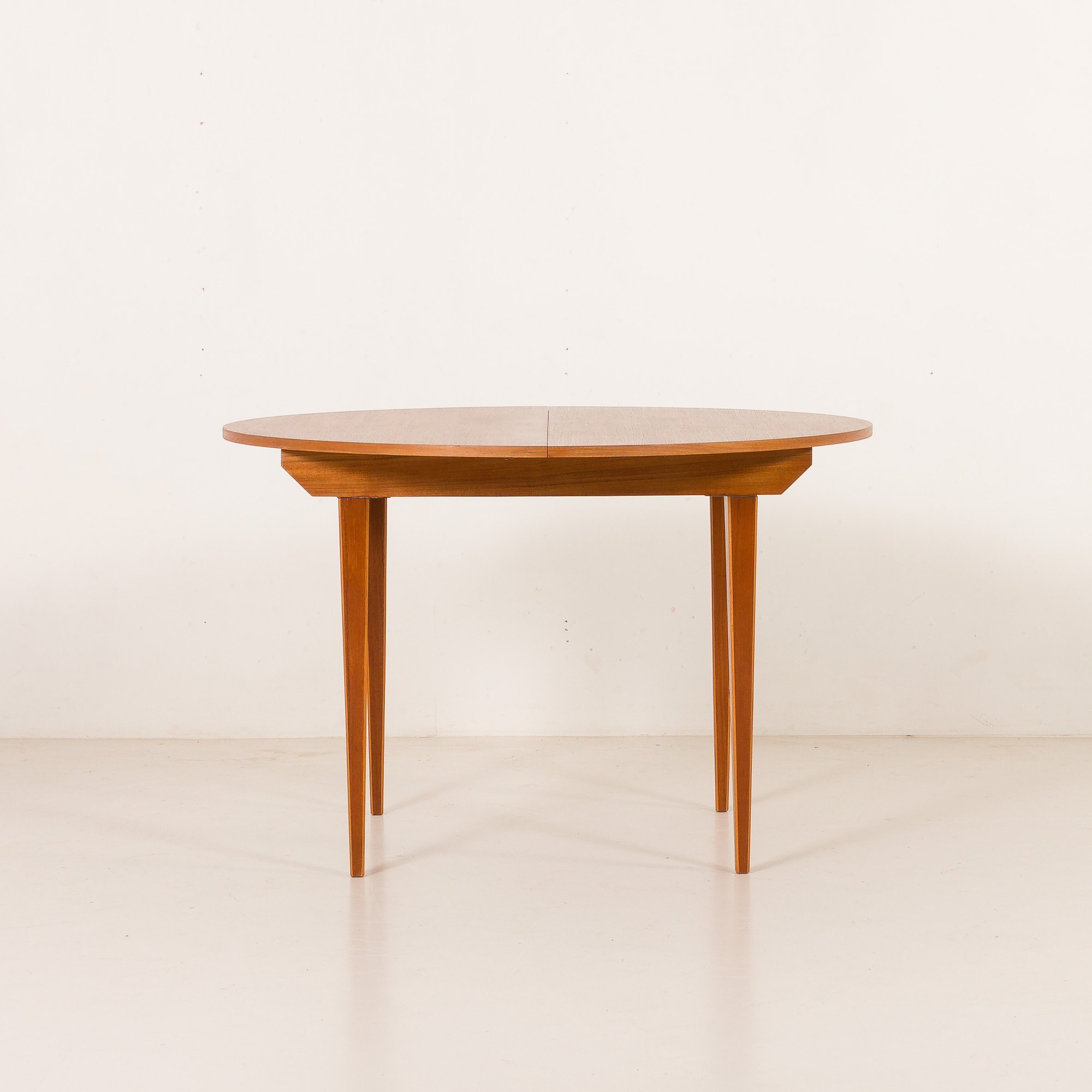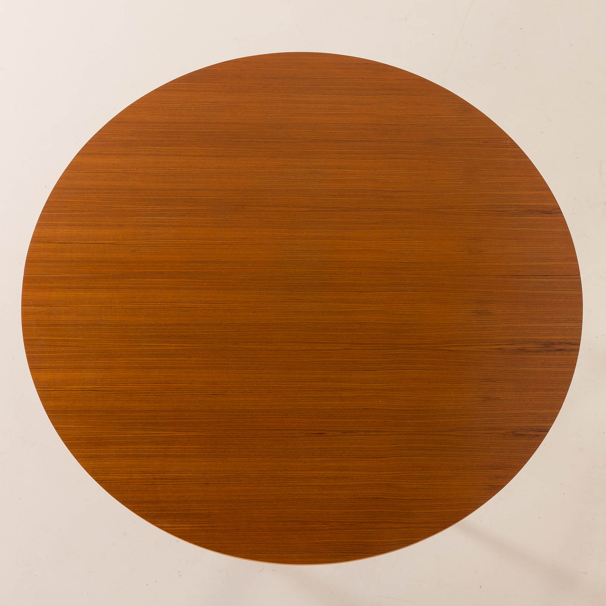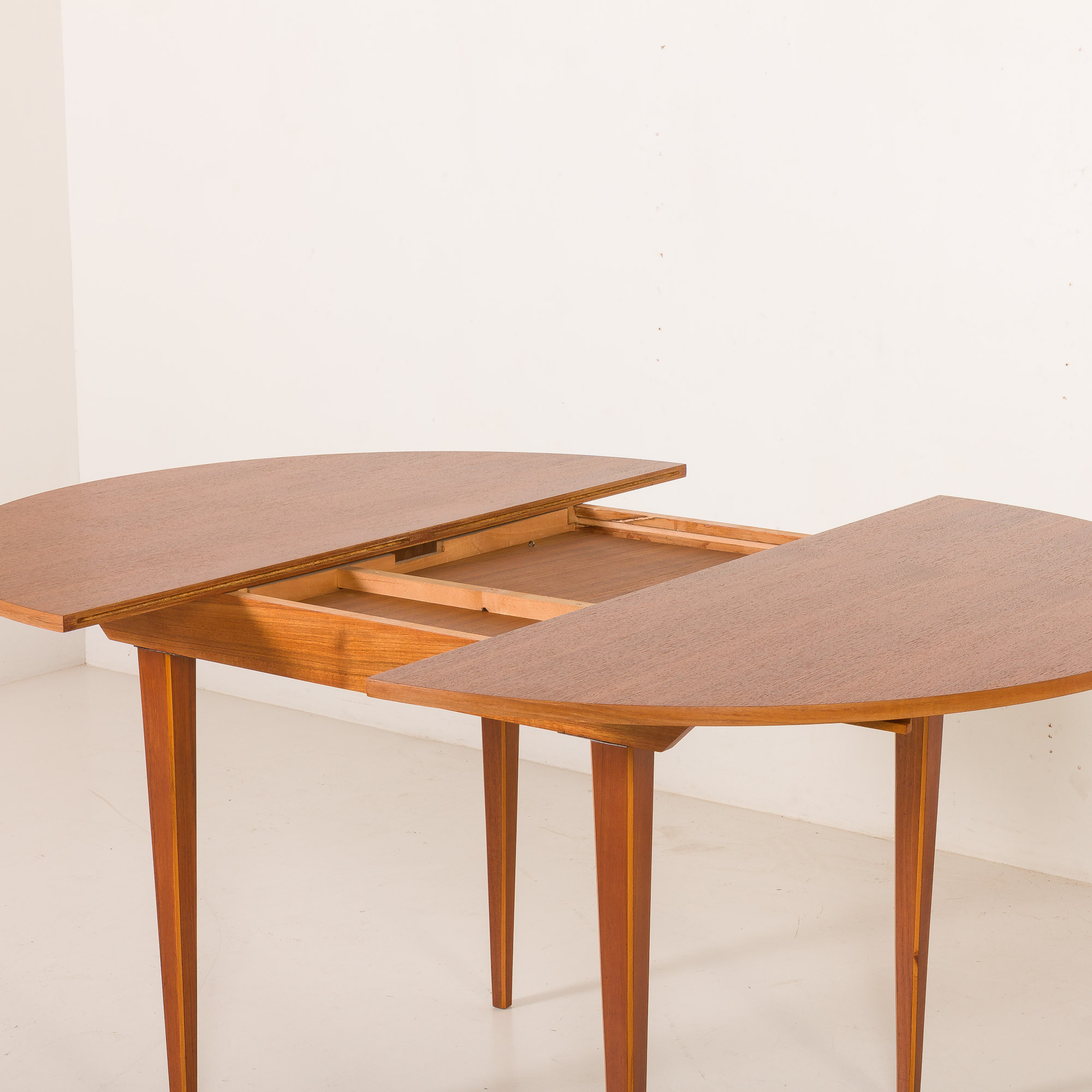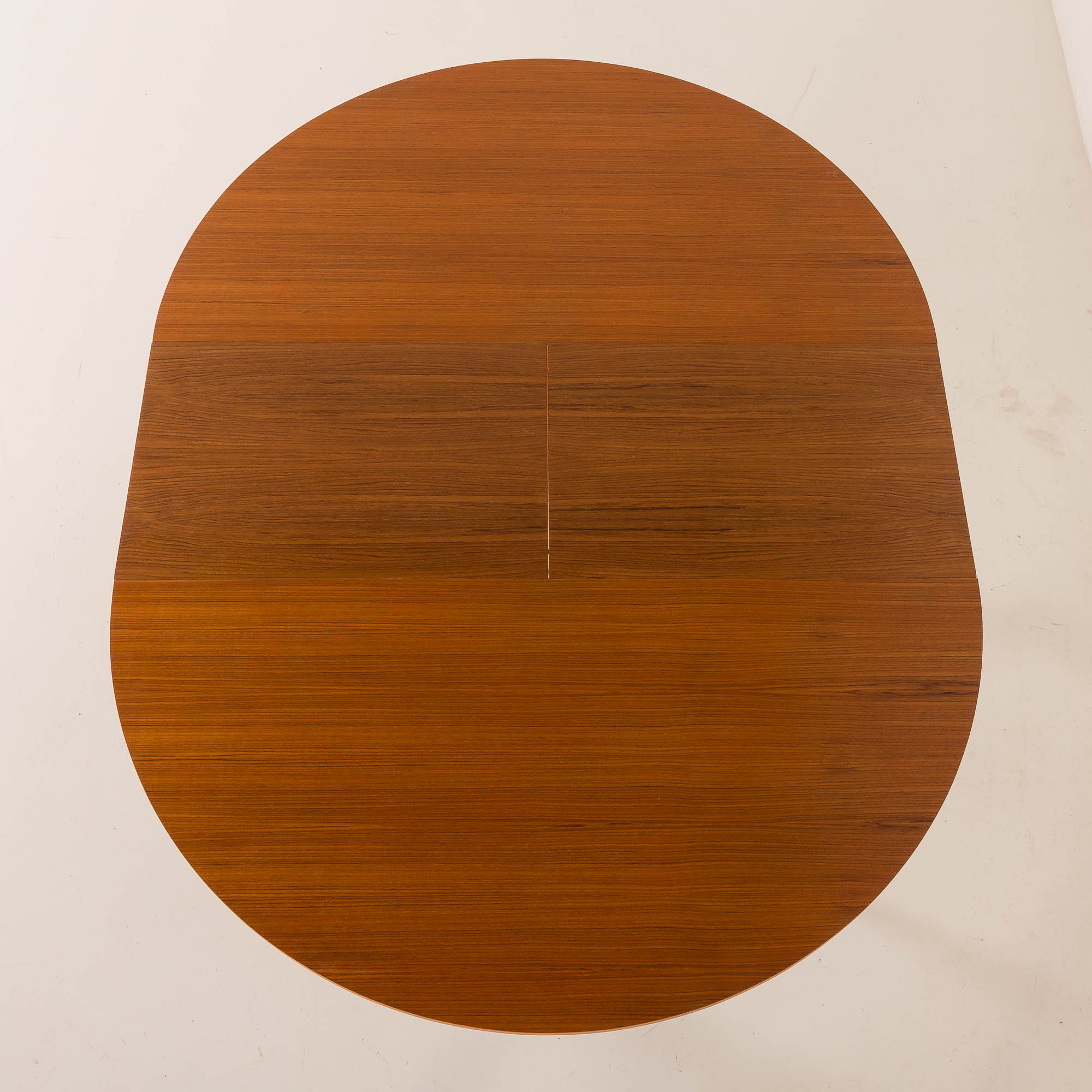 The table is crafted from teak, showcasing beautifully patterned veneer that highlights the natural beauty of the material. The table has one inner folded leaf. The extended table creates a beautiful oval shape and can be comfortably used by 6 people. The inner leaf is in slightly different veneer. In smaller Danish homes from the mid-20th century, there was not so much space, and it seems like the tables were rarely open.