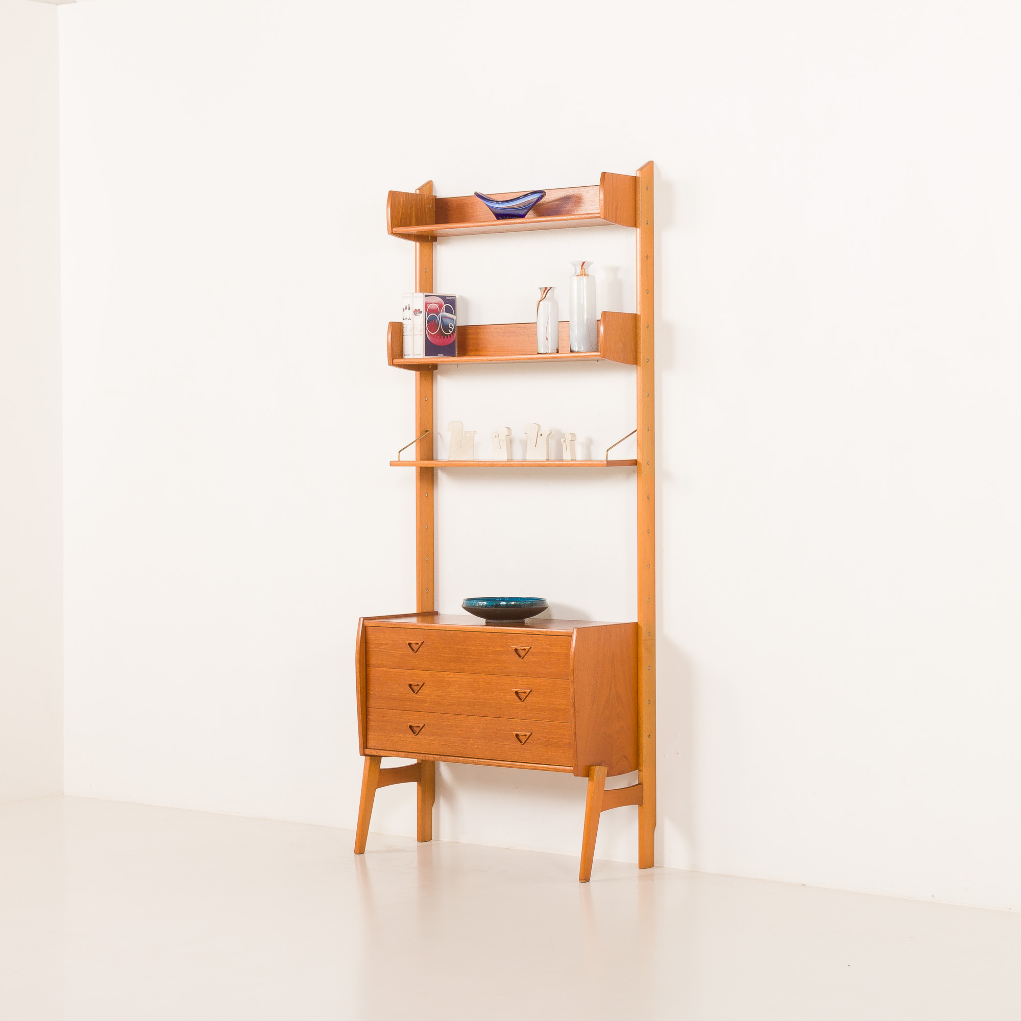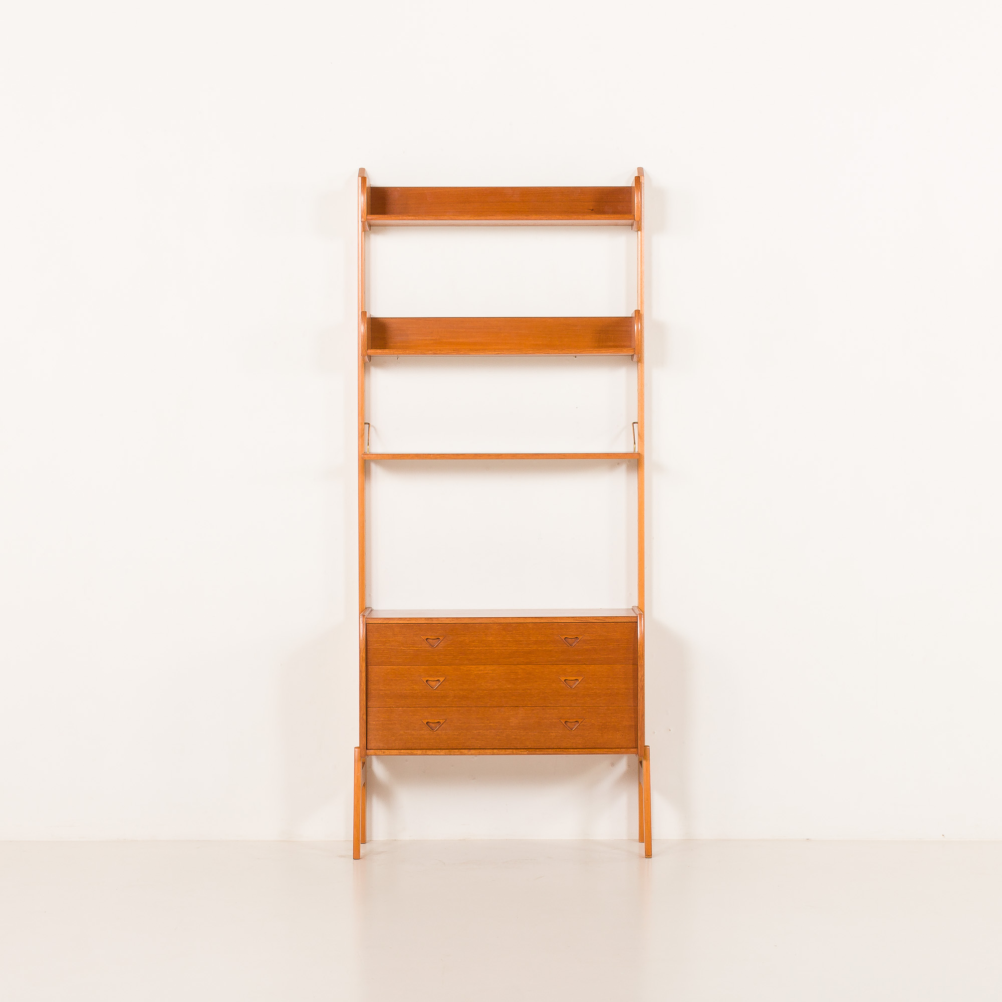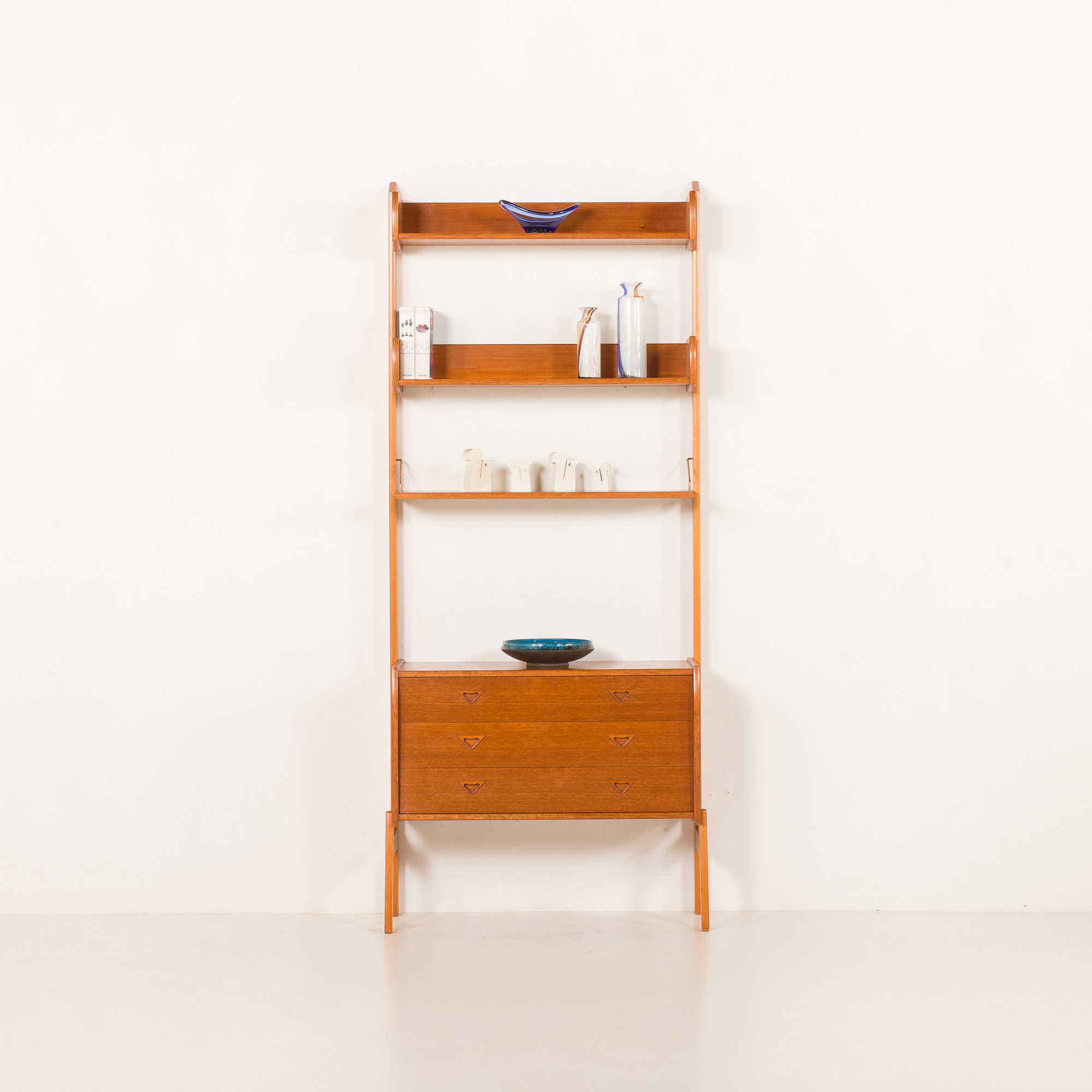 Crafted from warm-hued teak wood, this freestanding bookcase showcases a beautiful wood grain pattern. The use of high-quality teak wood and teak veneer ensures the durability and longevity of the piece. Attention to detail is evident in the nicely sculpted handles and slightly rounded edges, reflecting the artistry of Scandinavian craftsmen. The minimalist vertical supports and slim legs add visual interest and give it a lighter, more airy presence without compromising stability. The unique montage system uses screws hidden within the wooden structure, making the junction points of the components nearly invisible.