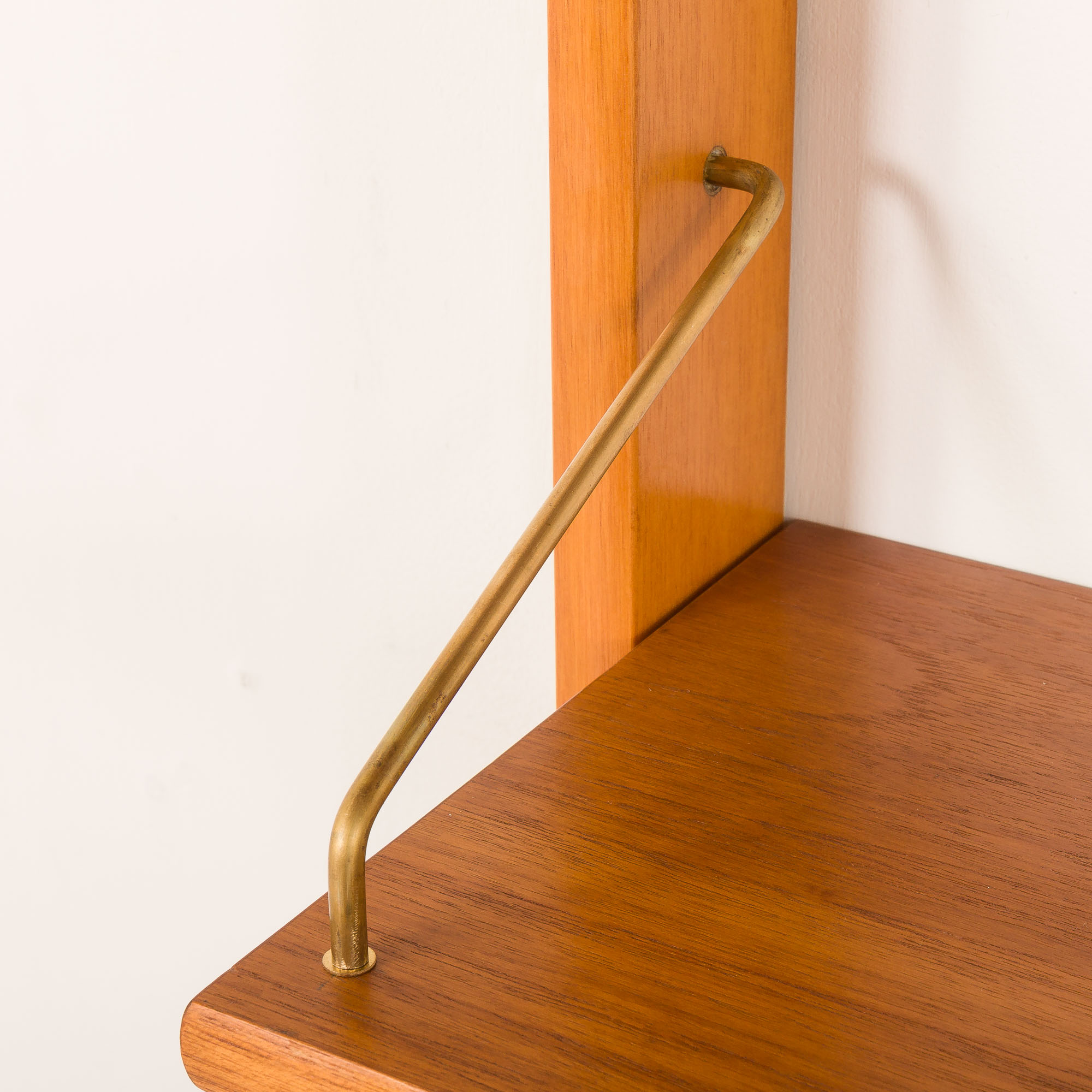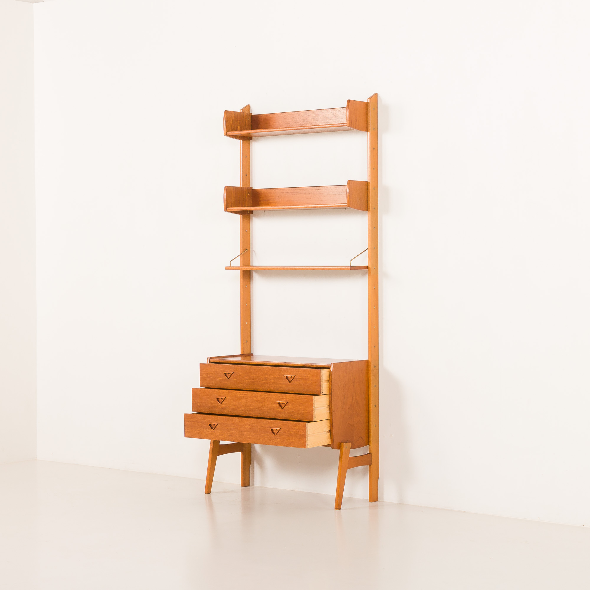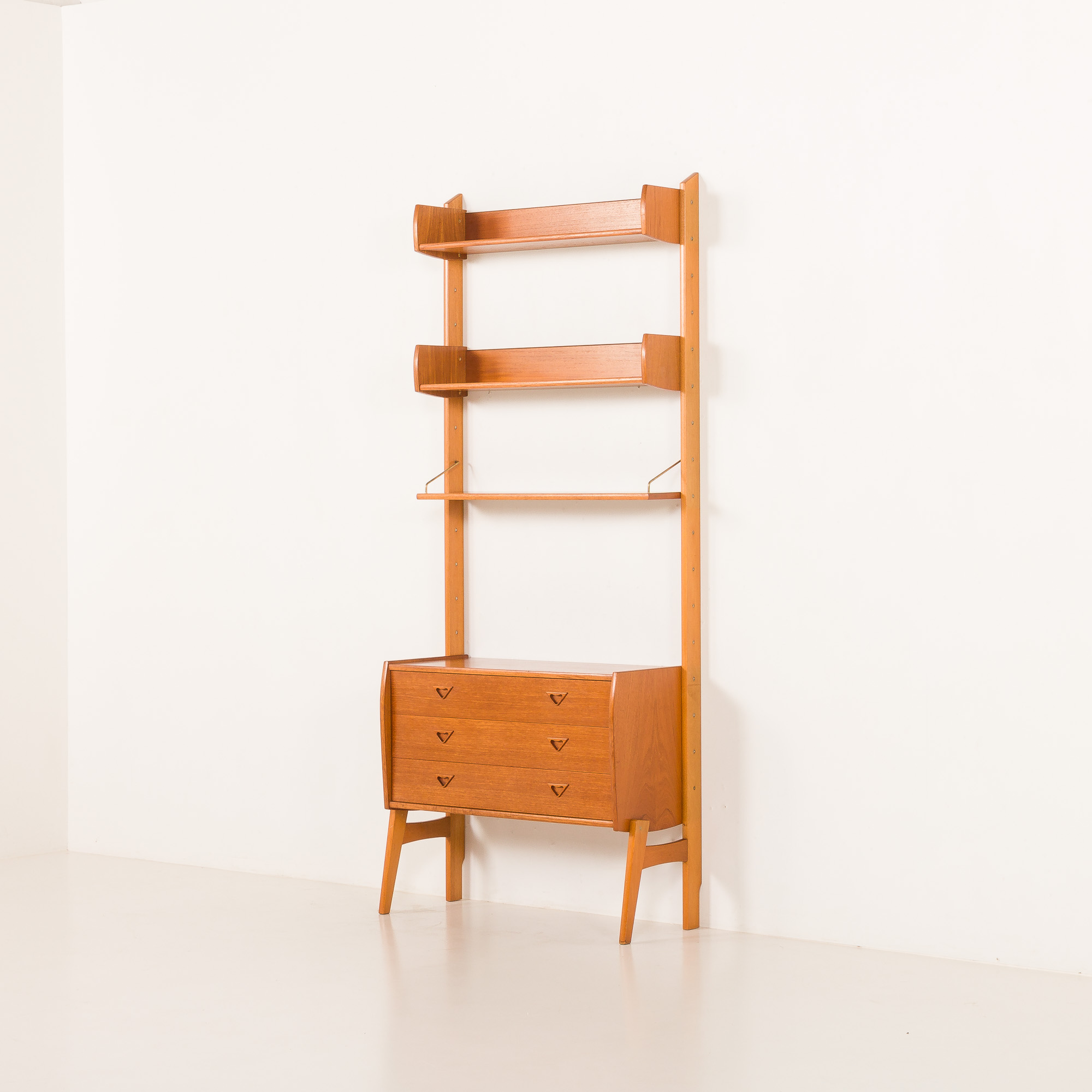 Crafted from warm-hued teak wood, this freestanding bookcase showcases a beautiful wood grain pattern. The use of high-quality teak wood and teak veneer ensures the durability and longevity of the piece. Attention to detail is evident in the nicely sculpted handles and slightly rounded edges, reflecting the artistry of Scandinavian craftsmen. The minimalist vertical supports and slim legs add visual interest and give it a lighter, more airy presence without compromising stability. The unique montage system uses screws hidden within the wooden structure, making the junction points of the components nearly invisible.
