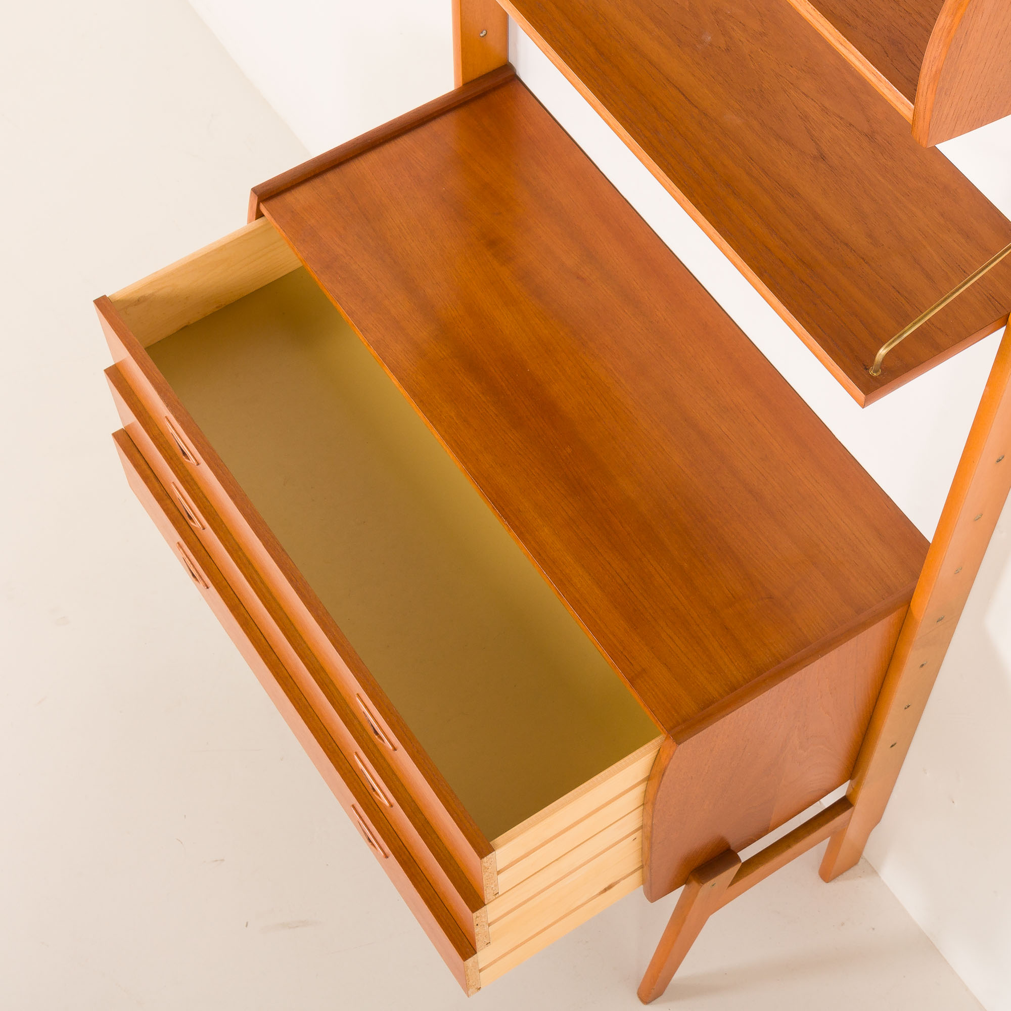 This set features a chest of drawers with triangle-shaped solid teak handles, two shelves with sides and a back, and one shelf with brass hangers. This combination of open shelving with a dresser offers a versatile mix of display and storage options, ideal as an entry chest for living rooms or offices where aesthetics and organization are crucial.