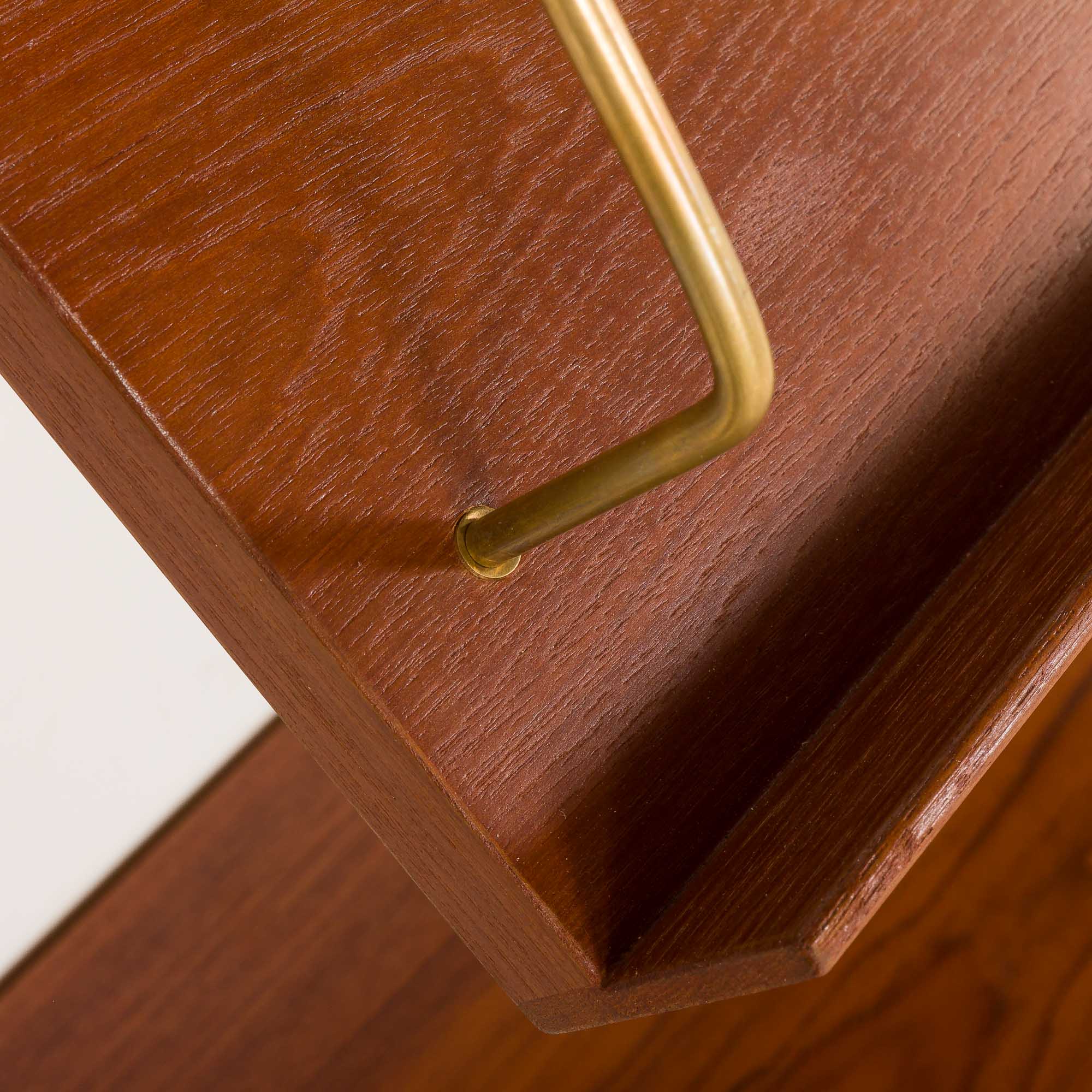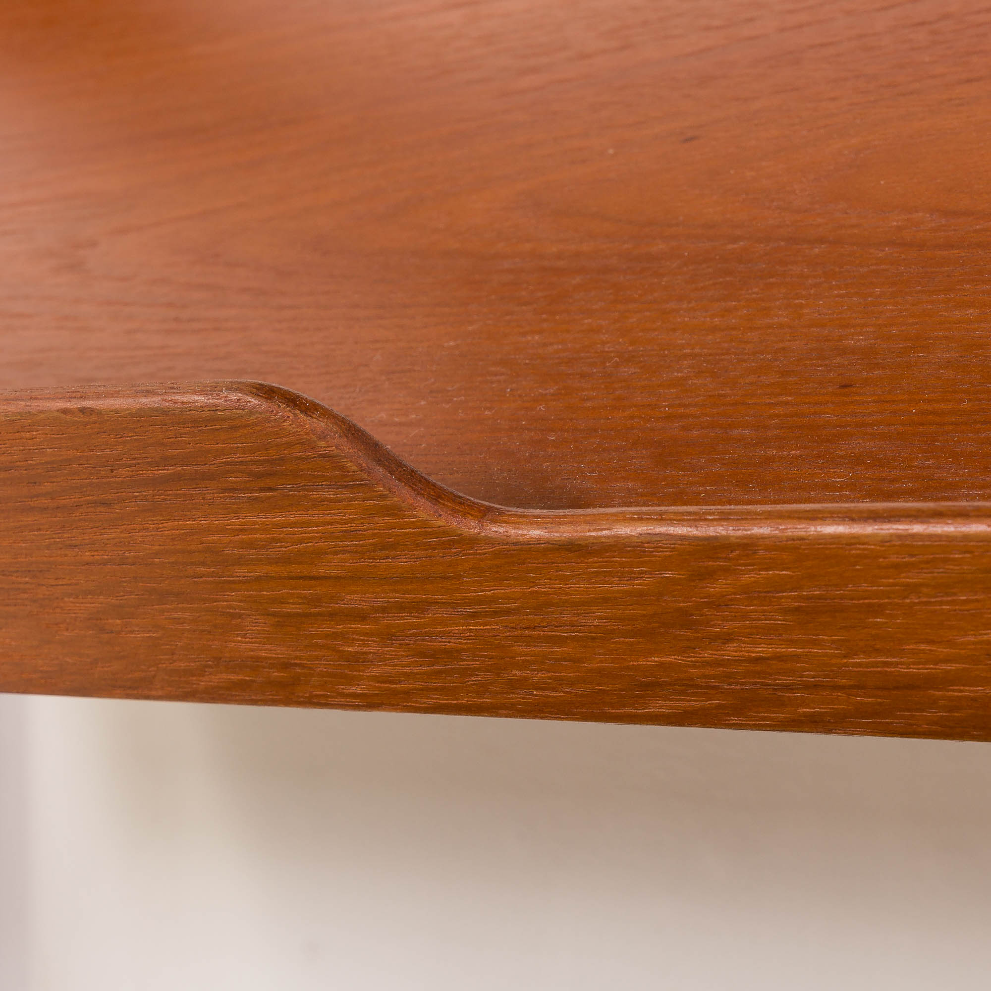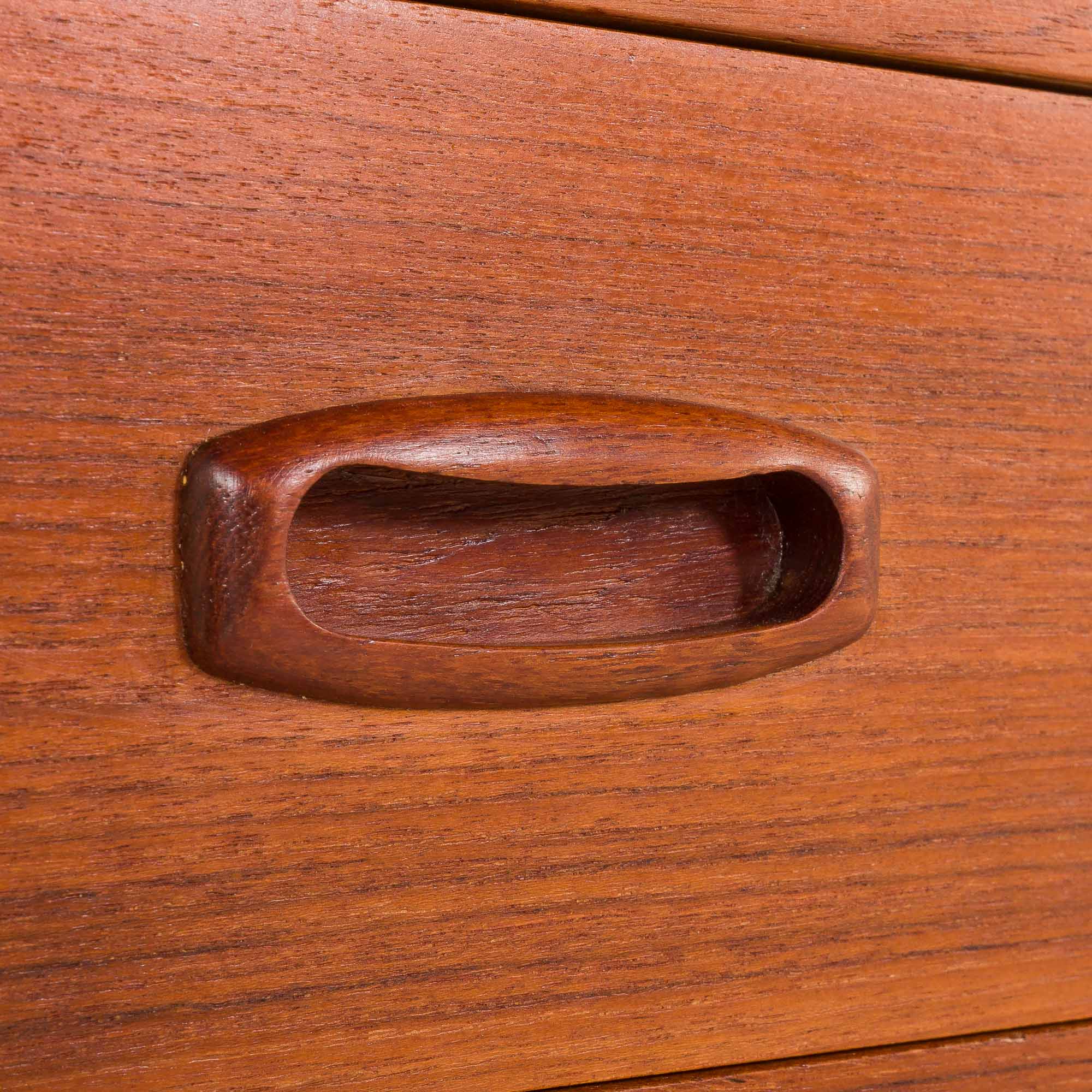 Crafted from warm-hued teak wood, this freestanding bookcase showcases a beautiful wood grain pattern. The use of high-quality teak wood and teak veneer ensures the durability and longevity of the piece. Attention to detail is evident in the nicely sculpted handles and drawers fronts joined by sturdy dovetailed joints, reflecting the artistry of Scandinavian craftsmen. The minimalist vertical supports and slim legs add visual interest and give it a lighter, more airy presence without compromising stability.