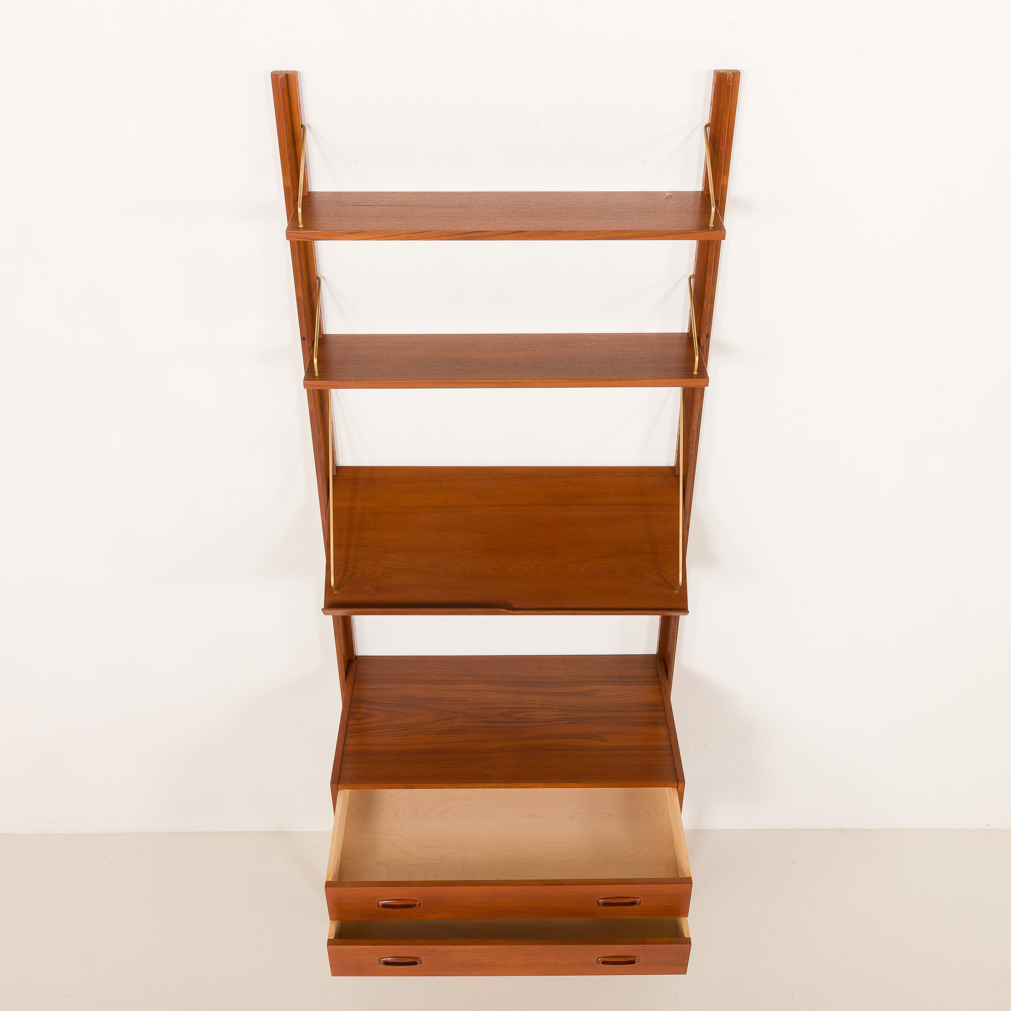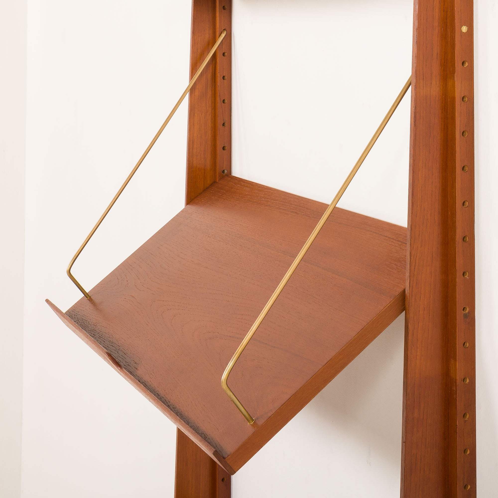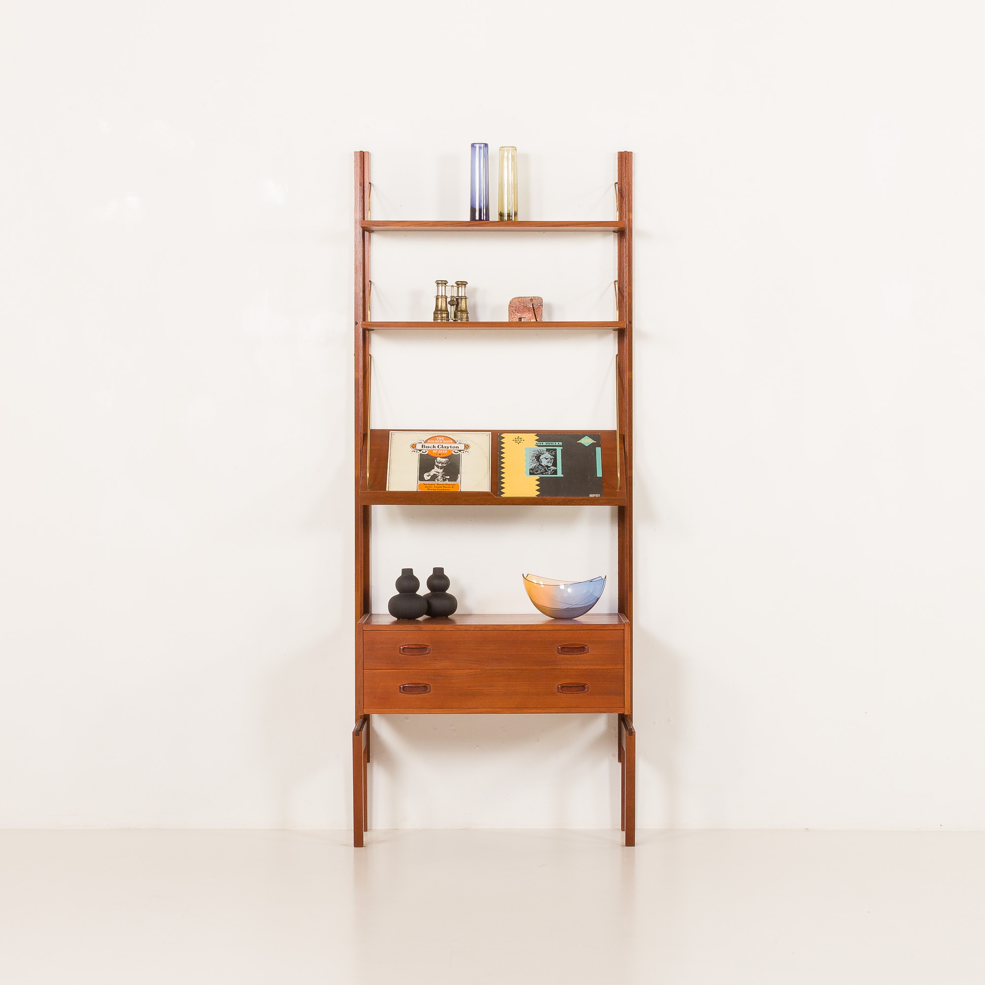 Crafted from warm-hued teak wood, this freestanding bookcase showcases a beautiful wood grain pattern. The use of high-quality teak wood and teak veneer ensures the durability and longevity of the piece. Attention to detail is evident in the nicely sculpted handles and drawers fronts joined by sturdy dovetailed joints, reflecting the artistry of Scandinavian craftsmen. The minimalist vertical supports and slim legs add visual interest and give it a lighter, more airy presence without compromising stability.
