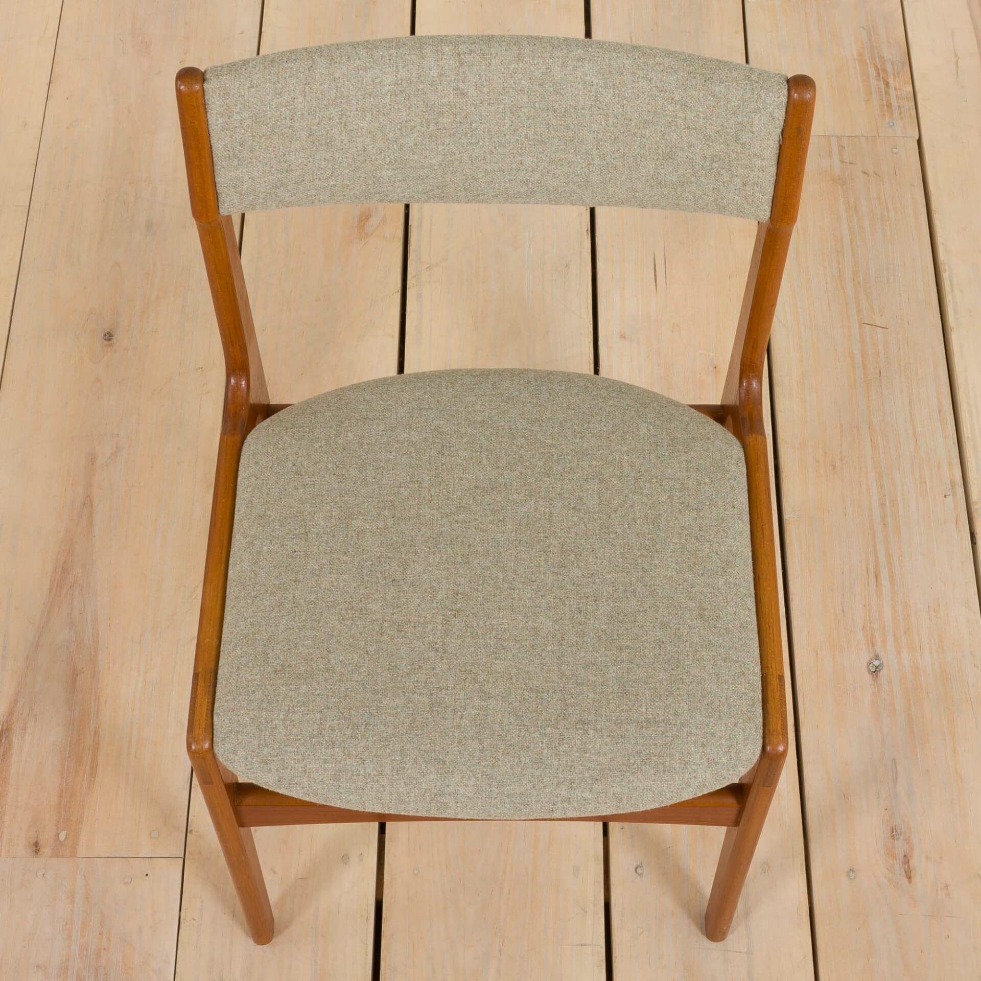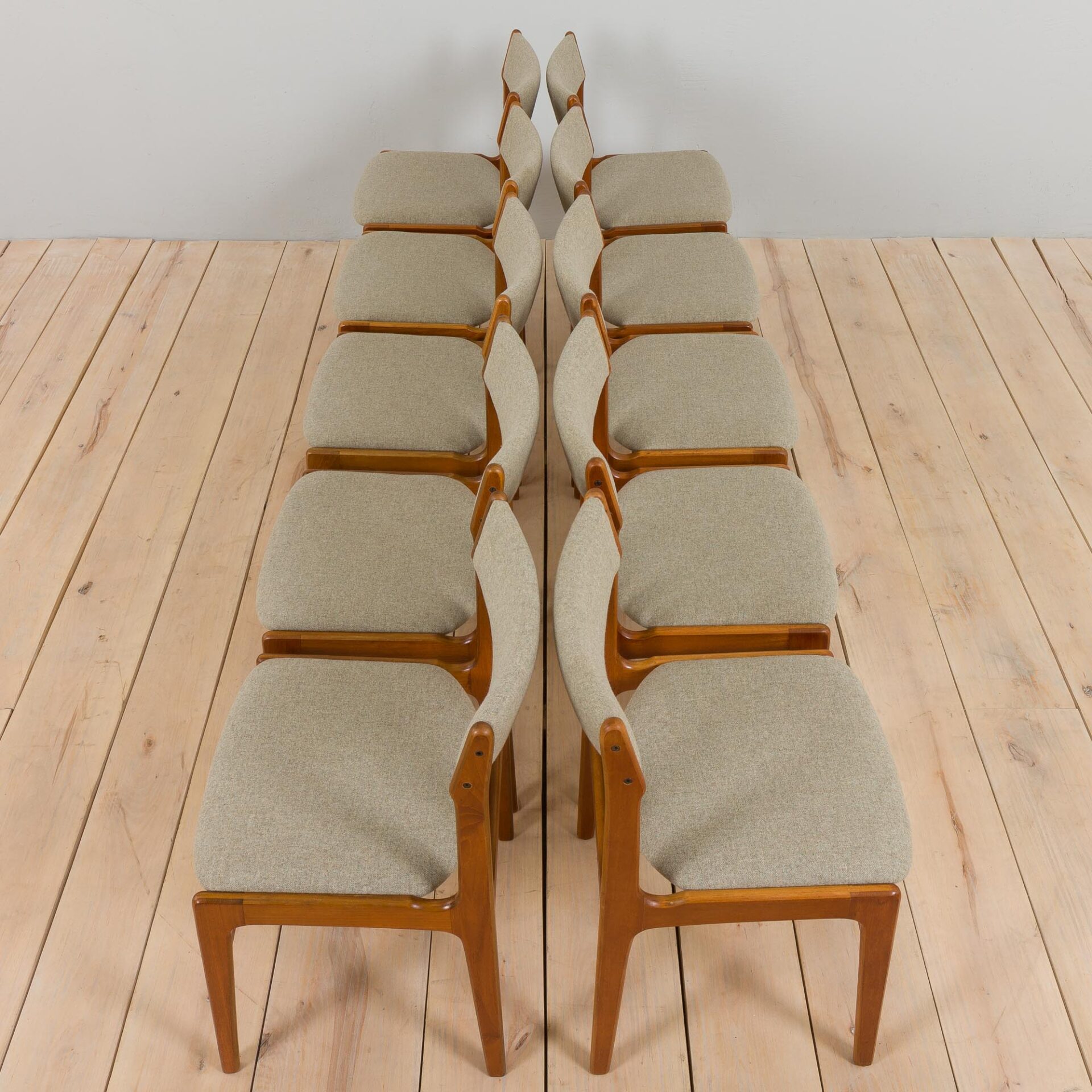 Elegant set of ten Danish mid-century dining chairs by Erik Buch for Anderstrup from the 1960s. They are made of solid teak and have new grey wool upholstery on the seat and back. A comfortable seat with geometric lines softened through curved finishes gives a light presence to the piece. These seats will attract your guests due to their shape and pleasant sitting.