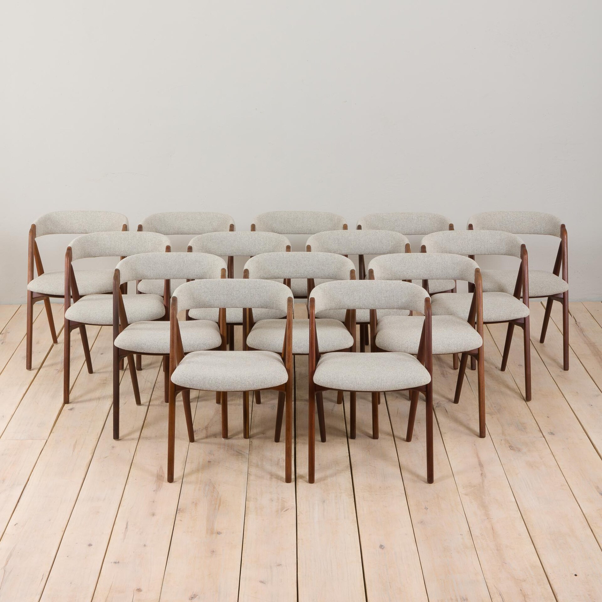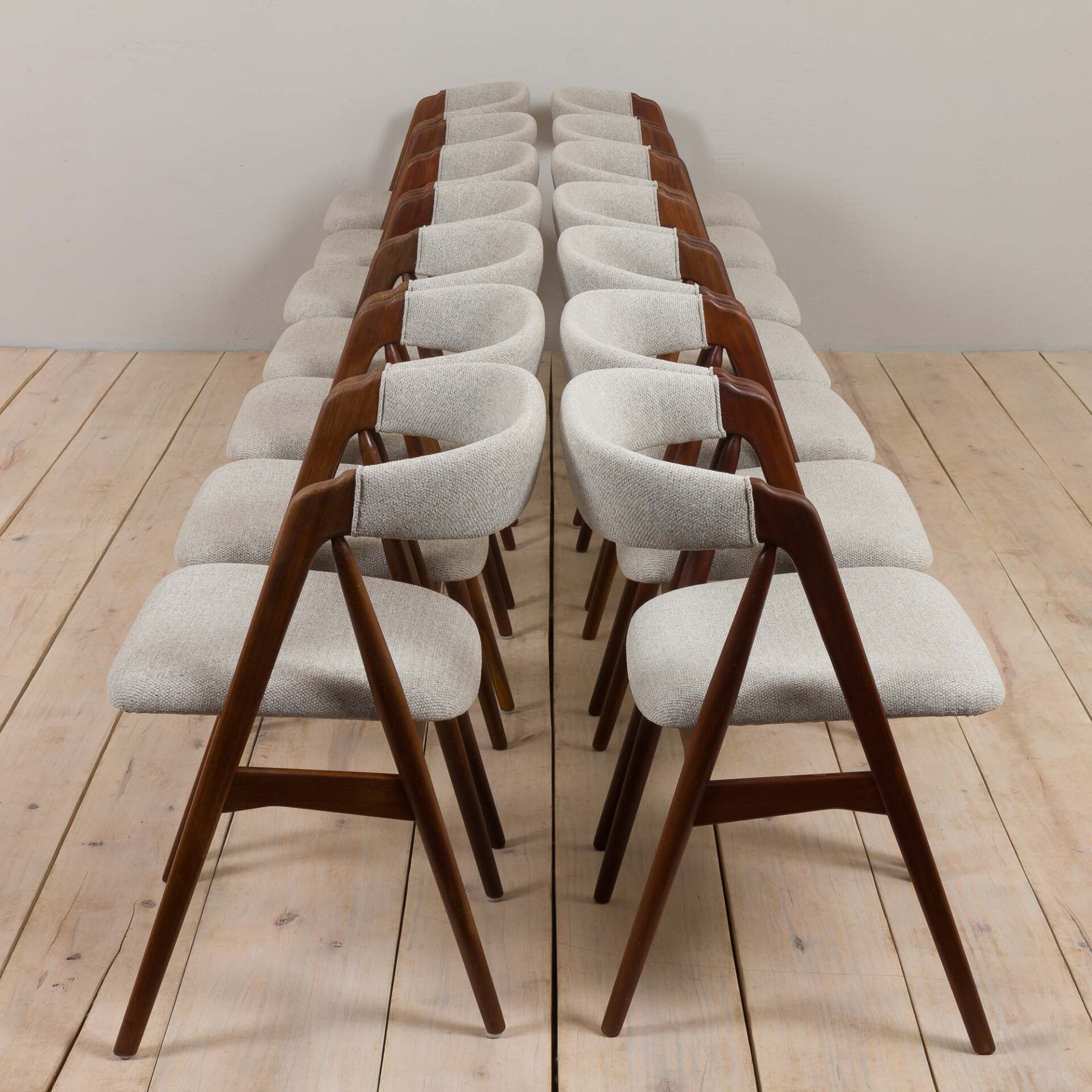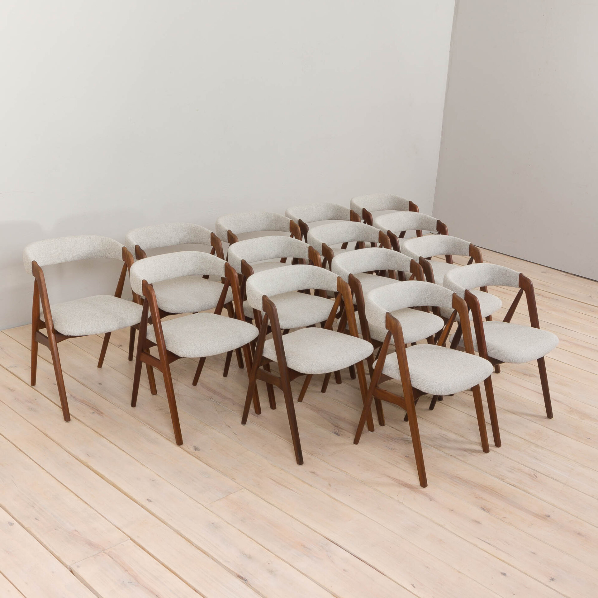 Impressive set of fourteen Midcentury Modern Danish dining chairs, designed by Thomas Harlev for Farstrup Møbler in the 1950s. Solid teak wood frames have been cleaned and re-oiled to enhance the wood grain. New natural wool upholstery in a light grey and beige hue gives a distinctive look and elegance. This impressive set is in fantastic condition with new foams on the seating and backrest for extra comfort.
