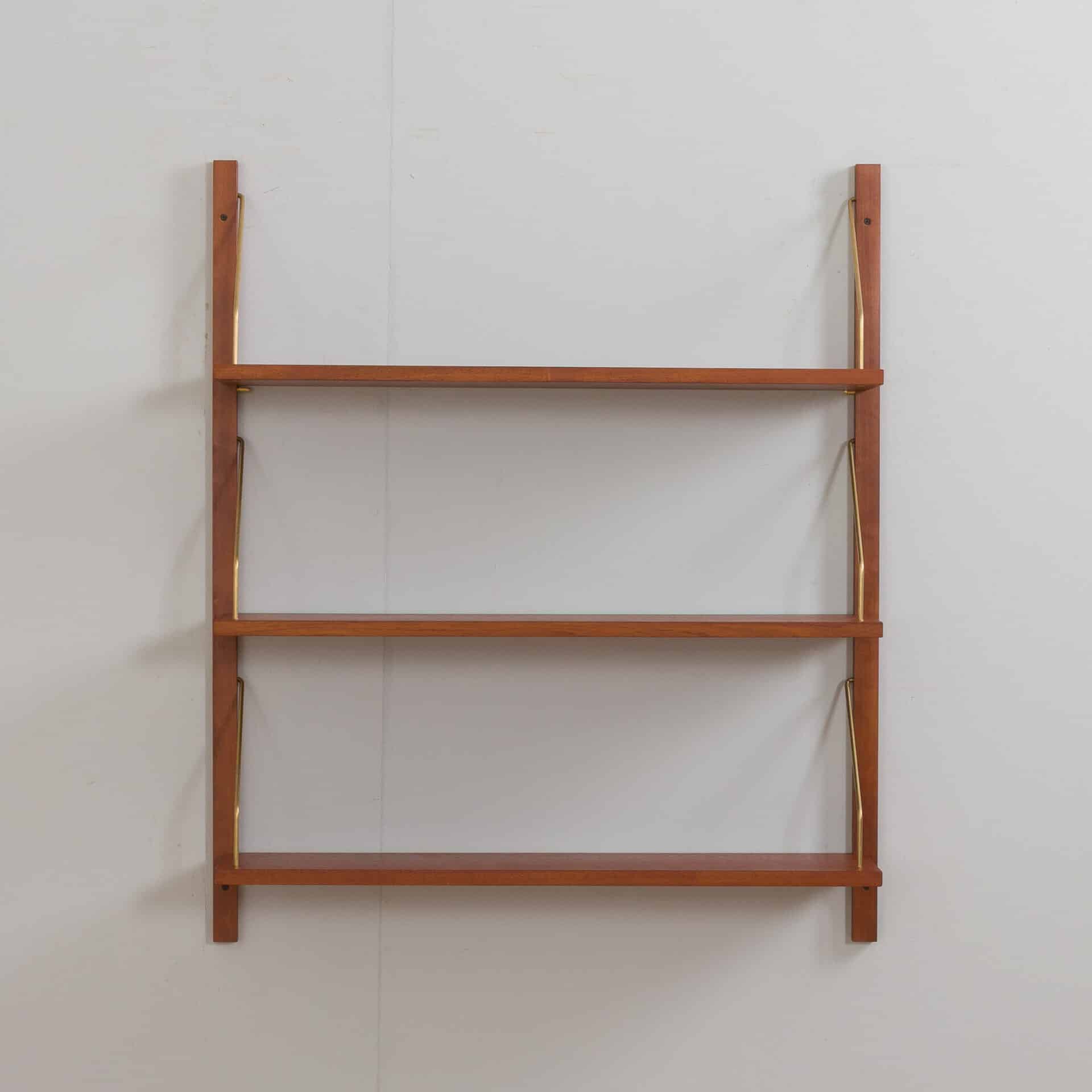A set of three teak shelves designed in the style of wall units by P. Sorensen or Poul Cadovius in the 60s. These simple and elegant bookshelves made out of teak veneer hang on solid wood rails and are supported by solid brass hangers.