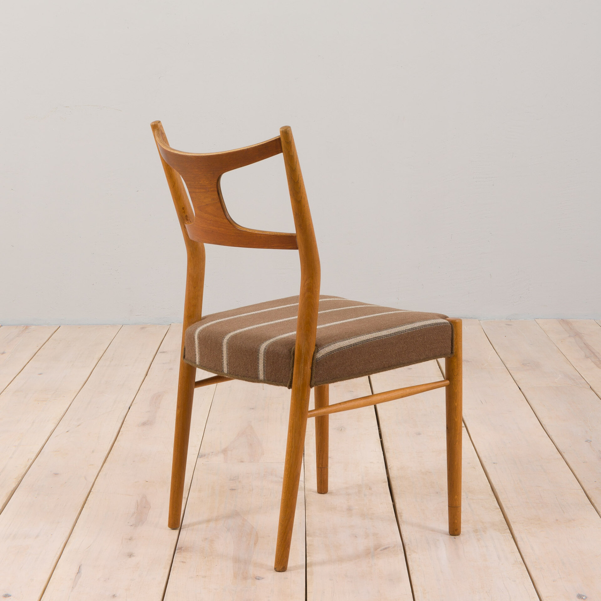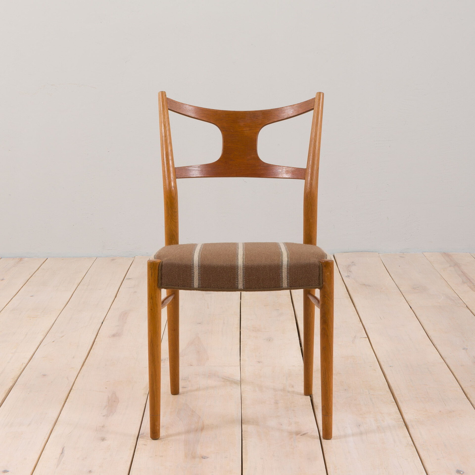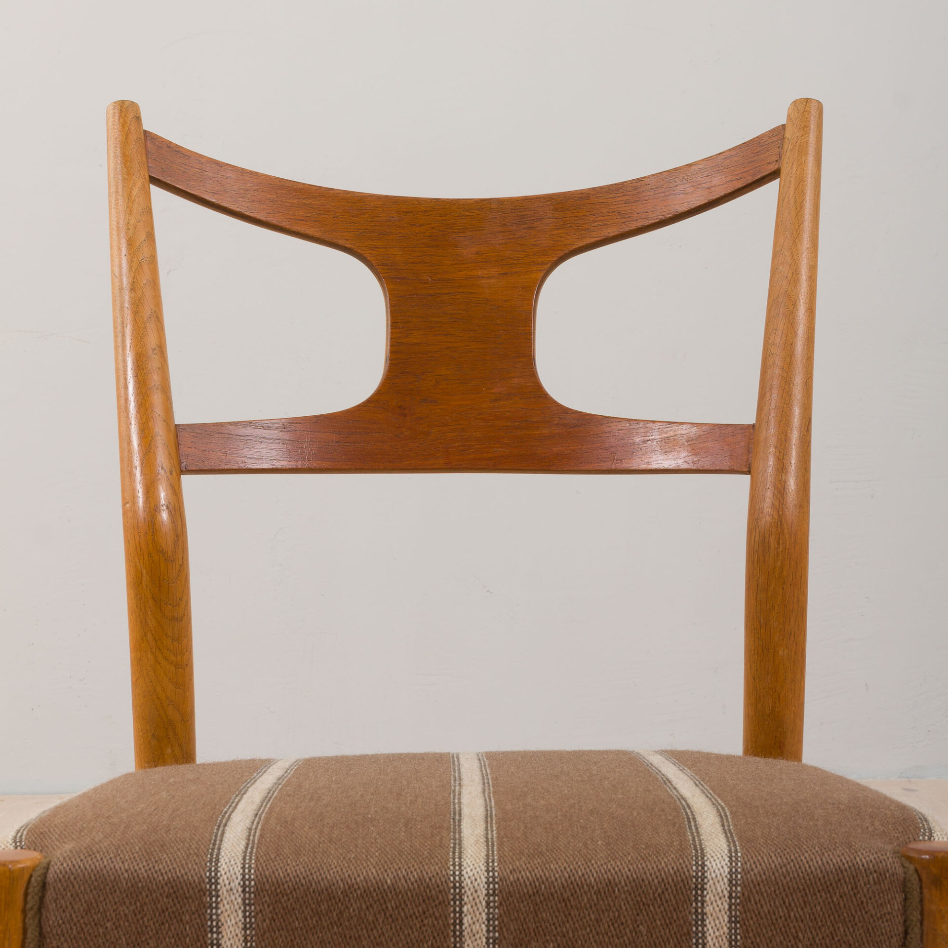 Set of 4 solid oak dining chairs with backrests finished in teak, seats upholstered in still original, high quality, striped wool fabric. This model was designed in Denmark in 1956 by Kurt Ostervig and produced by Randers Furniture Møbelfabrik. These vintage chairs are uniquely elegant, thanks to sober curves and the use of two species of wood: teak and oak.