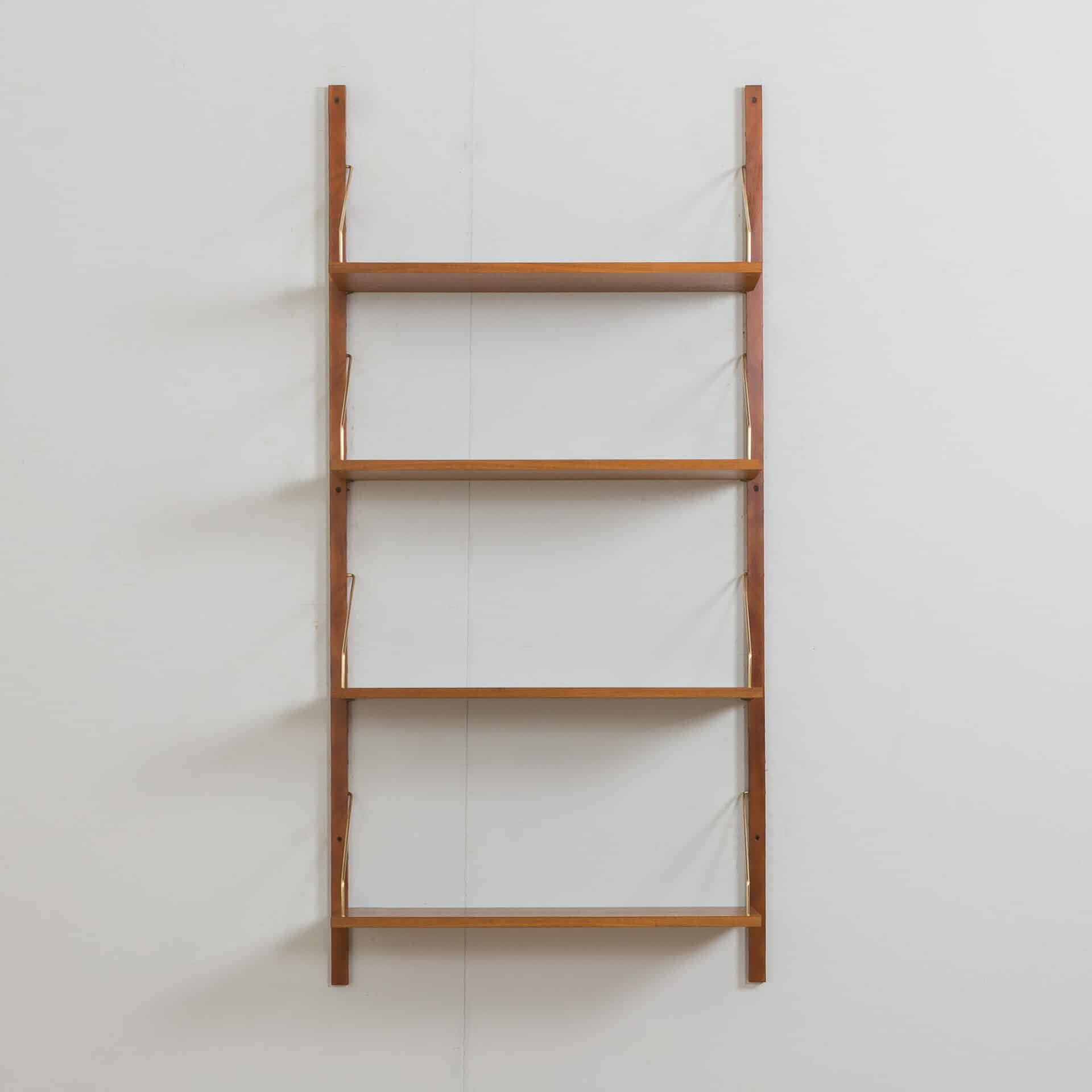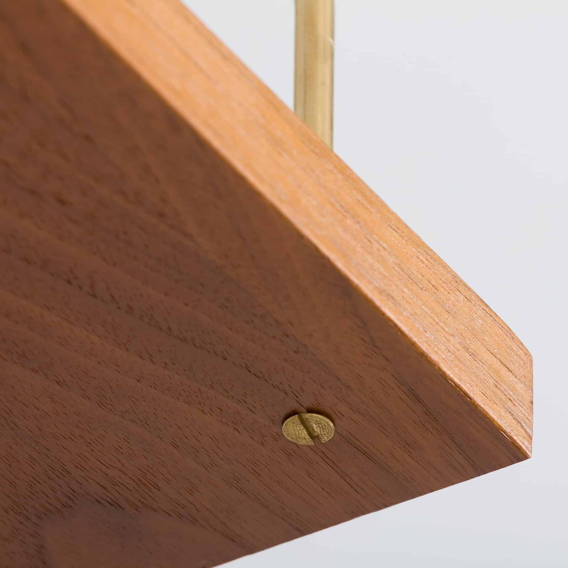 A set of four rare walnut shelves designed in the style of Poul Cadovius in the 60s/70s. These simple and elegant bookshelves made out of walnut veneer hang on solid wood rails and are supported by solid brass hangers.