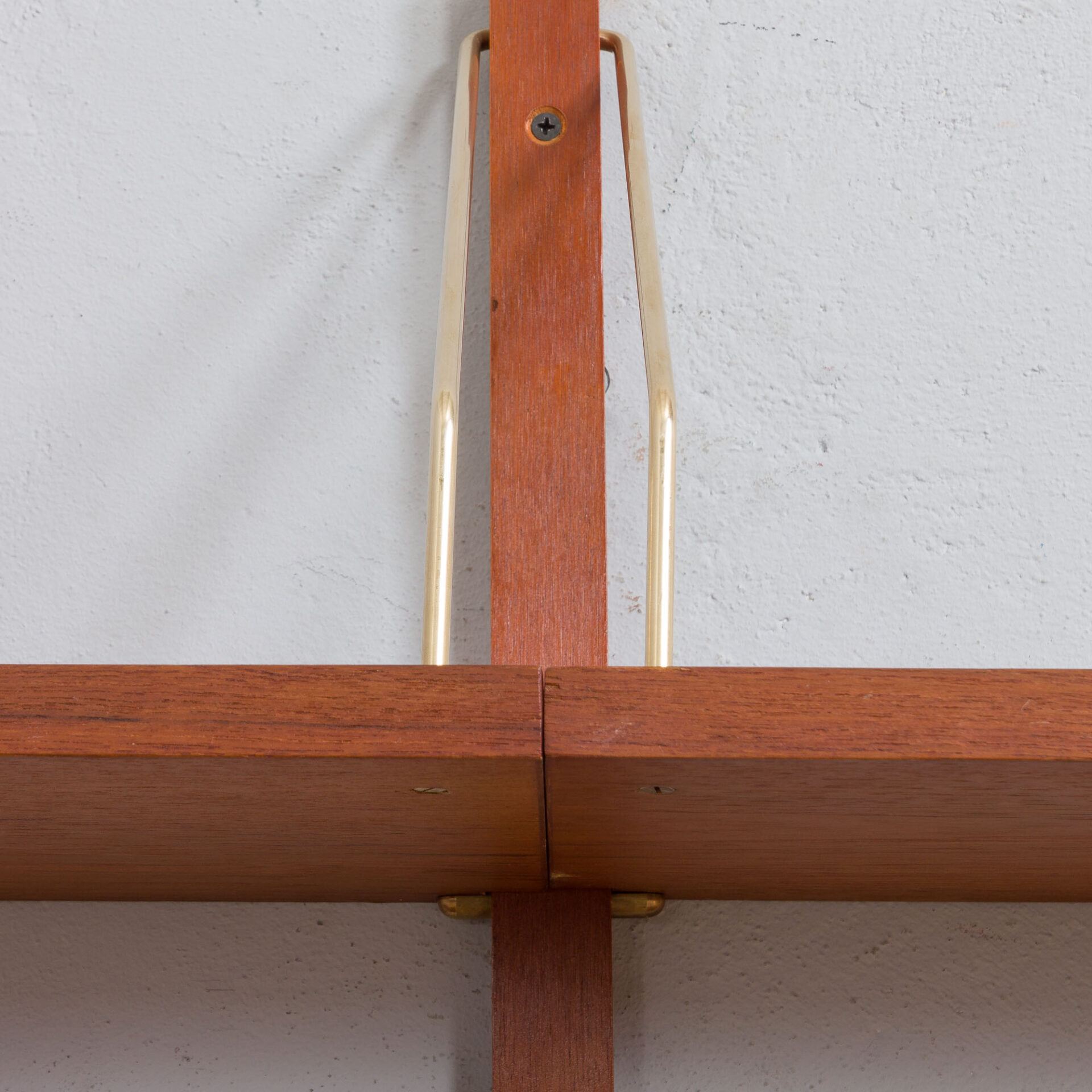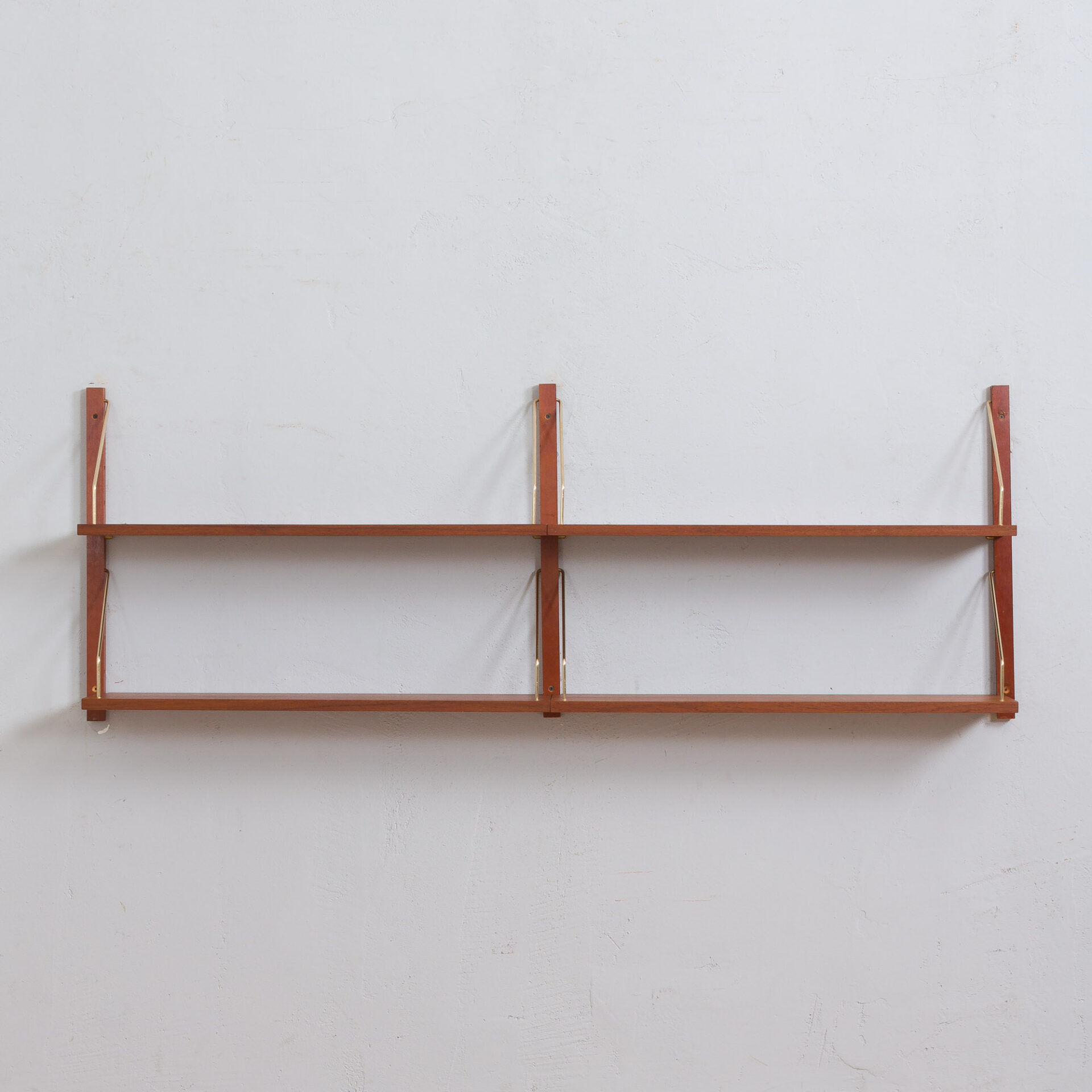 Danish wall unit in the style of Preben Sorensen, Cadovius (similar mounting system and carpentry) from the 1960s. It is a modular shelving system with four shelves in teak wood, which can be arranged as required. This set consists of: