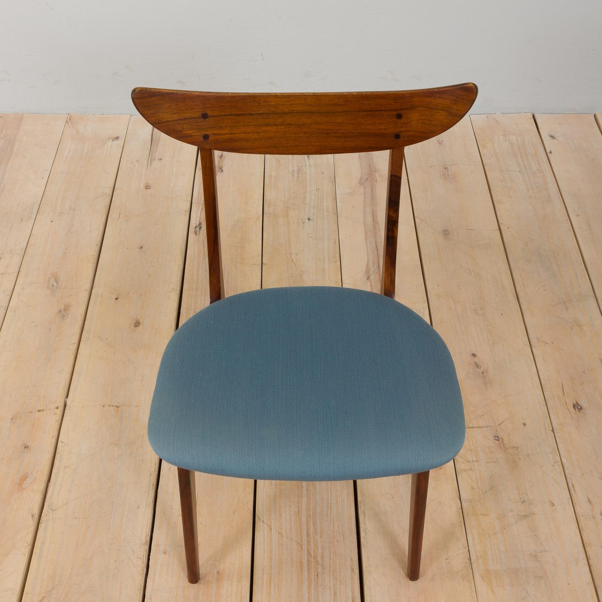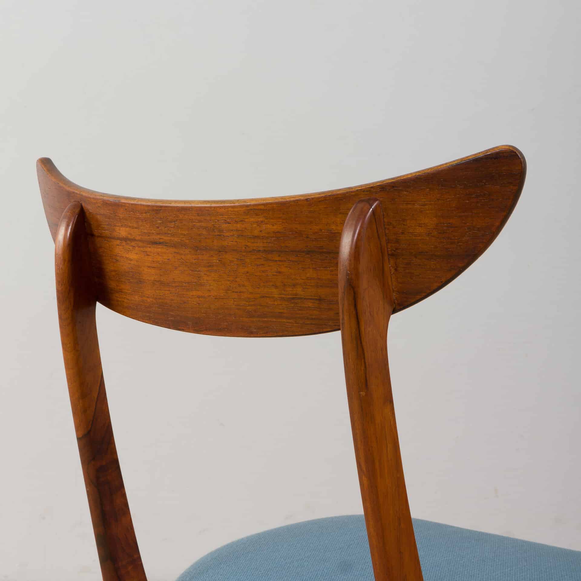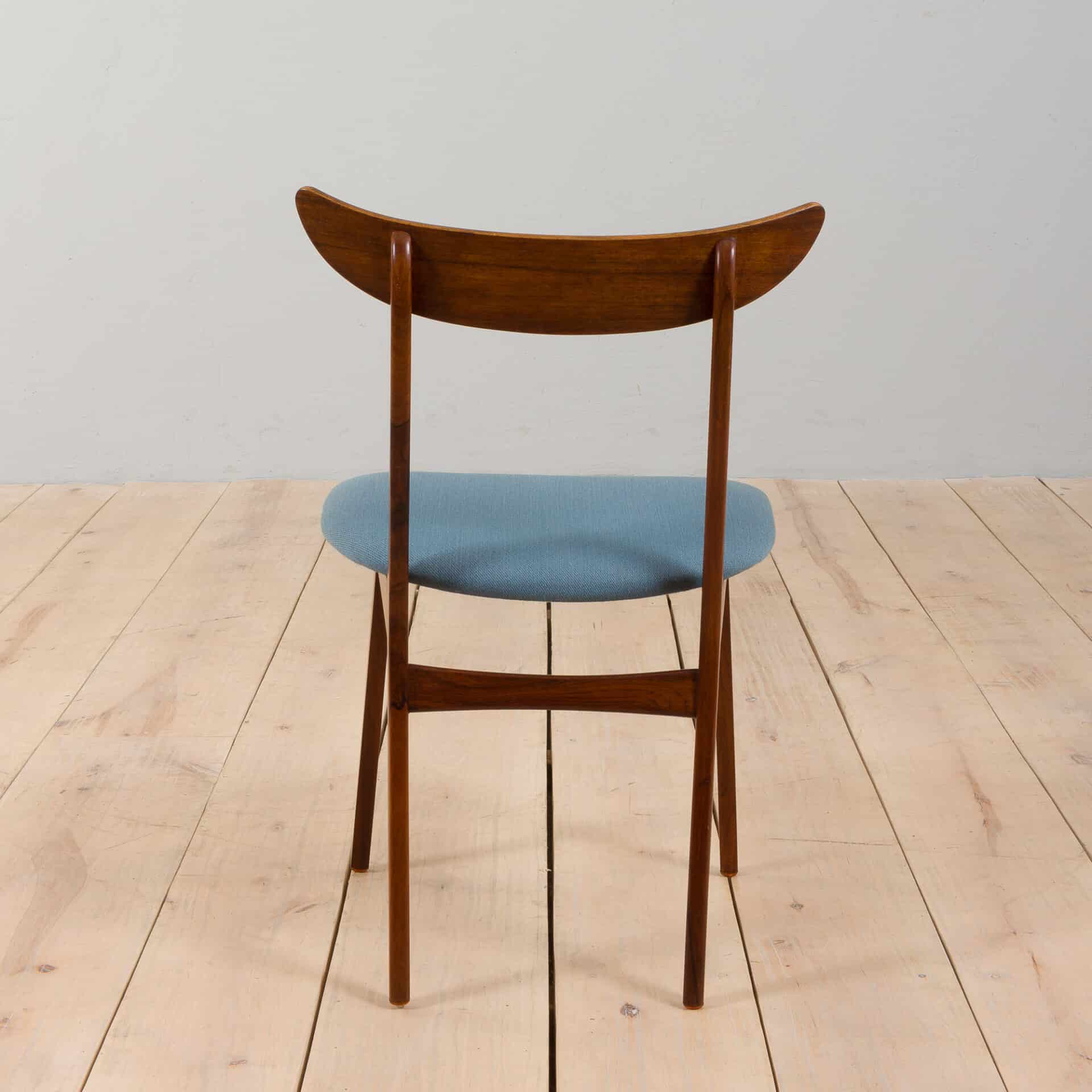 Vintage set of six rosewood dining chairs with gorgeous curves and a unique crescent-shaped backrest. It was designed and manufactured in Denmark in the 1960s. Slightly reminiscent of Kurt Ostervig’s design from the same period. Beautiful rich rosewood grain and original light blue fabric upholstery on seats adorn any dining area with a mid-century touch. Excellent vintage condition with minor traces related to age and use. Upholstery changed in a later period and is still in very good condition, it can be replaced upon request.
