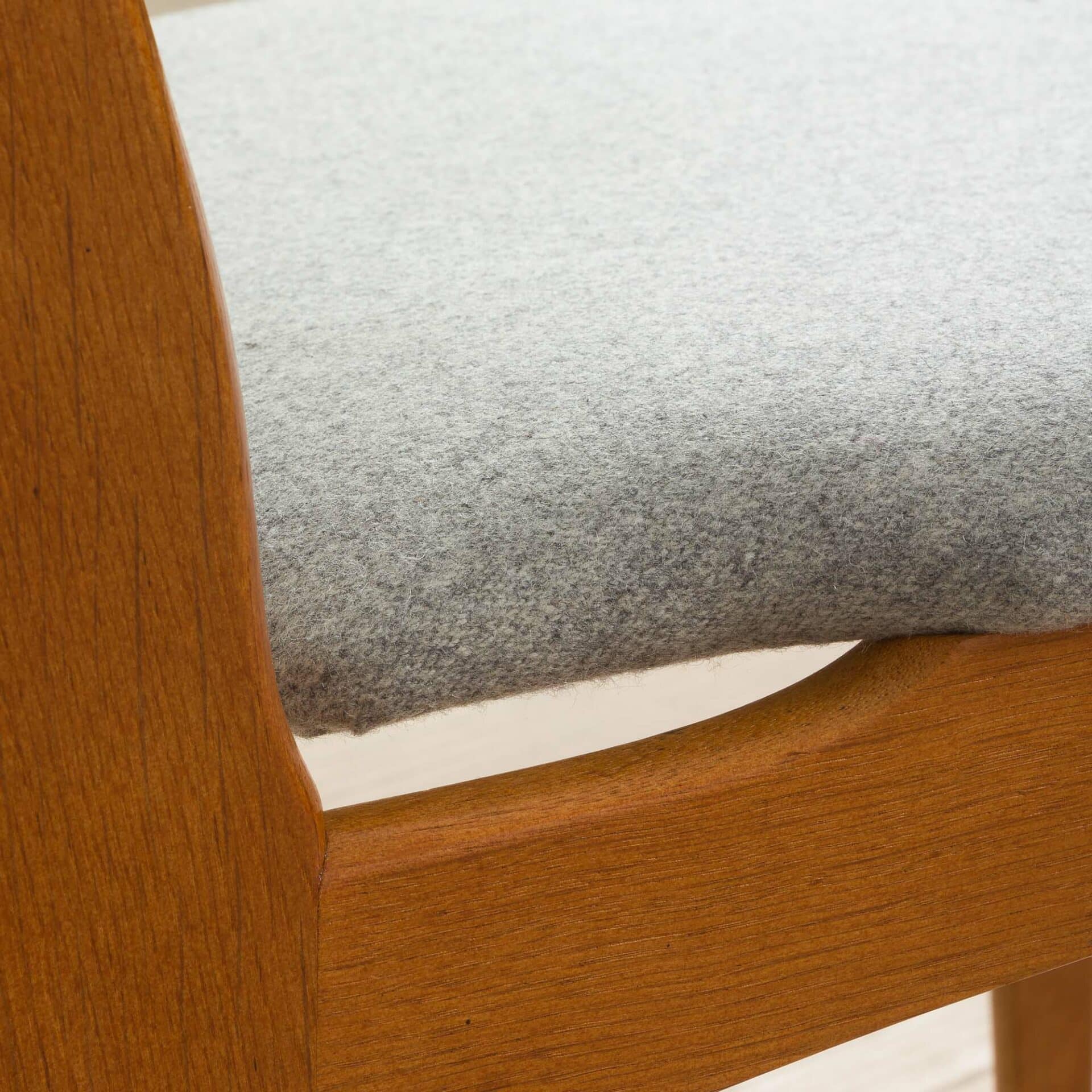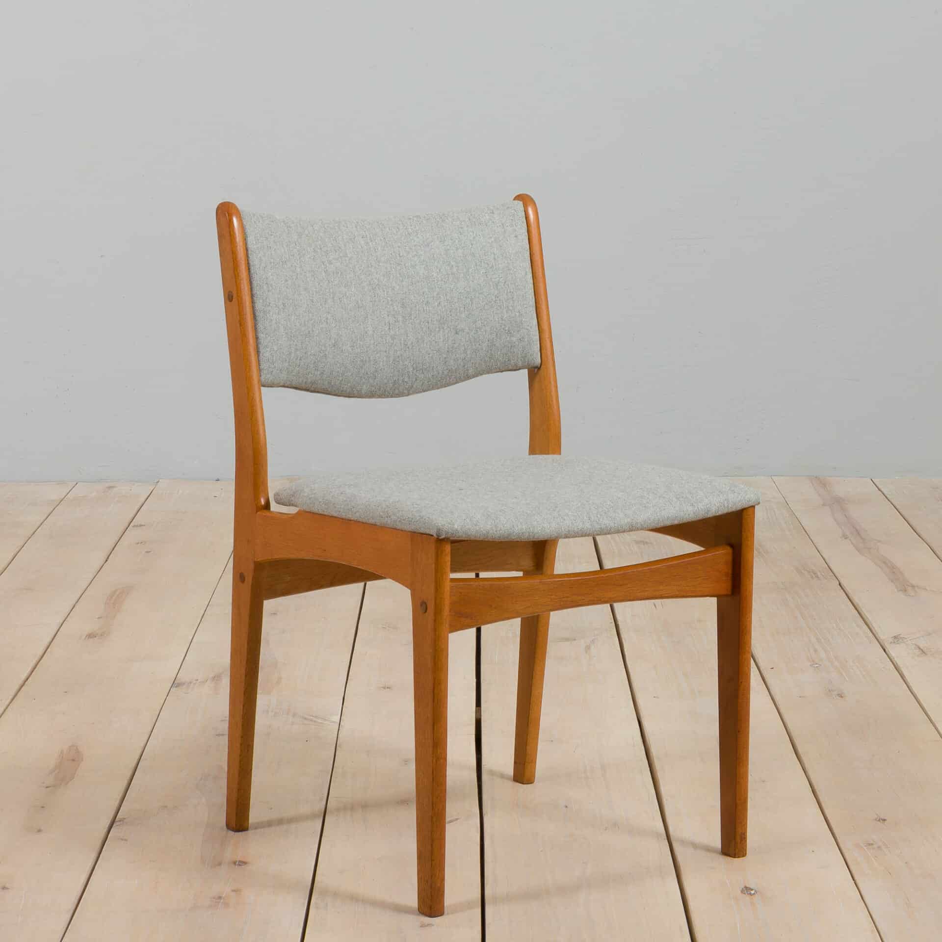 Elegant set of 6 Danish dining chairs model 7171 from Uldum Møbelfabrik made in the 1960s. Manufacture’s label preserved. Most likely designed by Johannes Andersen, who was designing for Uldum at this period, and the chairs have a few special features that are very reminiscent of his projects. They are made from solid oak and have new grey wool upholstery on the seat and back. High-quality carpentry is certified by Danish Furniture makers control. A comfortable seat with geometric lines softened through curved finishes gives a light presence to the piece. These seats will attract your guests due to their shape and pleasant sitting.