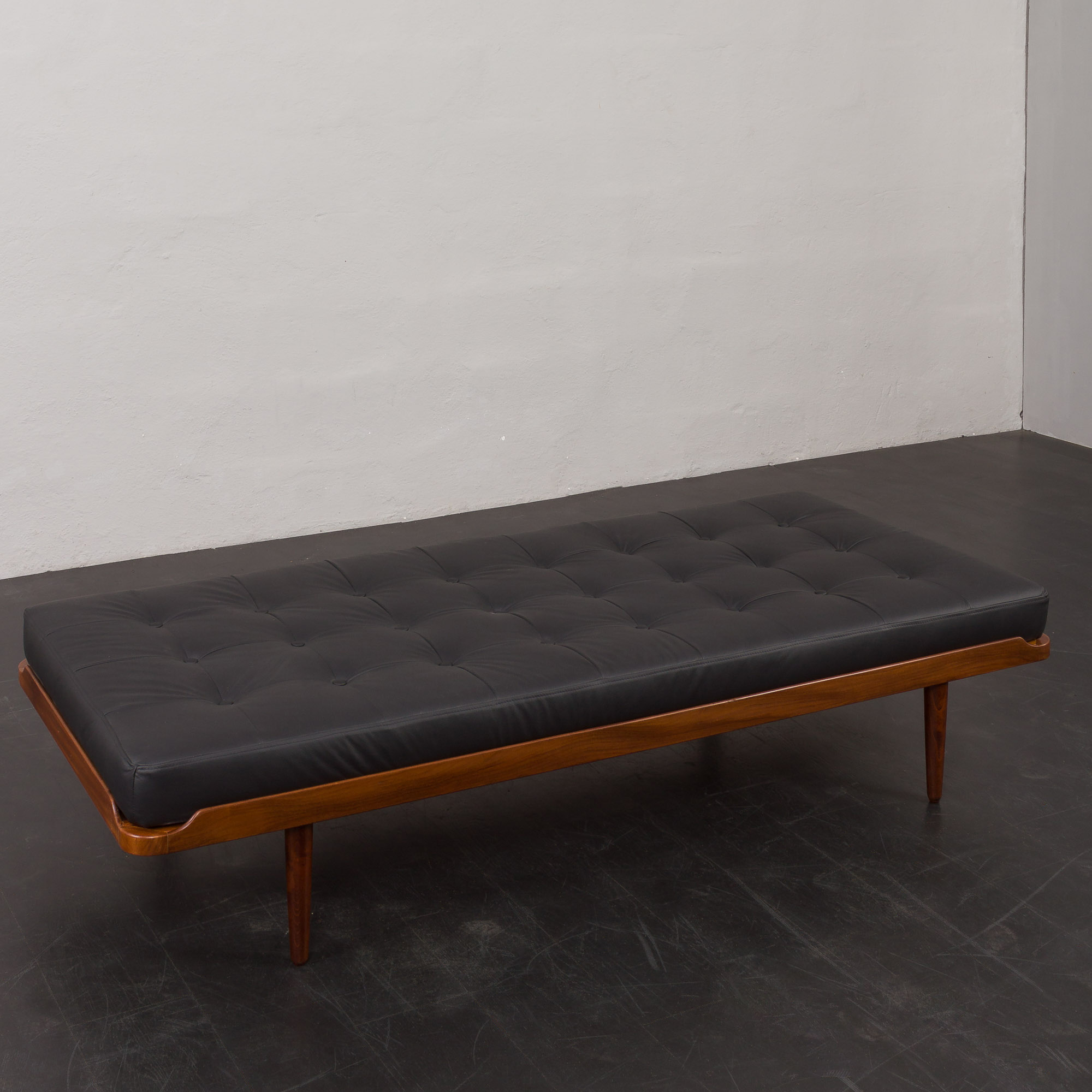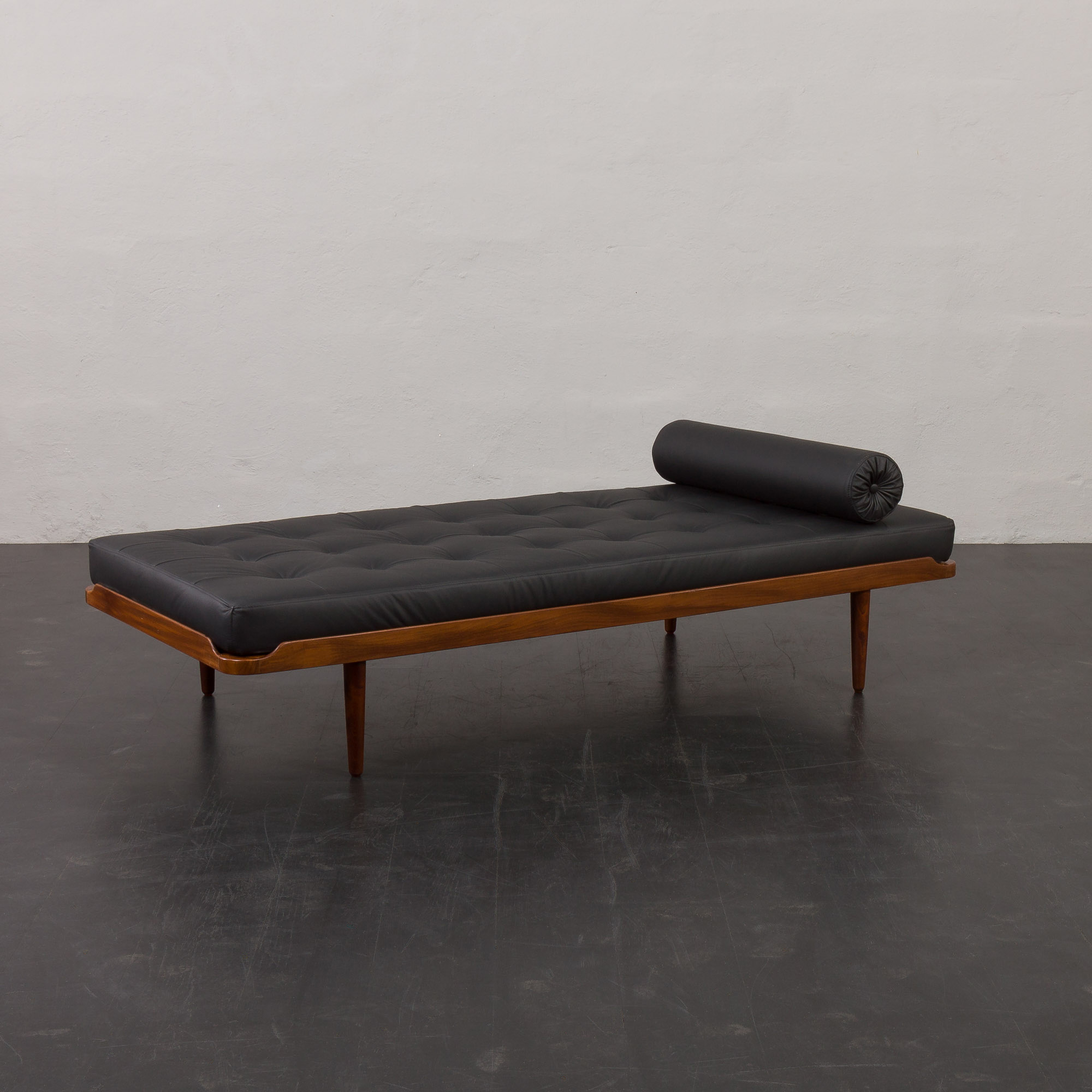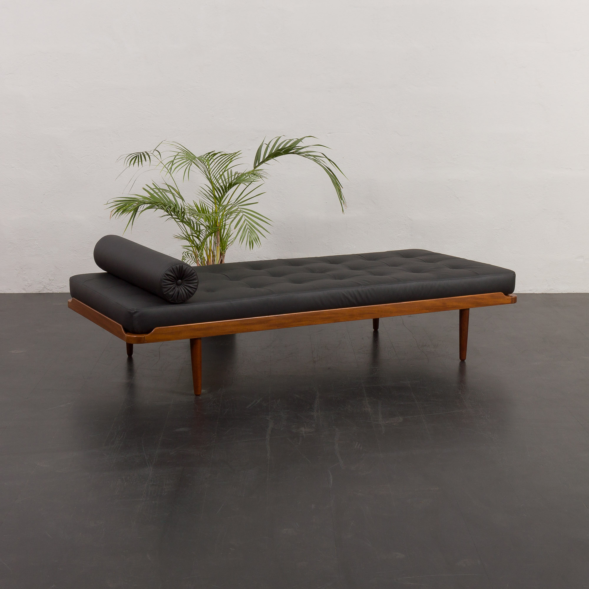 The frame is in its original vintage condition with minor traces of use. The daybed has been with new foam and upholstery. We preserved the wood with Danish oil. The legs are detachable for convenient storage or transport.