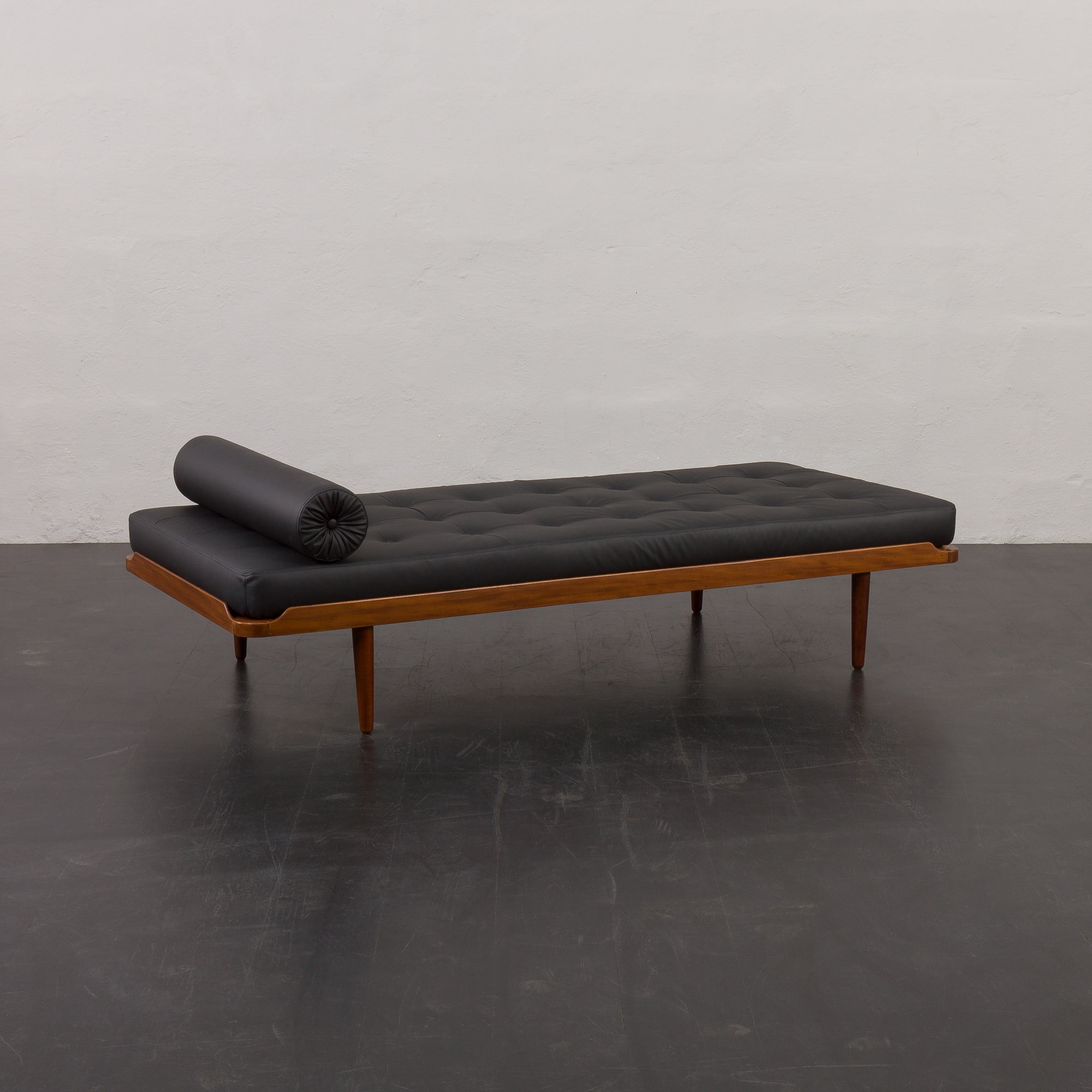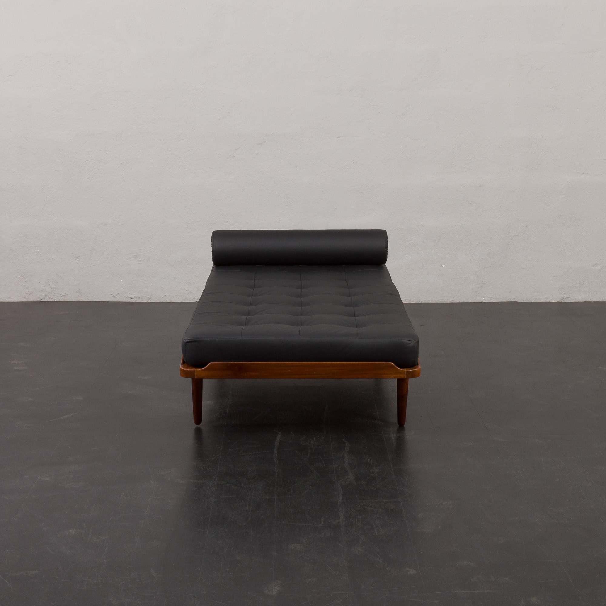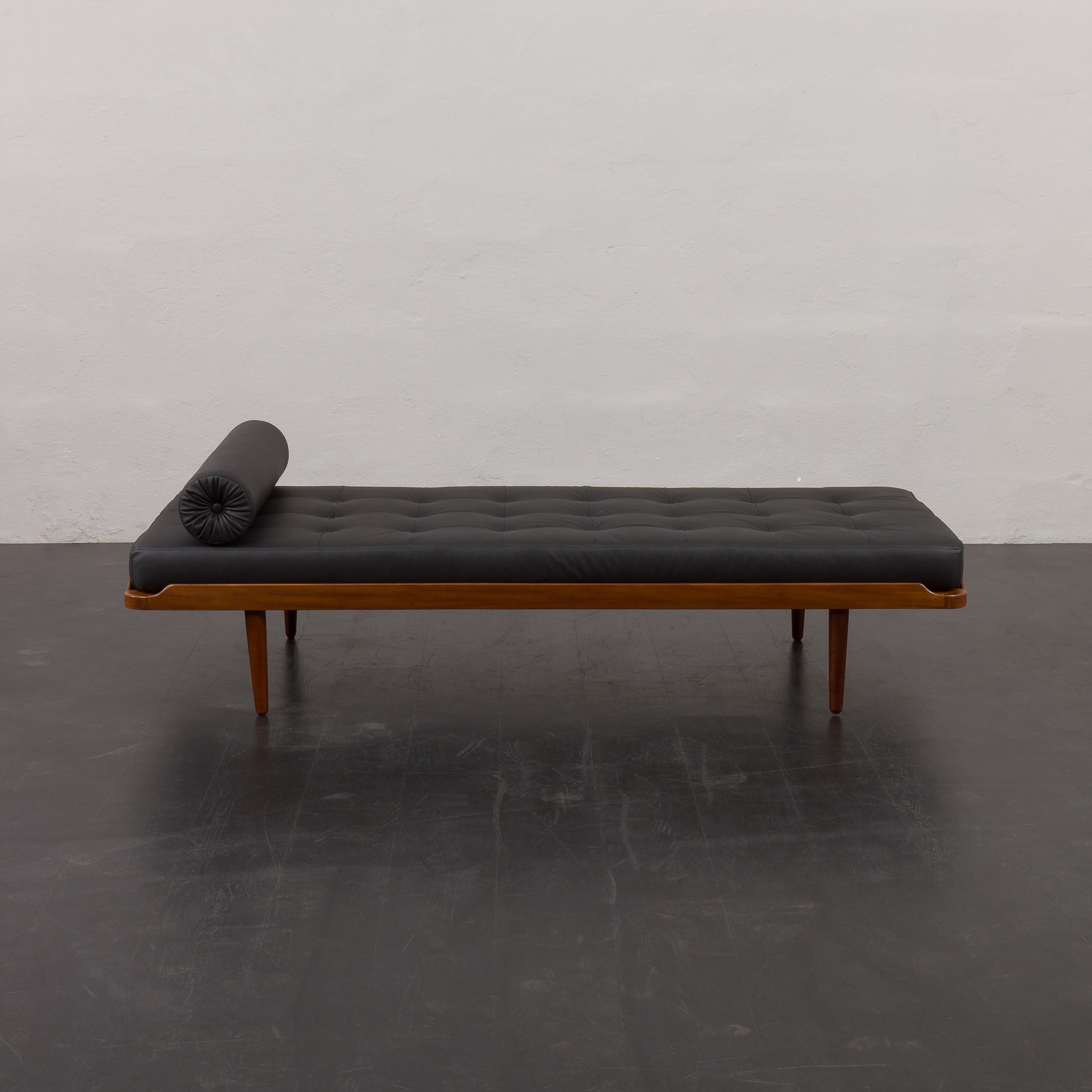 Mid-century solid teak daybed made in Denmark in the 1960s. It closely relates to Ejvind A. Johansson’s “G19” project from the same period. The daybed features a solid teak frame and a quilted mattress in black leather with new foam inside, along with a decorative bolster, adding an elegant touch to the piece. It showcases high-quality craftsmanship, ensuring comfort for relaxation.