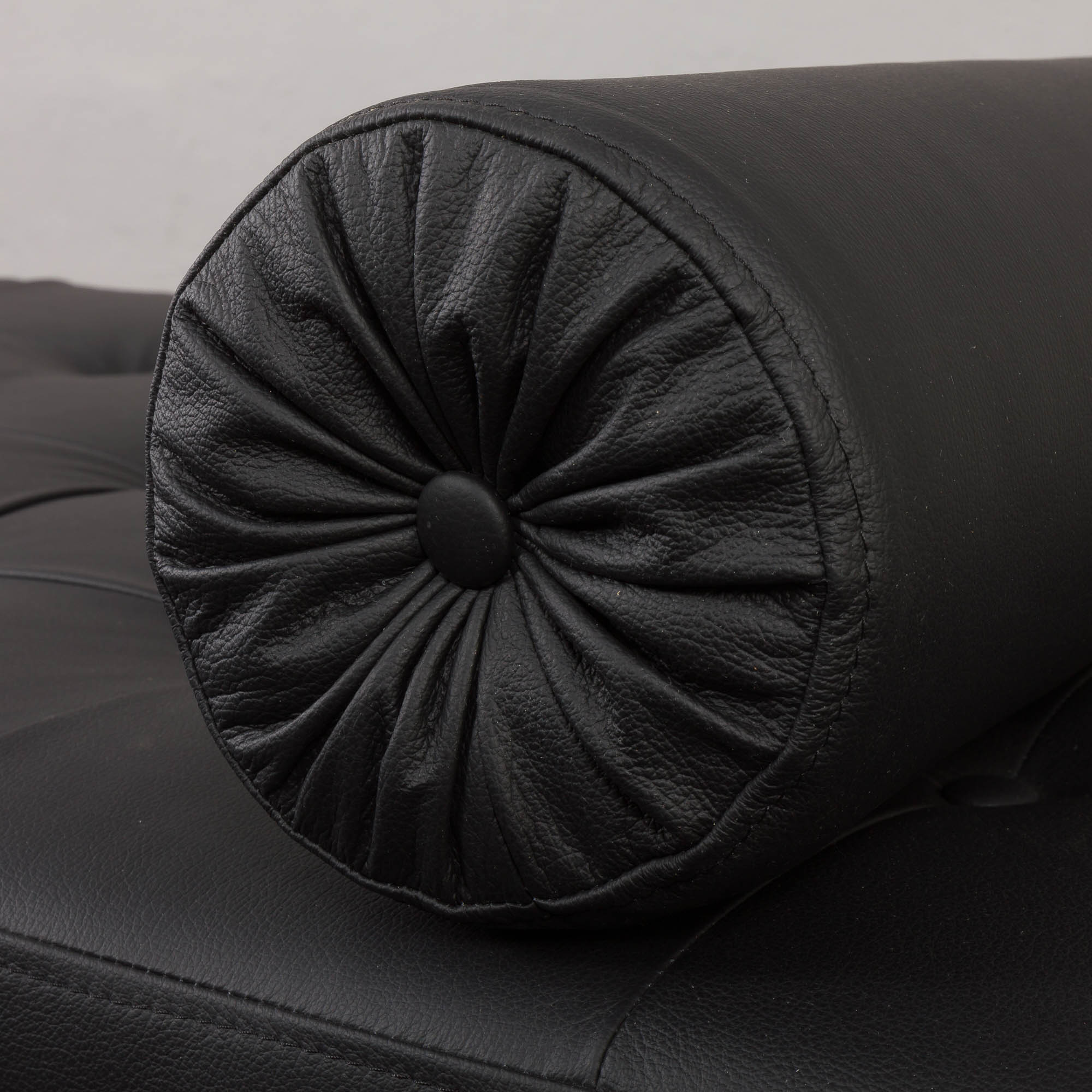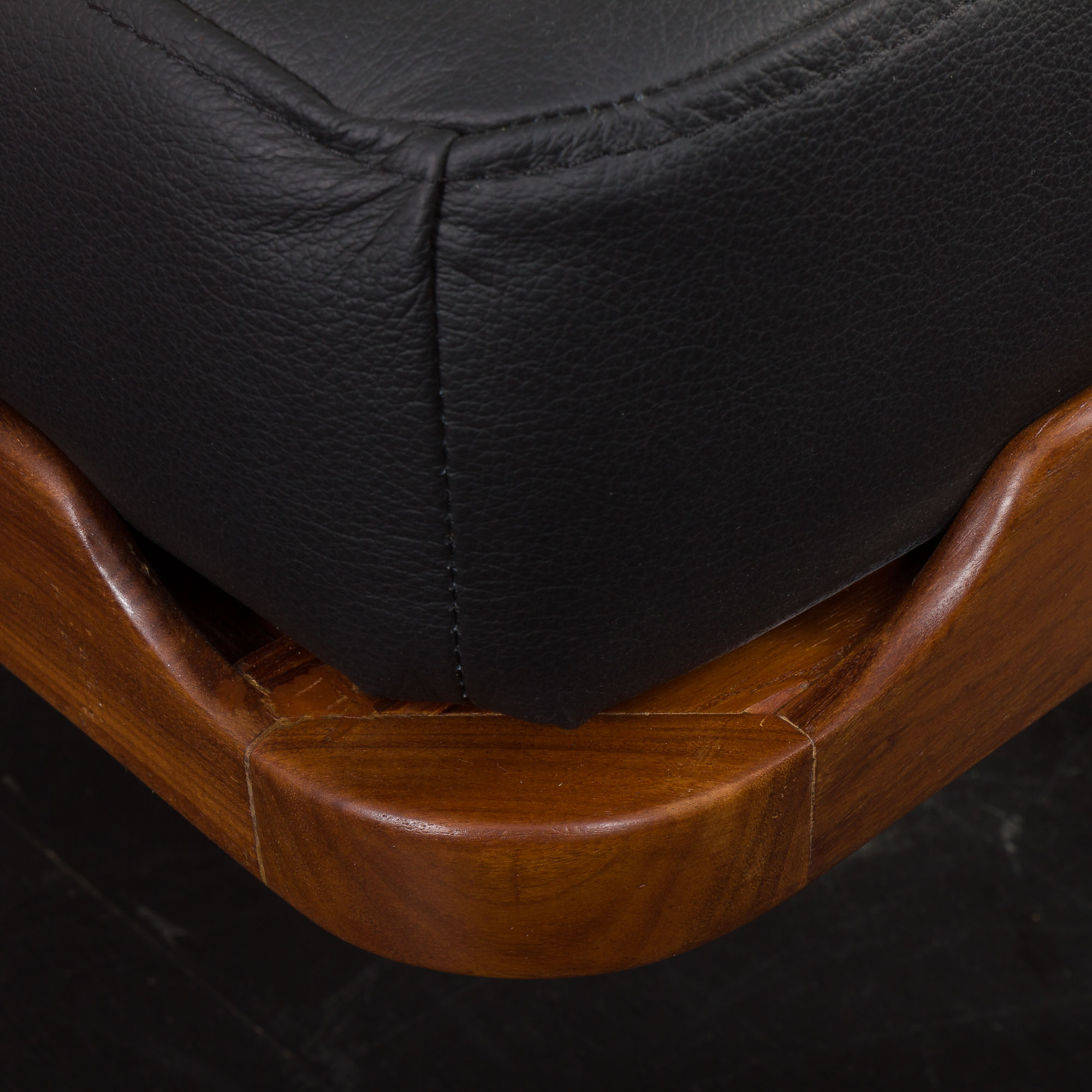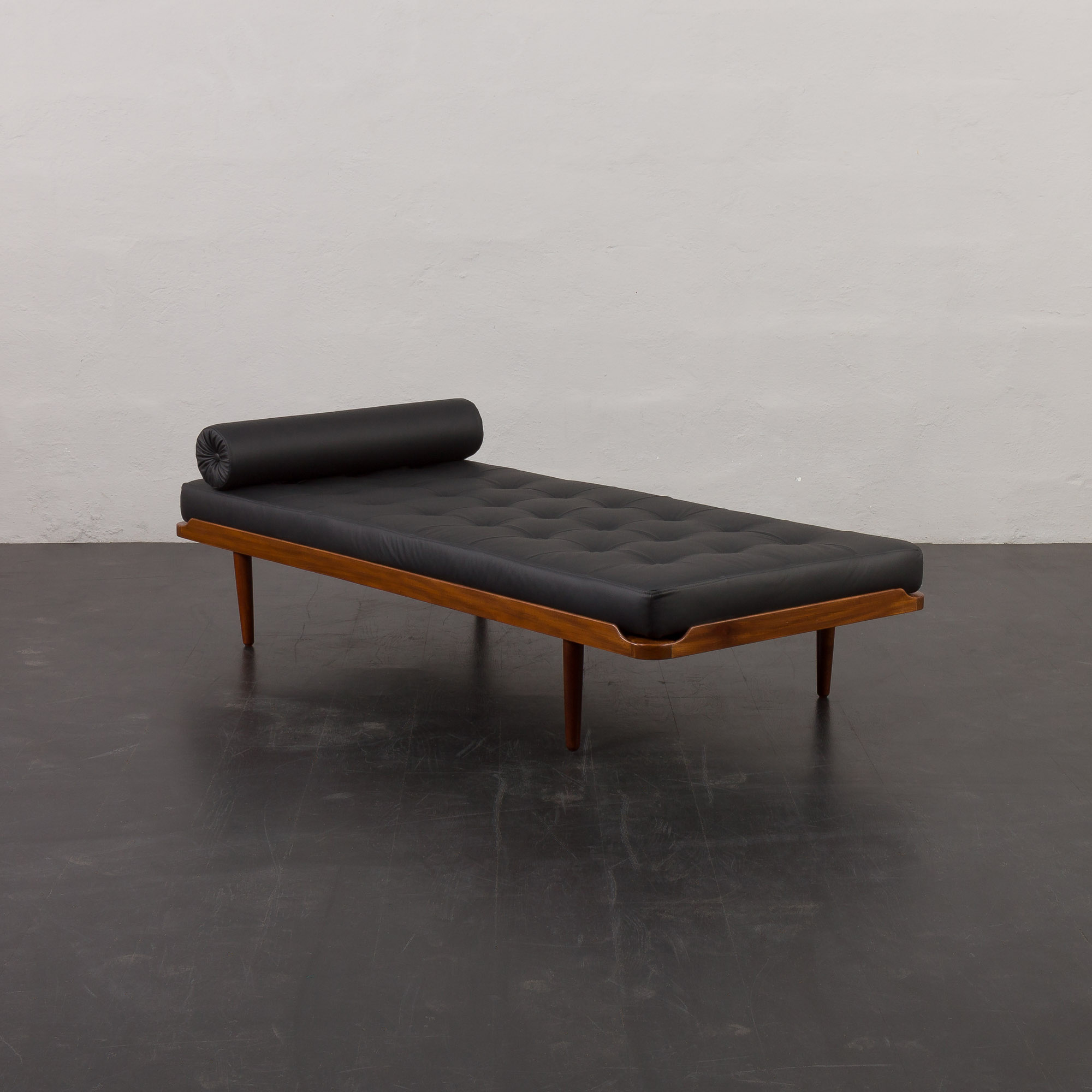 Mid-century solid teak daybed made in Denmark in the 1960s. It closely relates to Ejvind A. Johansson’s “G19” project from the same period. The daybed features a solid teak frame and a quilted mattress in black leather with new foam inside, along with a decorative bolster, adding an elegant touch to the piece. It showcases high-quality craftsmanship, ensuring comfort for relaxation.