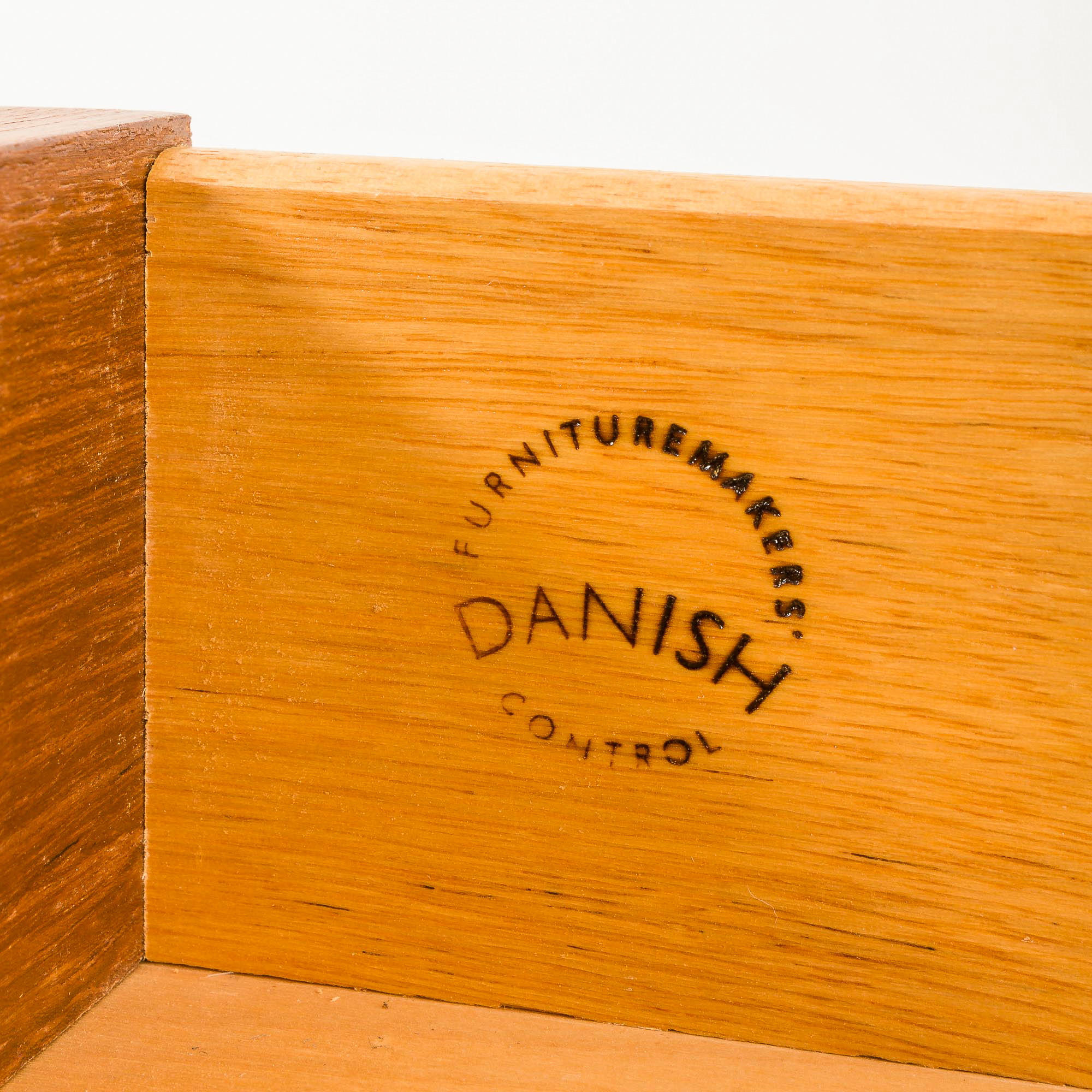 A charming pair of teak bedside tables made in Denmark in the 1960s will add a unique mid-century touch to any bedroom. Crafted with precision and attention to detail, evident in the nicely carved handles of the drawers. They can be placed in a bedroom or a living room, adding elegance and a mid-century vibe. Sleek, tapered legs give lightness to the furniture and emphasize the Scandinavian origin. Three smoothly working drawers ensure there is eough space for your items. The nightstands have been fully restored, and the wood has been protected with layers of Danish oil. There is famous Danish quality control emblem that was reserved for the highest qulity furniture made in Denmark in the mid 20th century.
