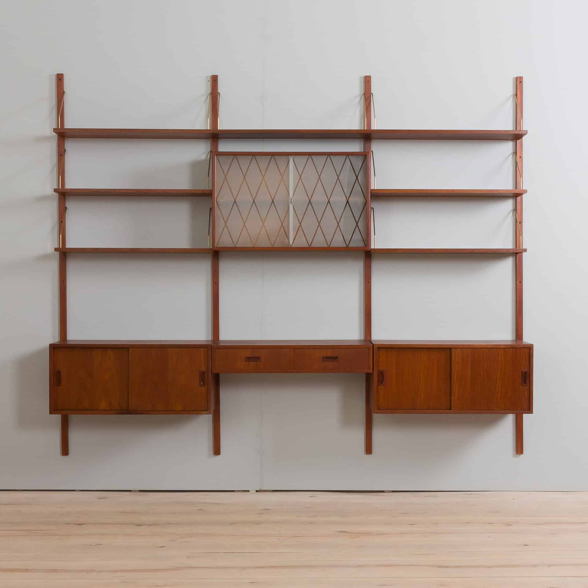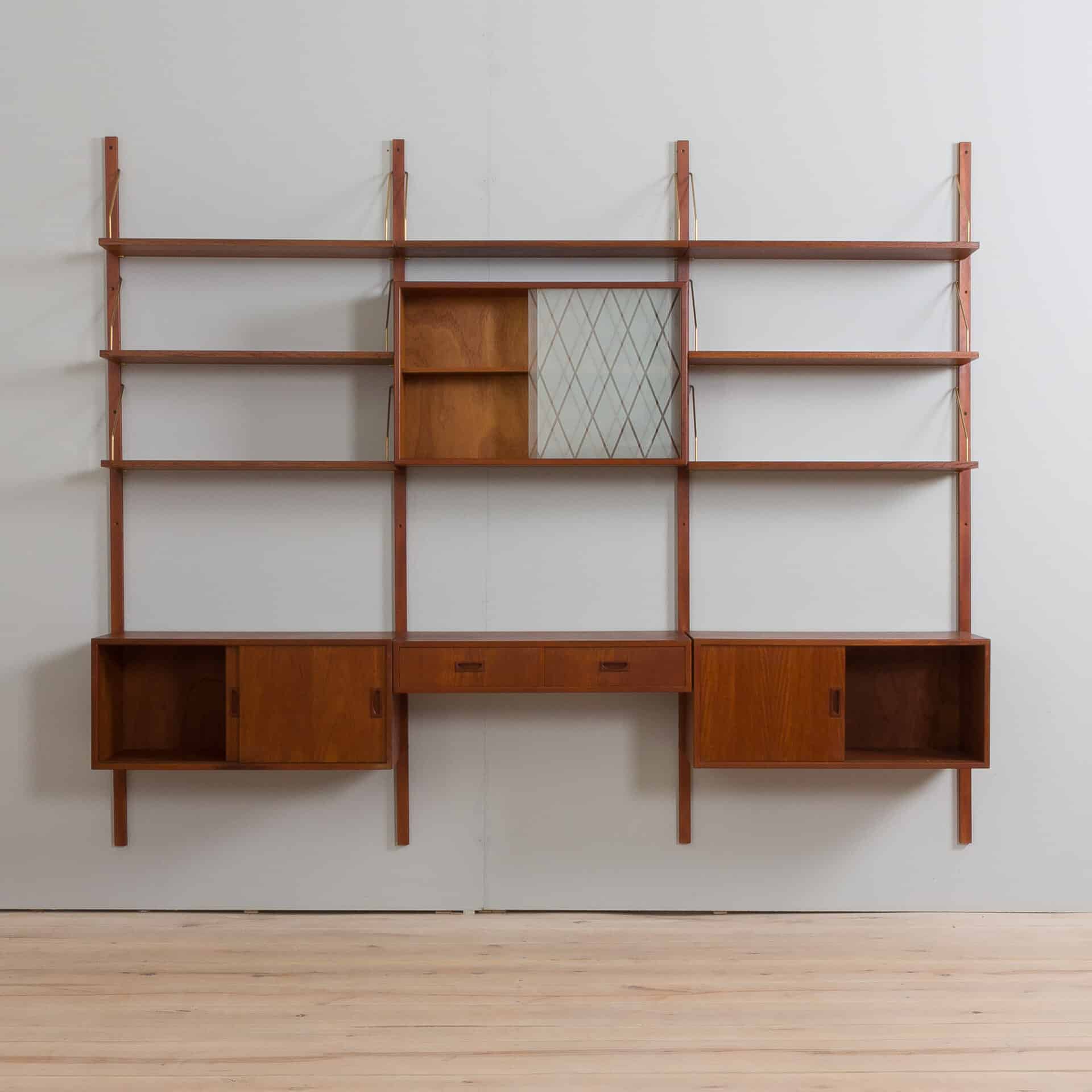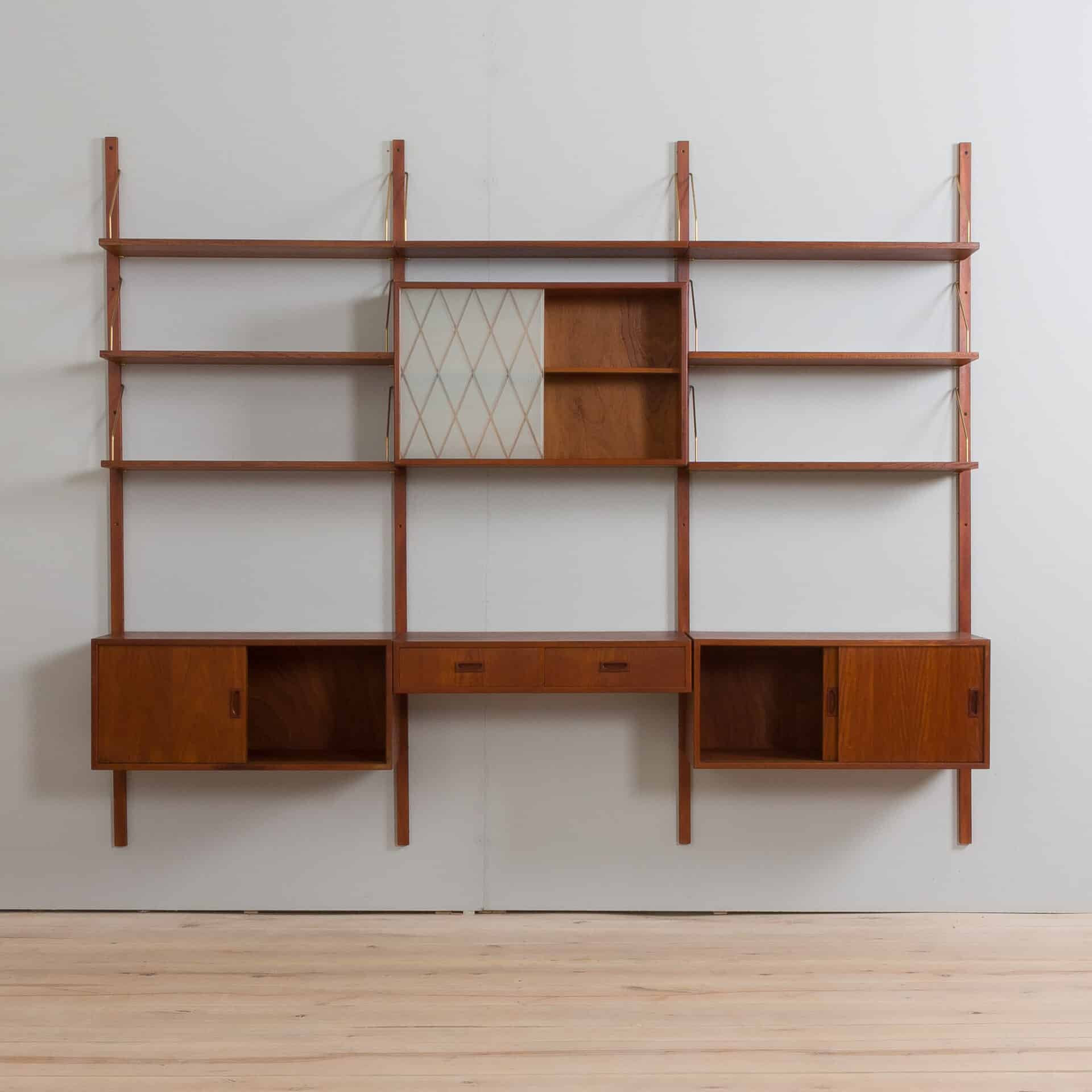 Danish mid century modern teak 3-bay wall unit made in the 1960s reminds famous design of Preben Sorensen, Kai Kristiansen or Poul Cadovius. It is a fully modular shelving system with interchangeable parts that can be arranged upon one’s needs. Two cabinets and seven shelves provide just enough space for storage and expose a lot of books and decorations, and a small desk or a console with two drawers can help to set up a home office.