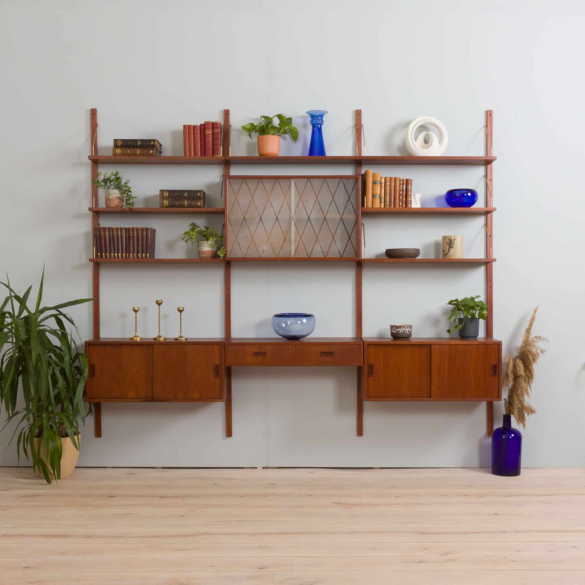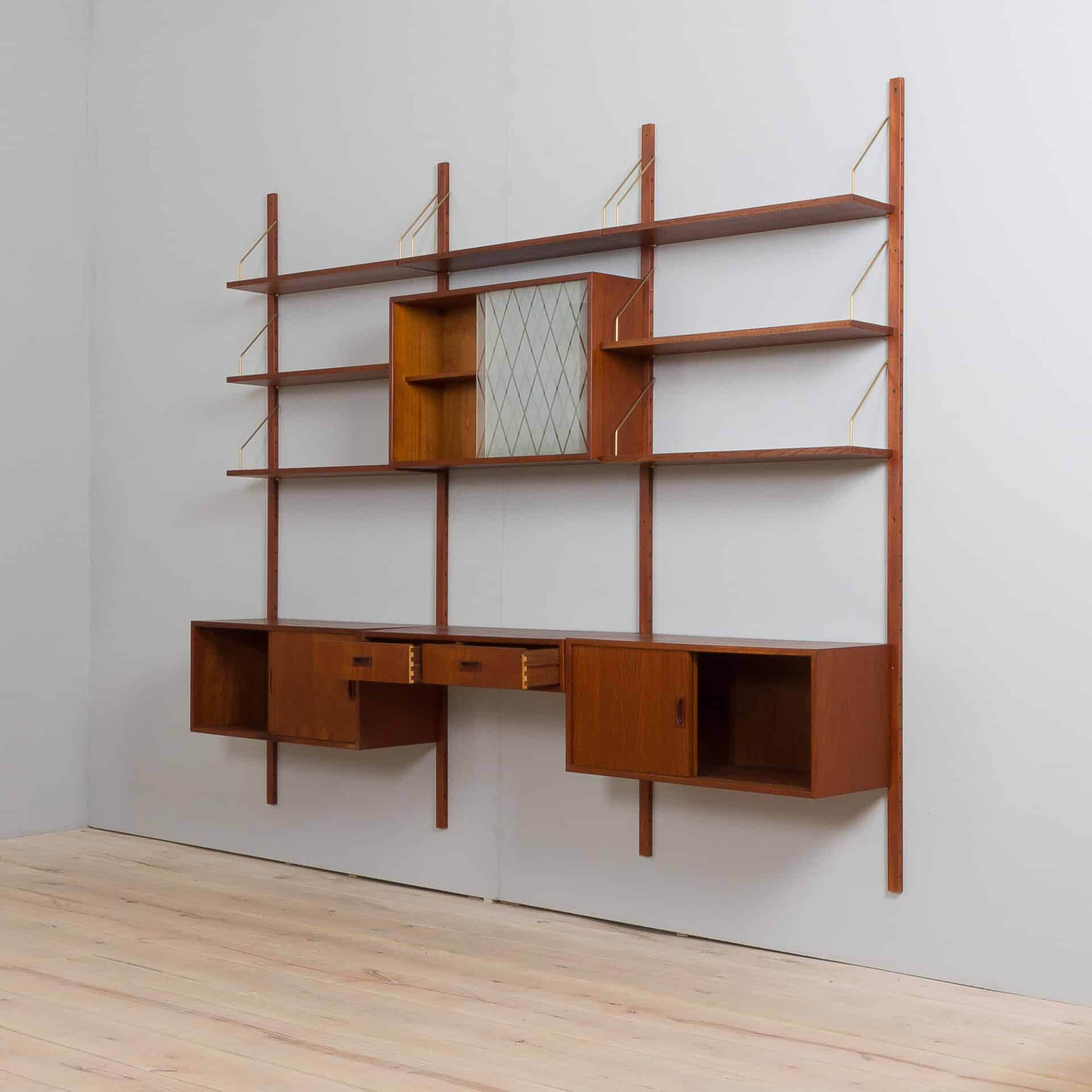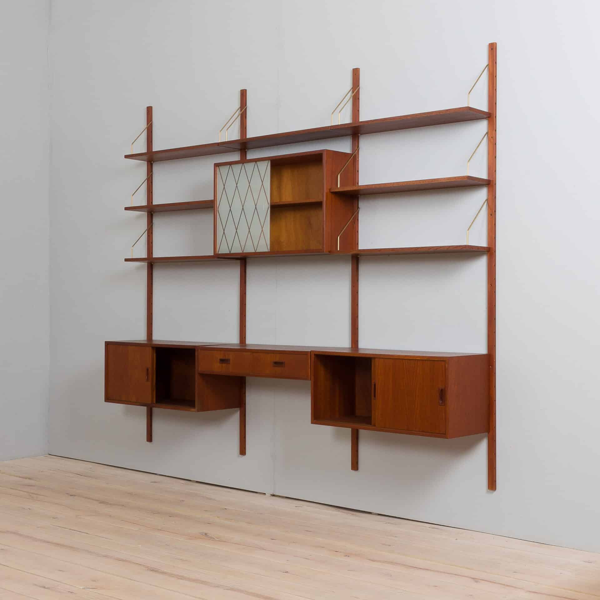 Danish mid century modern teak 3-bay wall unit made in the 1960s reminds famous design of Preben Sorensen, Kai Kristiansen or Poul Cadovius. It is a fully modular shelving system with interchangeable parts that can be arranged upon one’s needs. Two cabinets and seven shelves provide just enough space for storage and expose a lot of books and decorations, and a small desk or a console with two drawers can help to set up a home office.