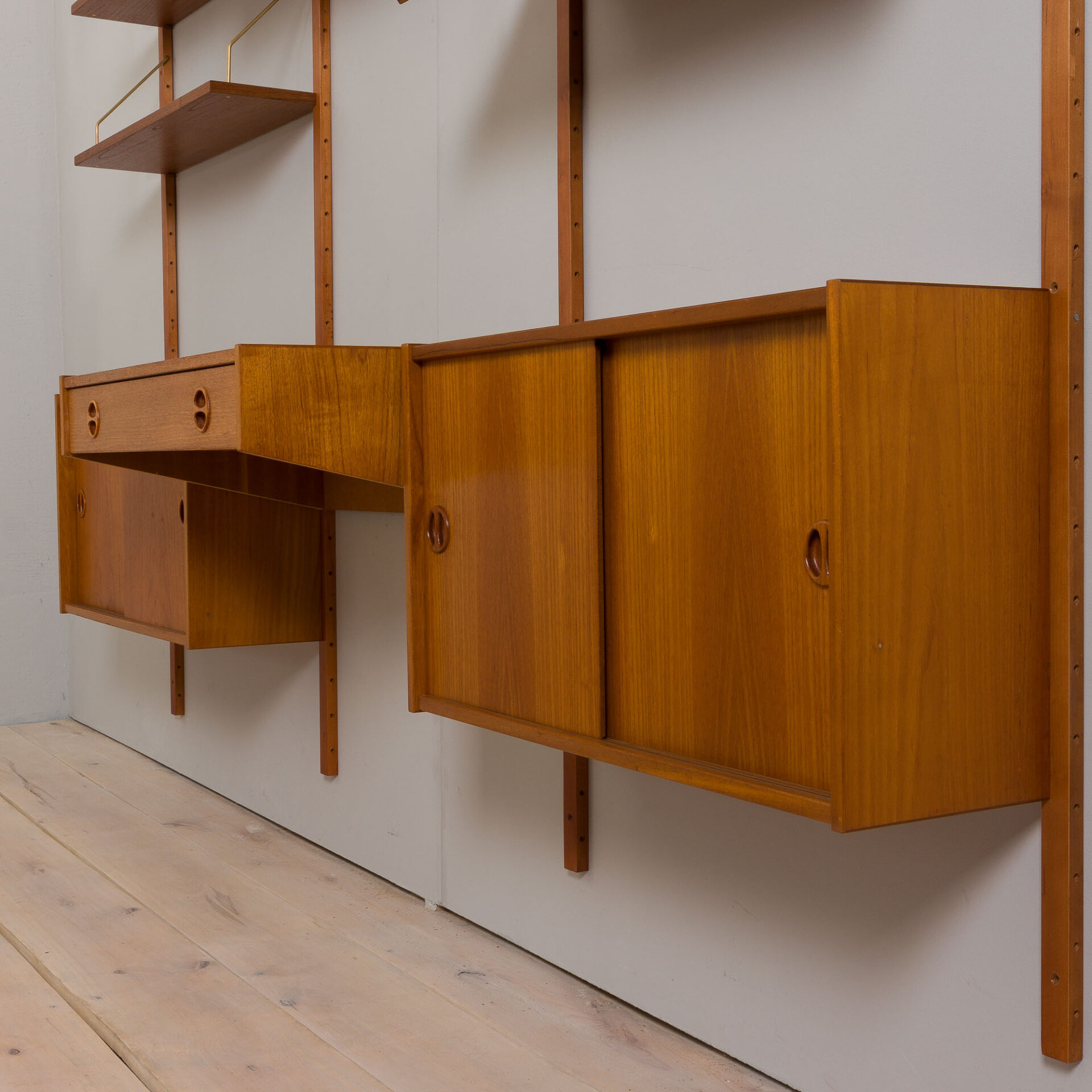 Three-bay teak wall unit in the style of Poul Cadovius made in Denmark in the 1960s. This entirely modular shelving system is ideal for a home office, as the compact desk will allow you to work even in the living room. Three cabinets and four shelves will provide enough space for storage and exposing books and decorations. Each component is 80cm wide and can be arranged at ones will.