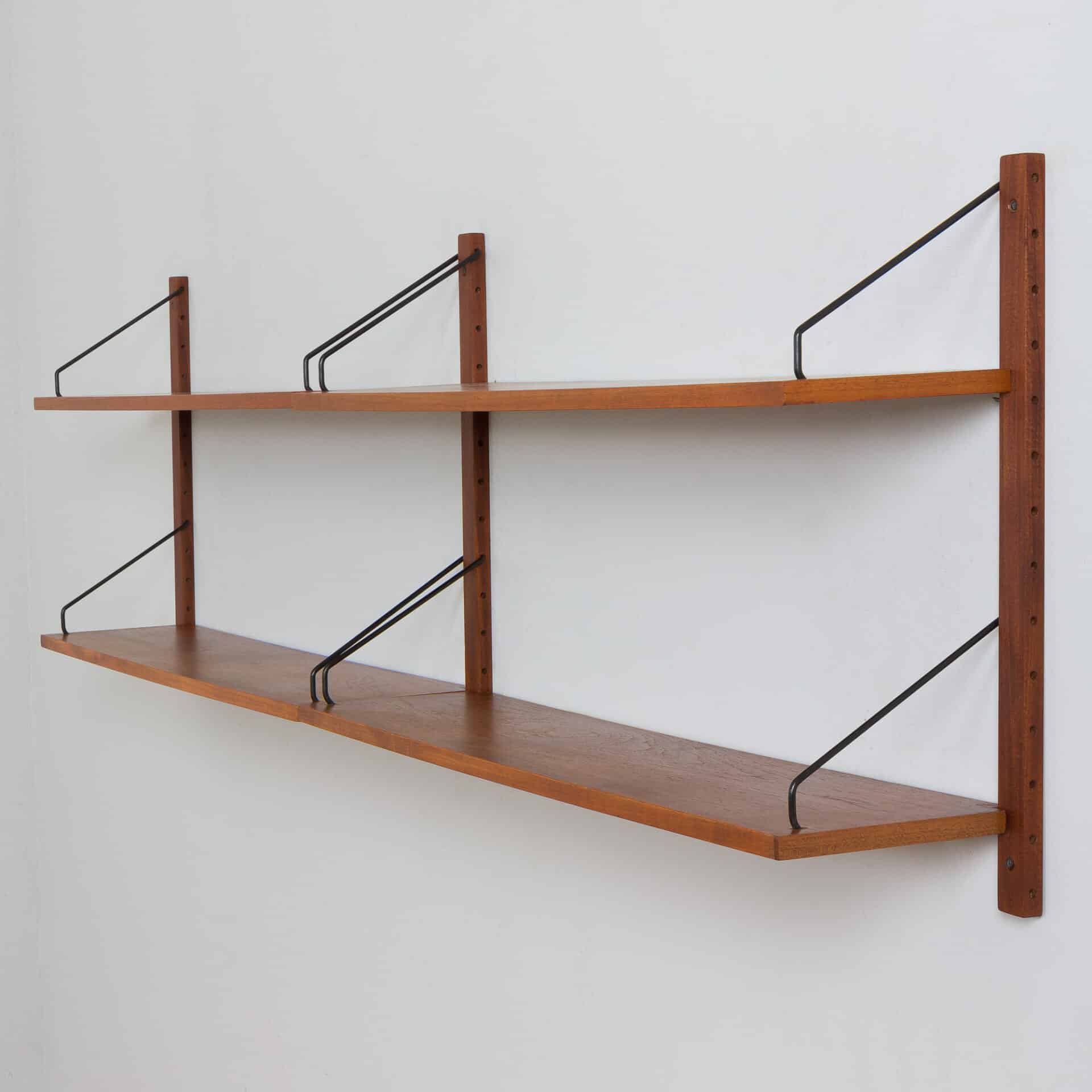 Rare Danish wall unit designed by Poul Cadovius from the 1960s. The shelves are 100cm wide, whereas usually they have been 80cm. It is a modular shelving system with four shelves in teak wood and rare black painted metal hangers, which can be arranged as required. This set consists of:
